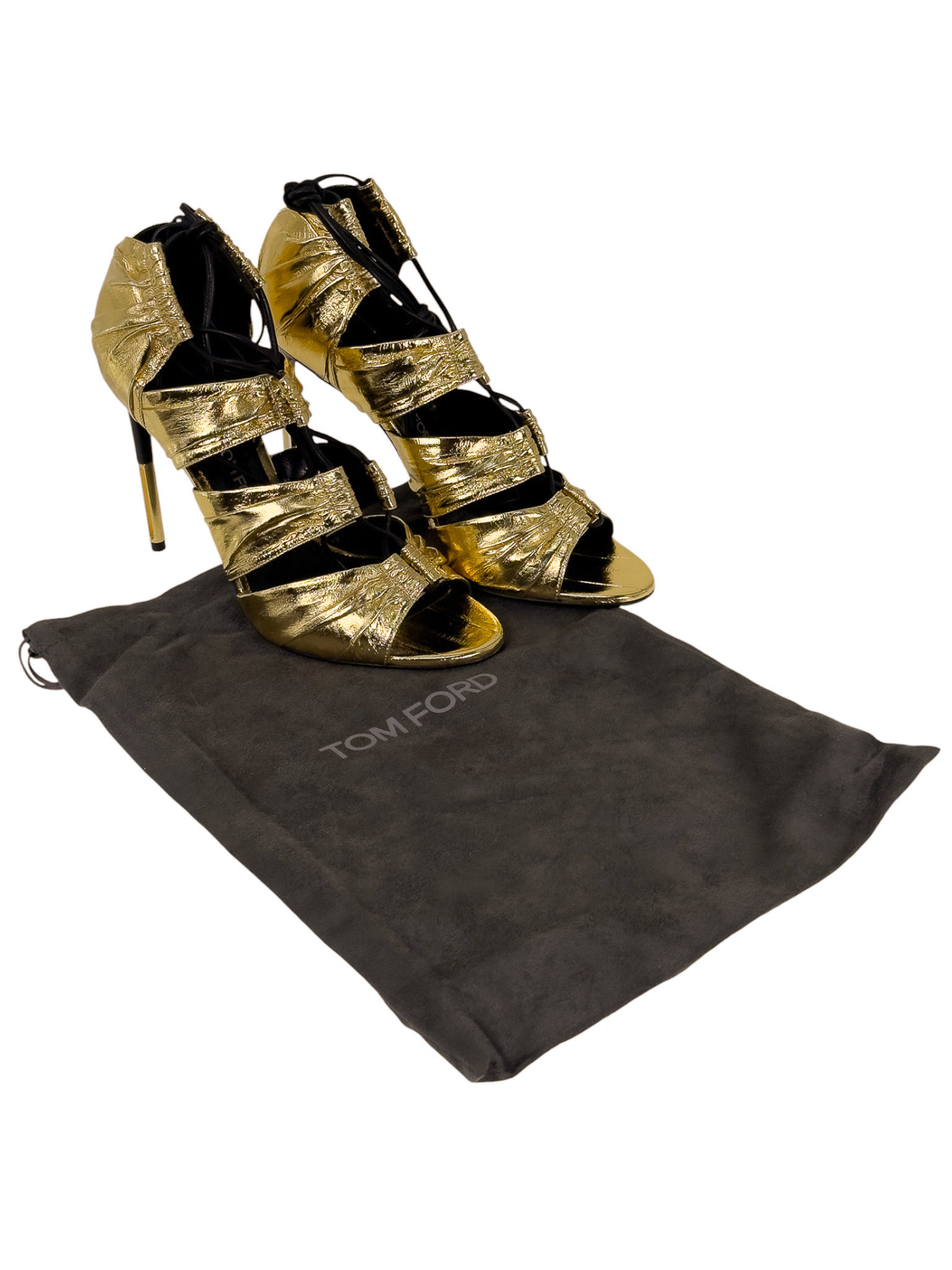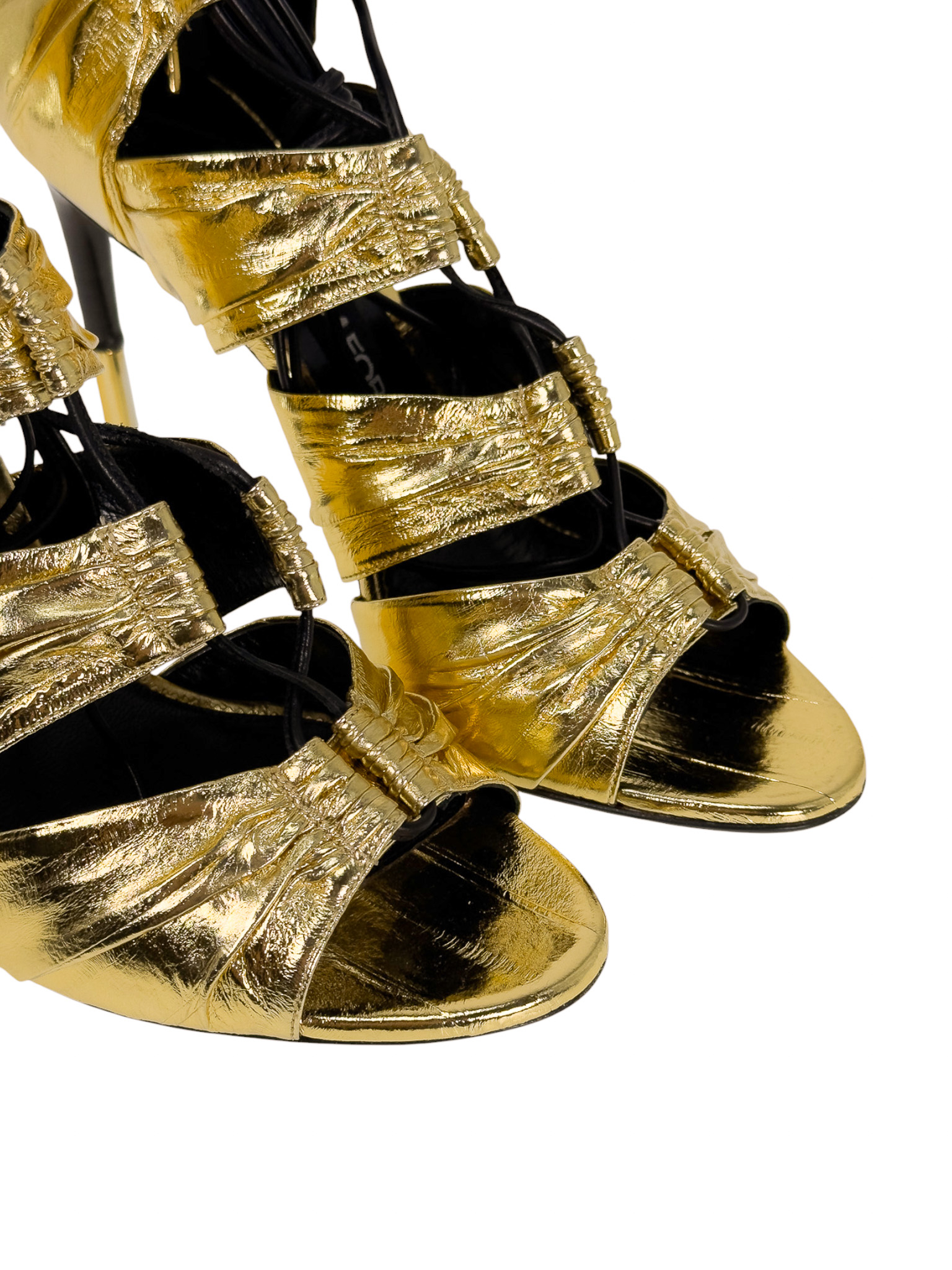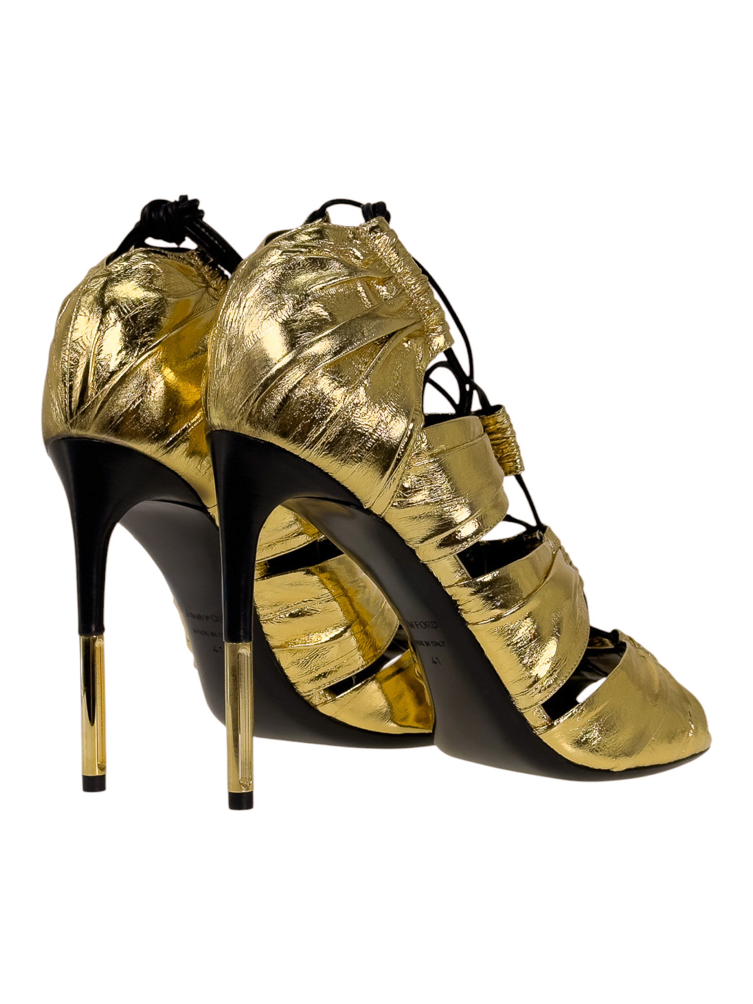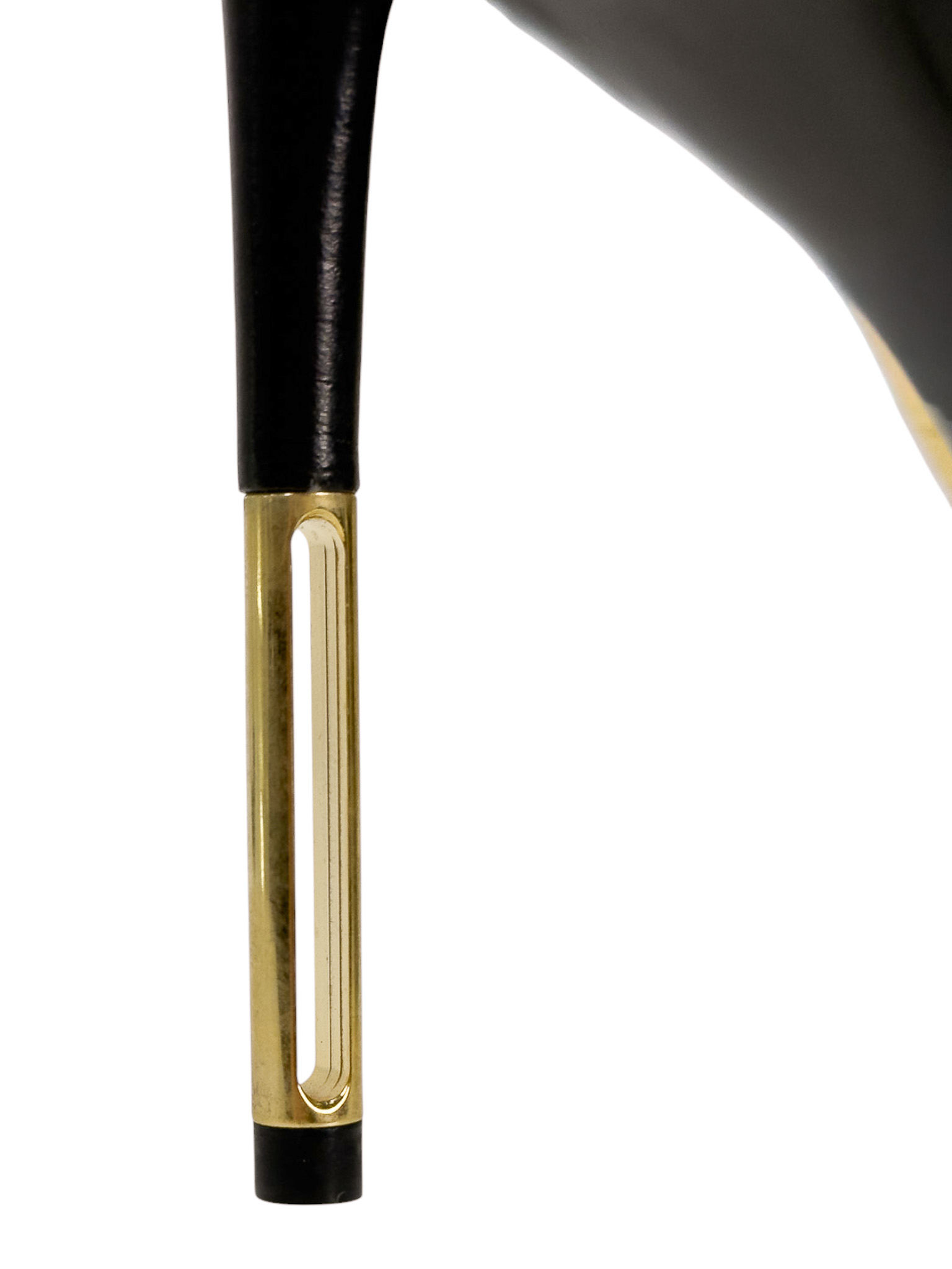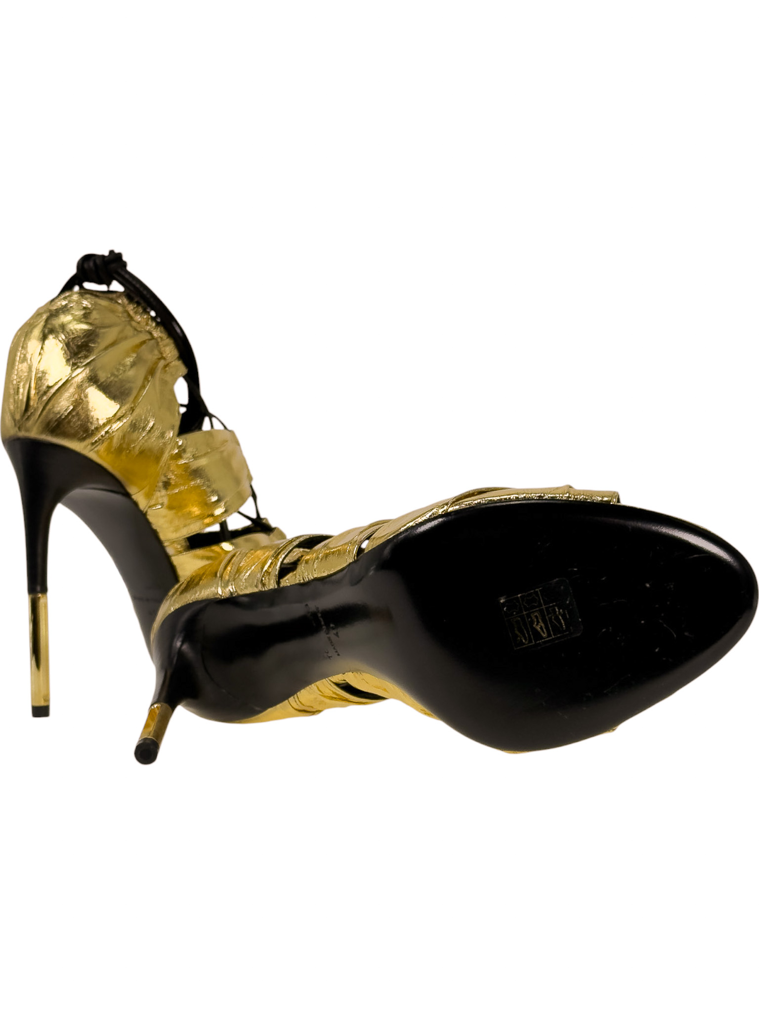 "Złoto-czarne skórzane buty na obcasie wykończone marszczeniem, ozdobne wycięcia, migdałowe noski, czarne wiązanie wokół kostki, odkryte palce, wkładka z logo, w zestawie z pudełkiem. Stan nowe. Rozmiar 41."