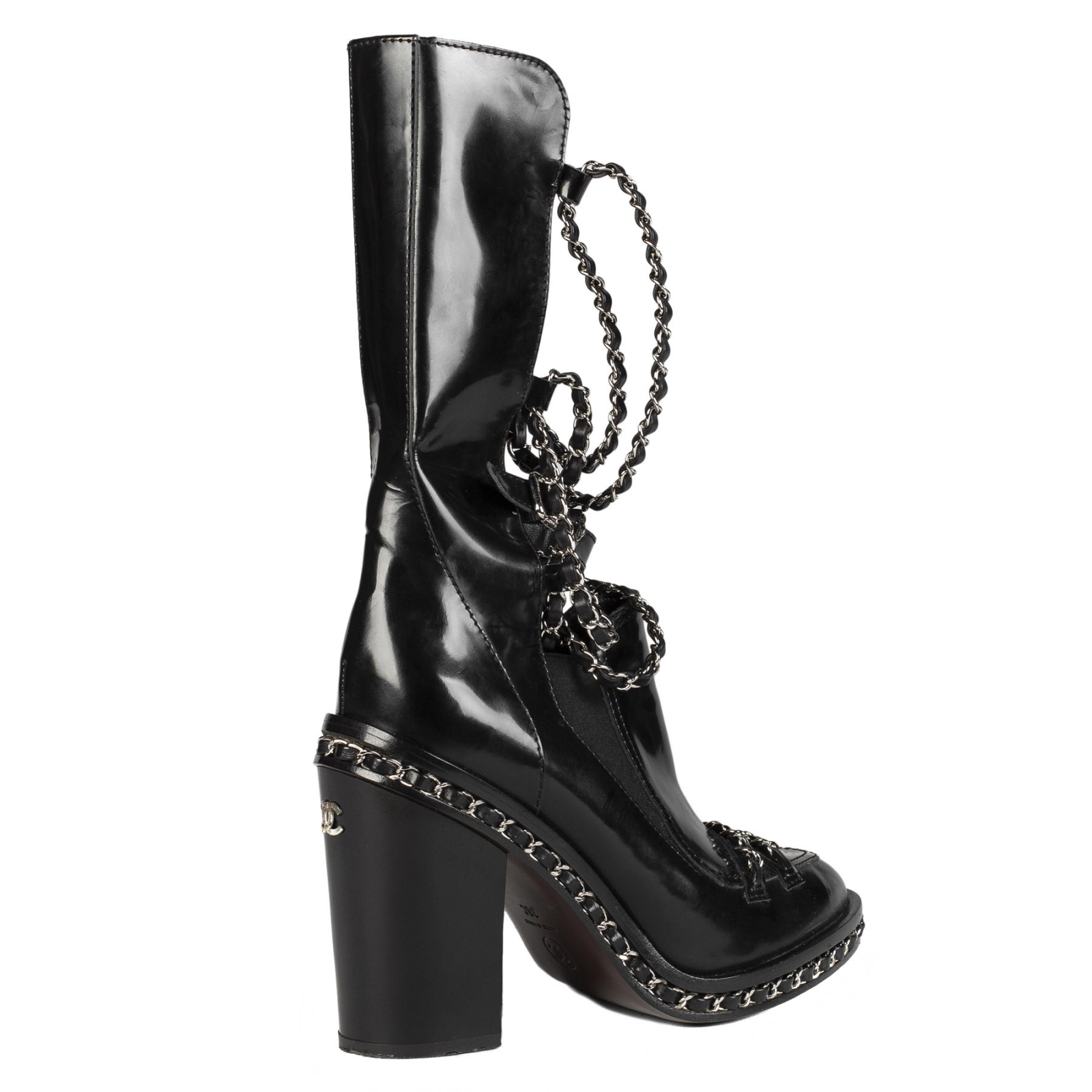 "Czarne lakierowane botki na słupku, platforma ze srebrbnym przeplatanym skórą łańcuchem, boki na gumkę, po całej długości cholewki łańcuch, rozmiar 38C, Black Patent Leather CC Runway Glazed Chain Obsession Block Heel, cena okolo 3560 usd. Wysokość obcasów 9,5 cm."