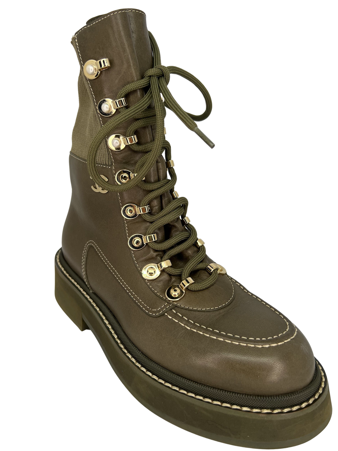 "botki khaki w formie traperów, wiązane na przodzie, jasne przeszycia. Logo od zewnętrznej strony. Rozmiar 36,5. Pudełko w komplecie"
