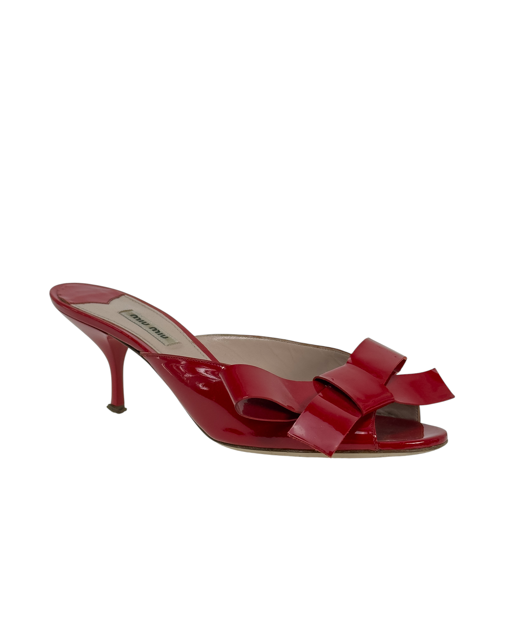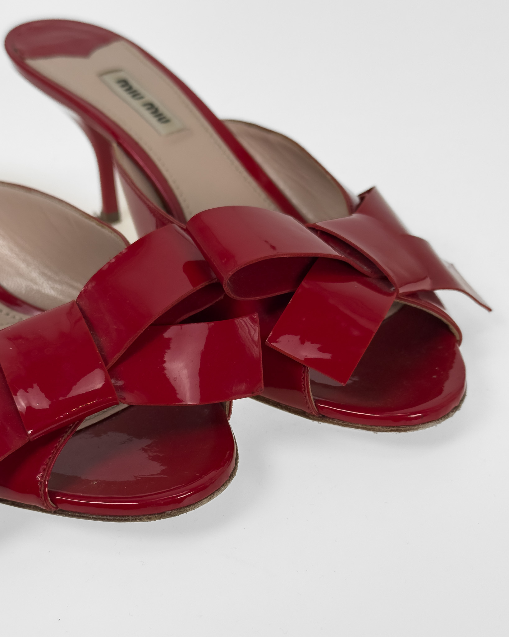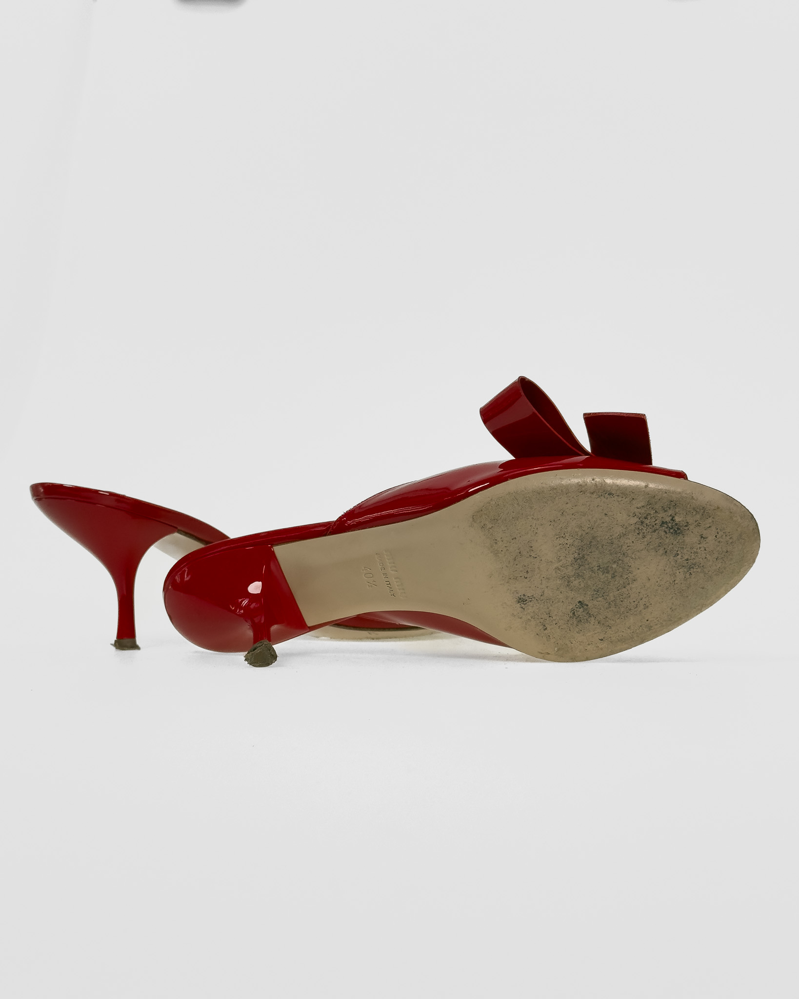 "Czerwone klapki na obcasie wykonane z lakierowanej skóry, migdałowe noski, ozdobione dużą kokardą, obcas kaczuszka, cielista skórzana wkładka. Stan dobry, posiadają przetarcia na flekach, zadrapania na skórze. Rozmiar 40,5."