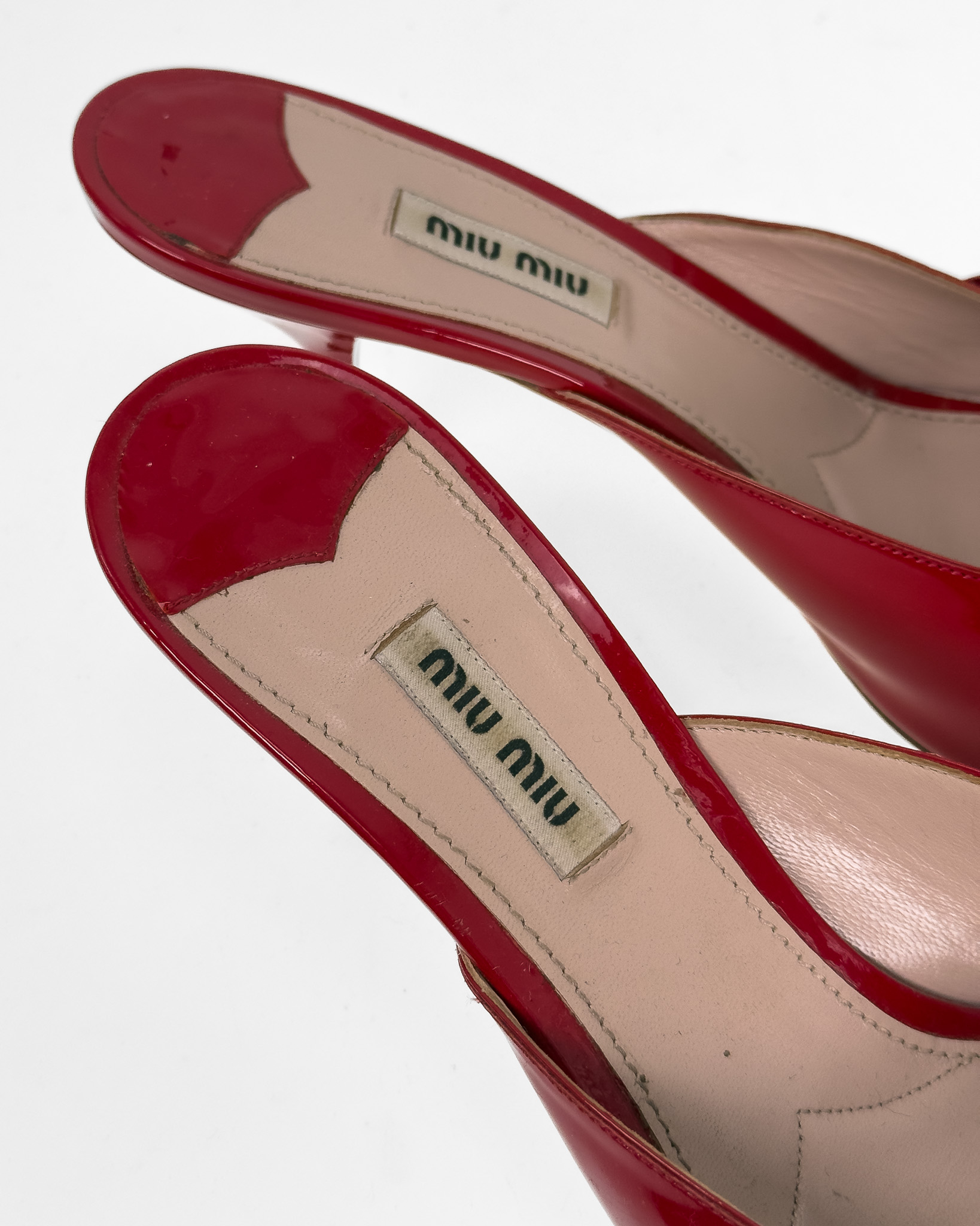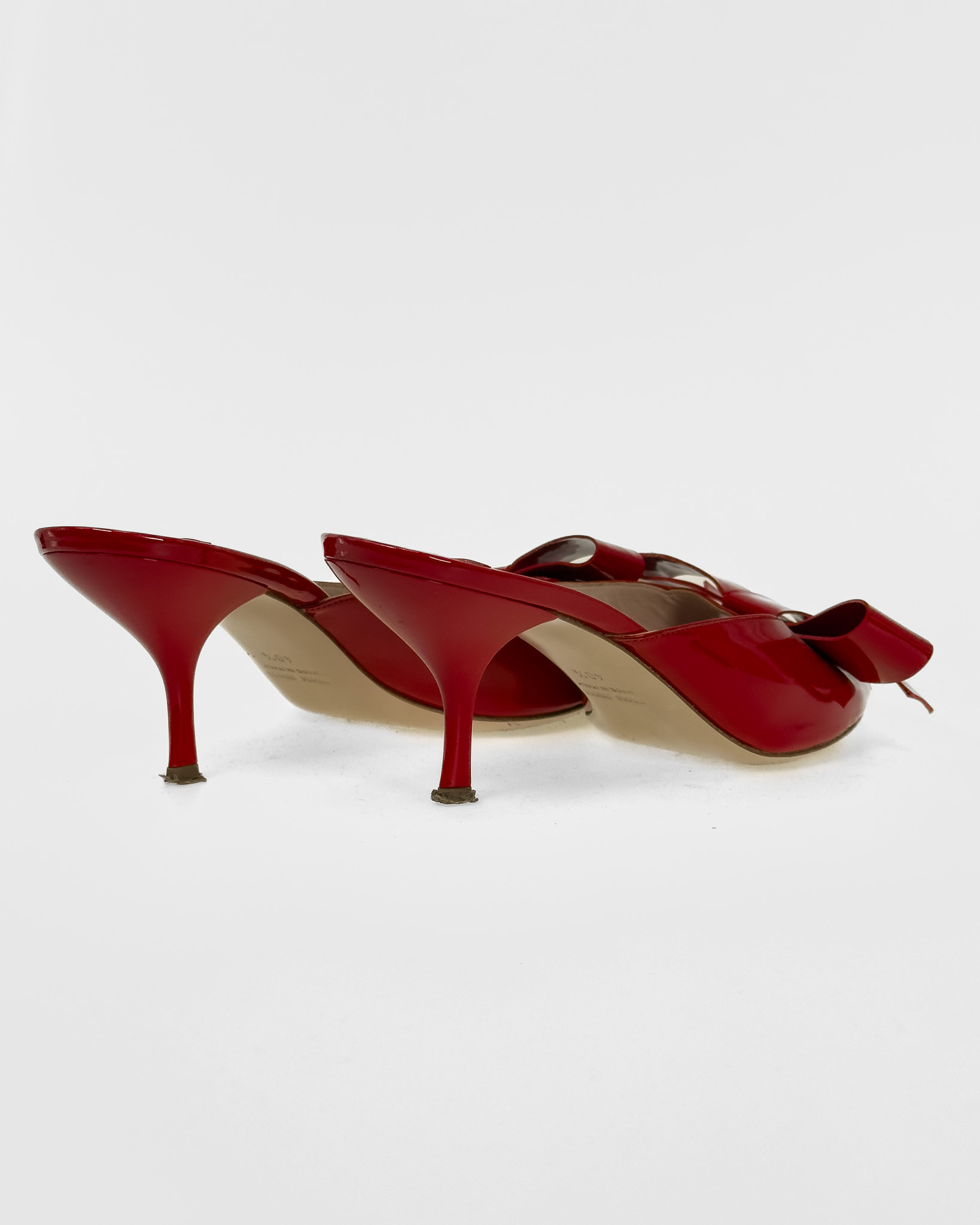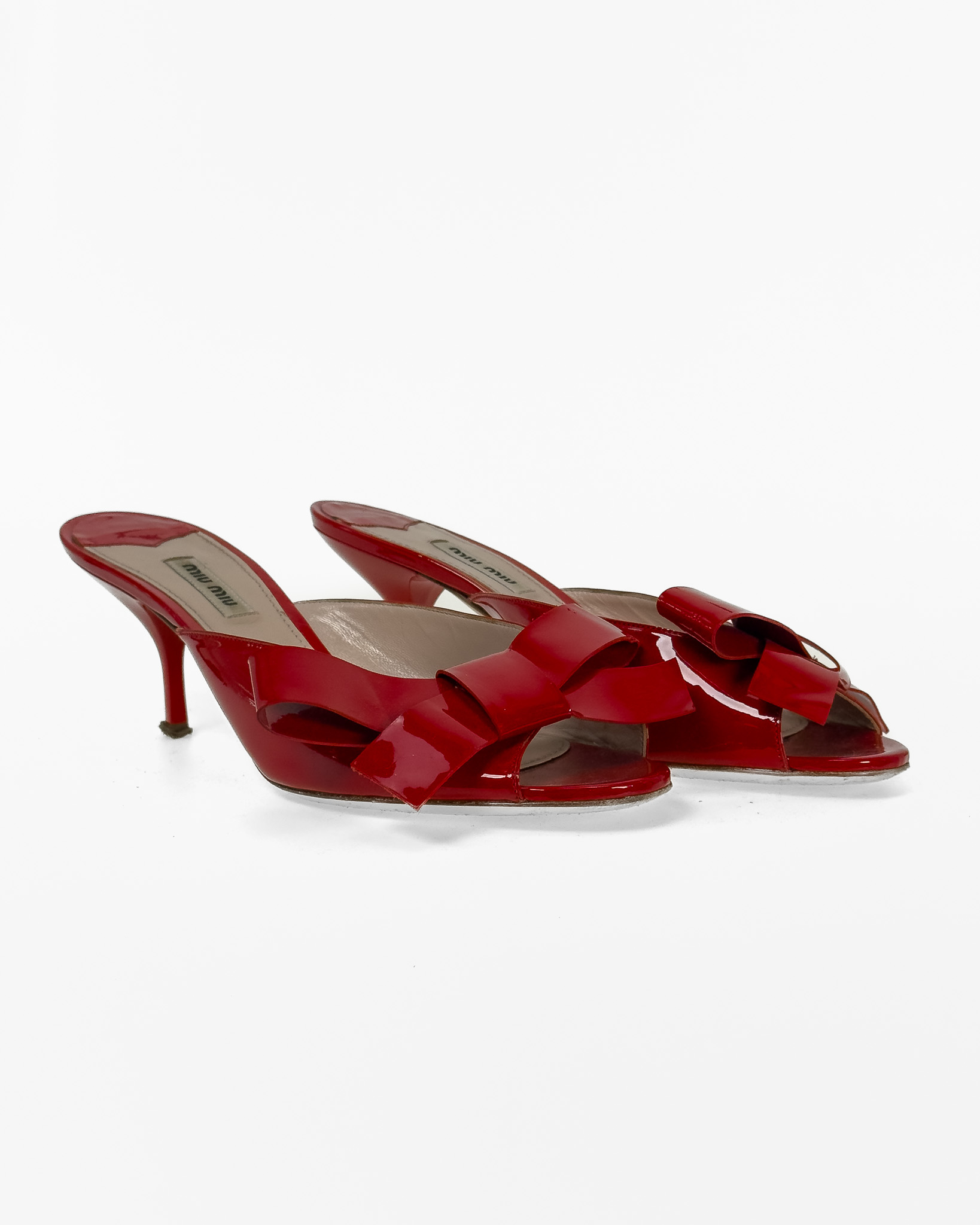 "Czerwone klapki na obcasie wykonane z lakierowanej skóry, migdałowe noski, ozdobione dużą kokardą, obcas kaczuszka, cielista skórzana wkładka. Stan dobry, posiadają przetarcia na flekach, zadrapania na skórze. Rozmiar 40,5."