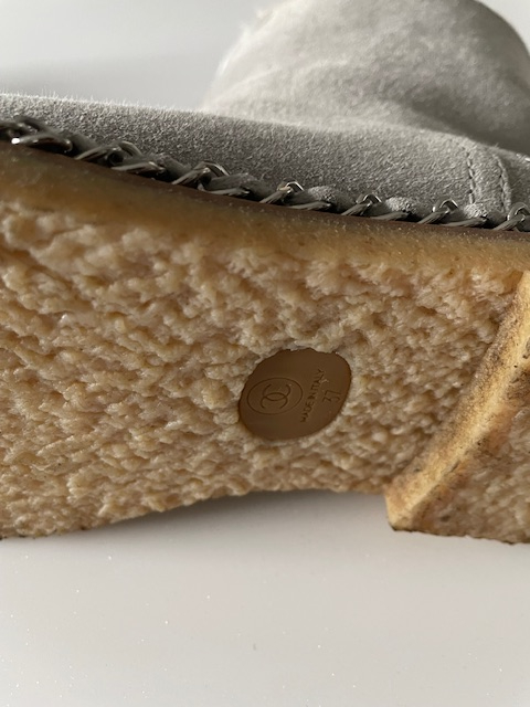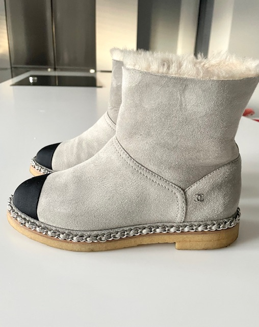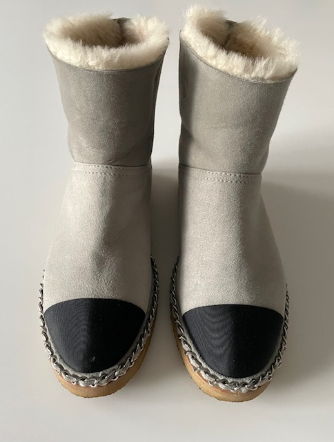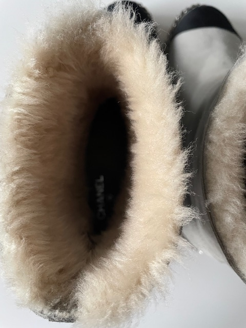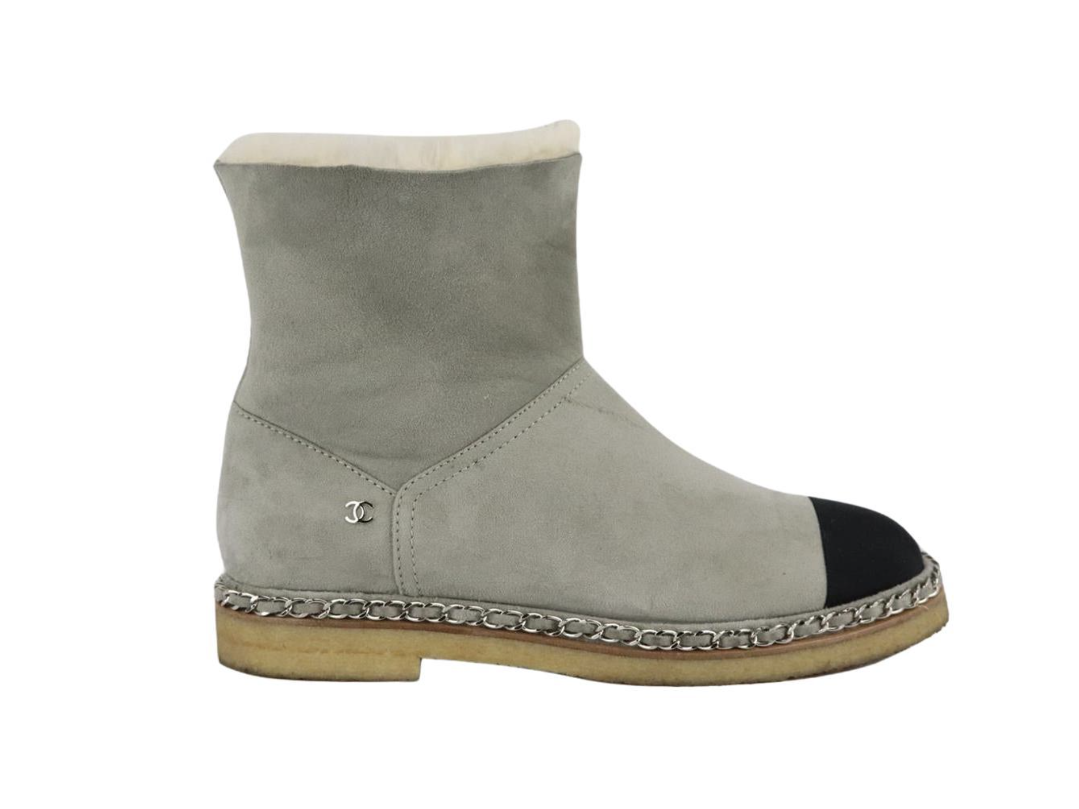 "Botki chanel wykonane ze skóry zamszowej z grubym futrem. Kolor srebrnoszary z czarnym charakterystycznym dla marki noskiem oraz łańcuszkiem wokół podeszwy. Bardzo wygodne, lekkie i ciepłe. Rozmiar 37 - wypadają typowo. Stan Idealny - założone raz."