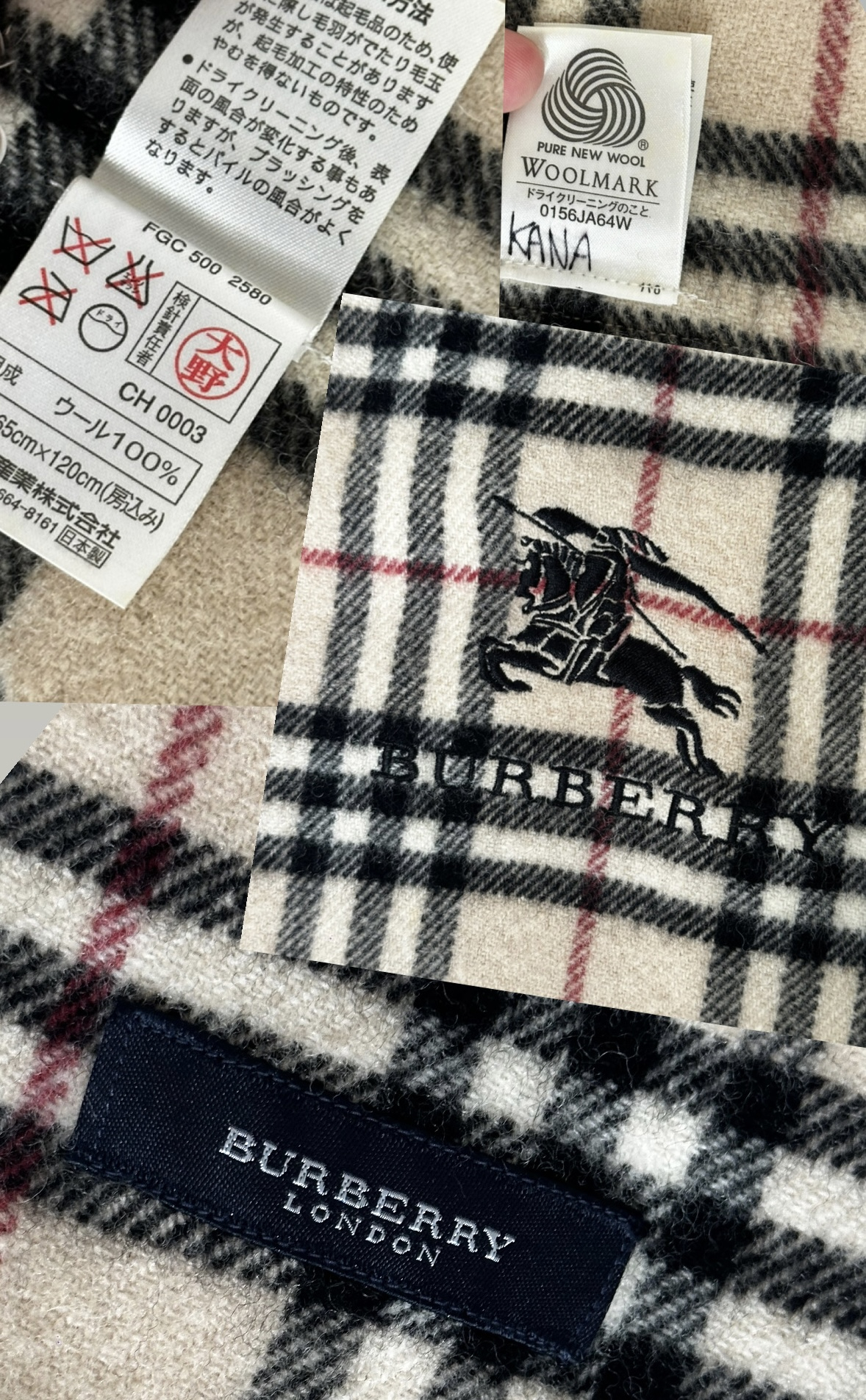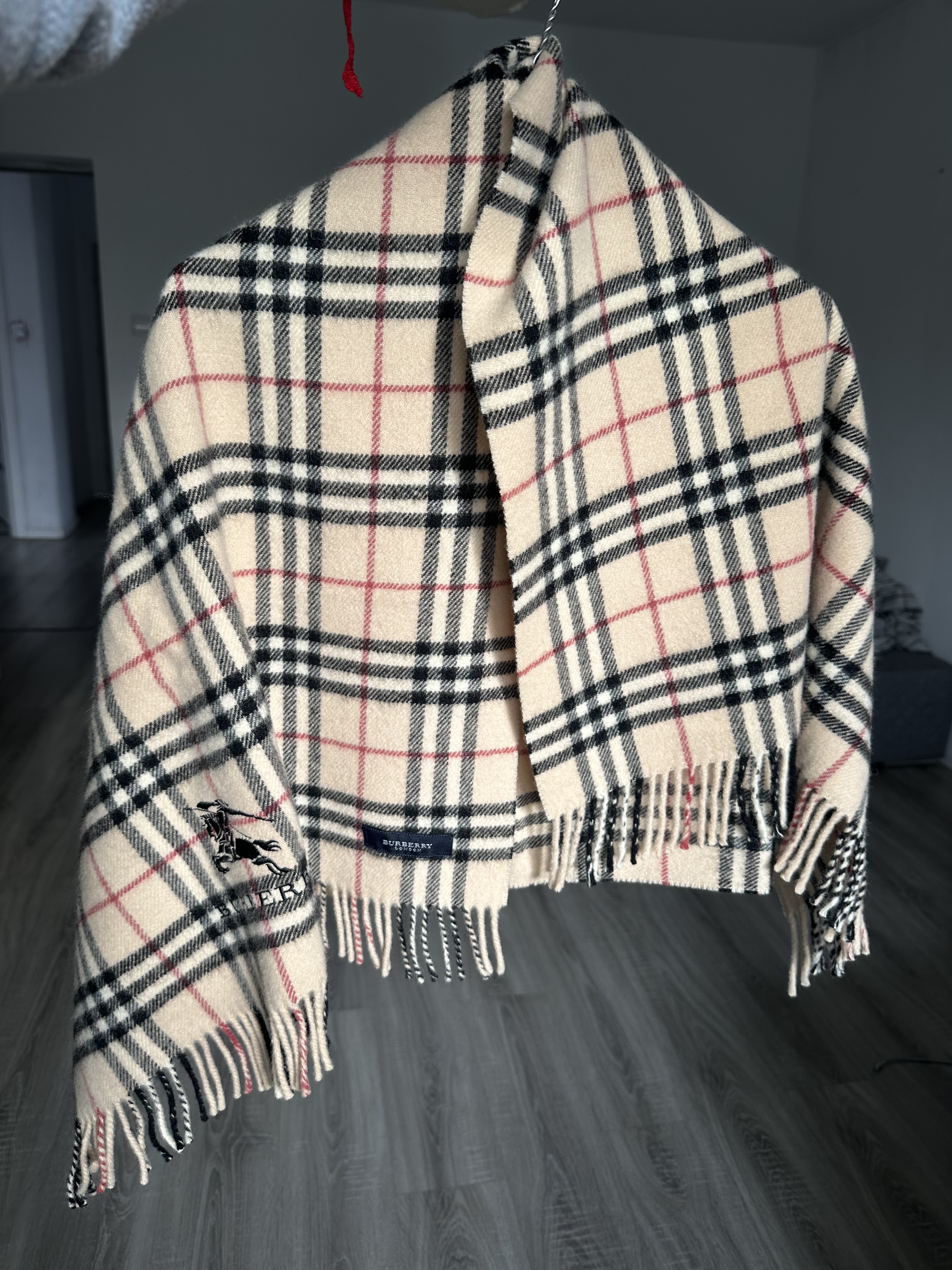 Stan: B.Dobry. Chusta jest zadbana, bez widocznych defektów, dziur czy plam. Uwaga dotycząca metki: Na jednej z metek (Woolmark) znajduje się podpis – jest on umieszczony na metce składu, a nie na głównej metce Burberry. Prawdopodobnie jest możliwy do zmycia.