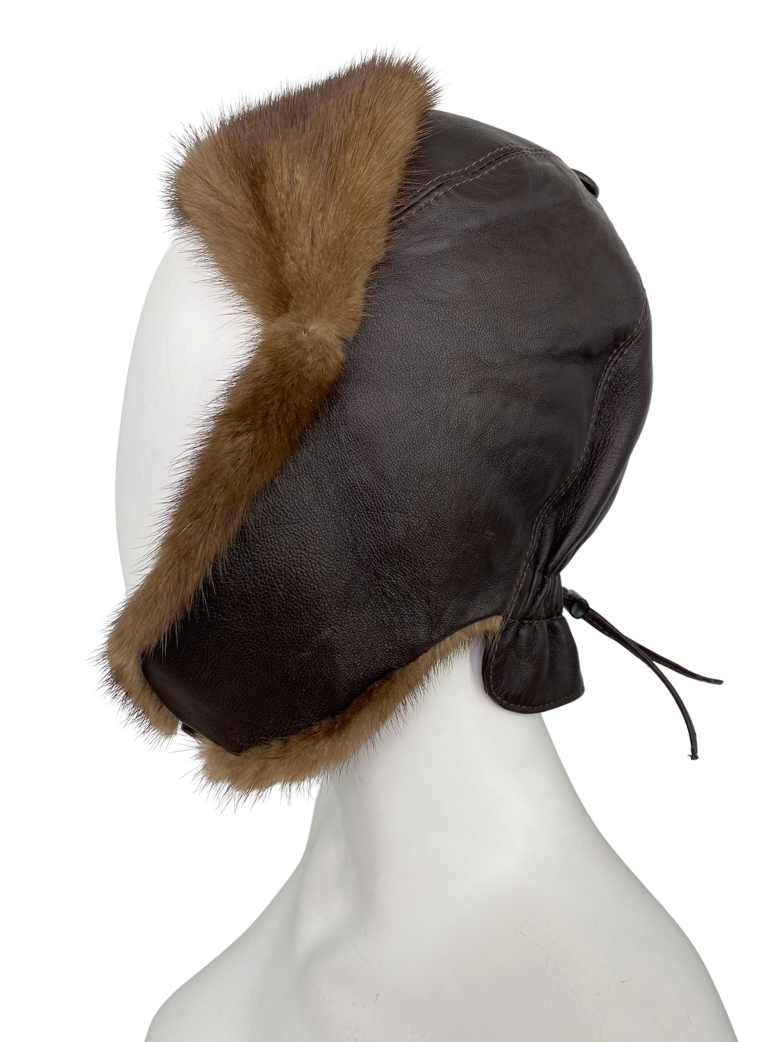 "brązowa czapka pilotka, skórzana, obszyta brązowym futrem z przodu i przy nausznikach, zapinana na zatrzaski, z tyłu ściągacz, szara podszewka."