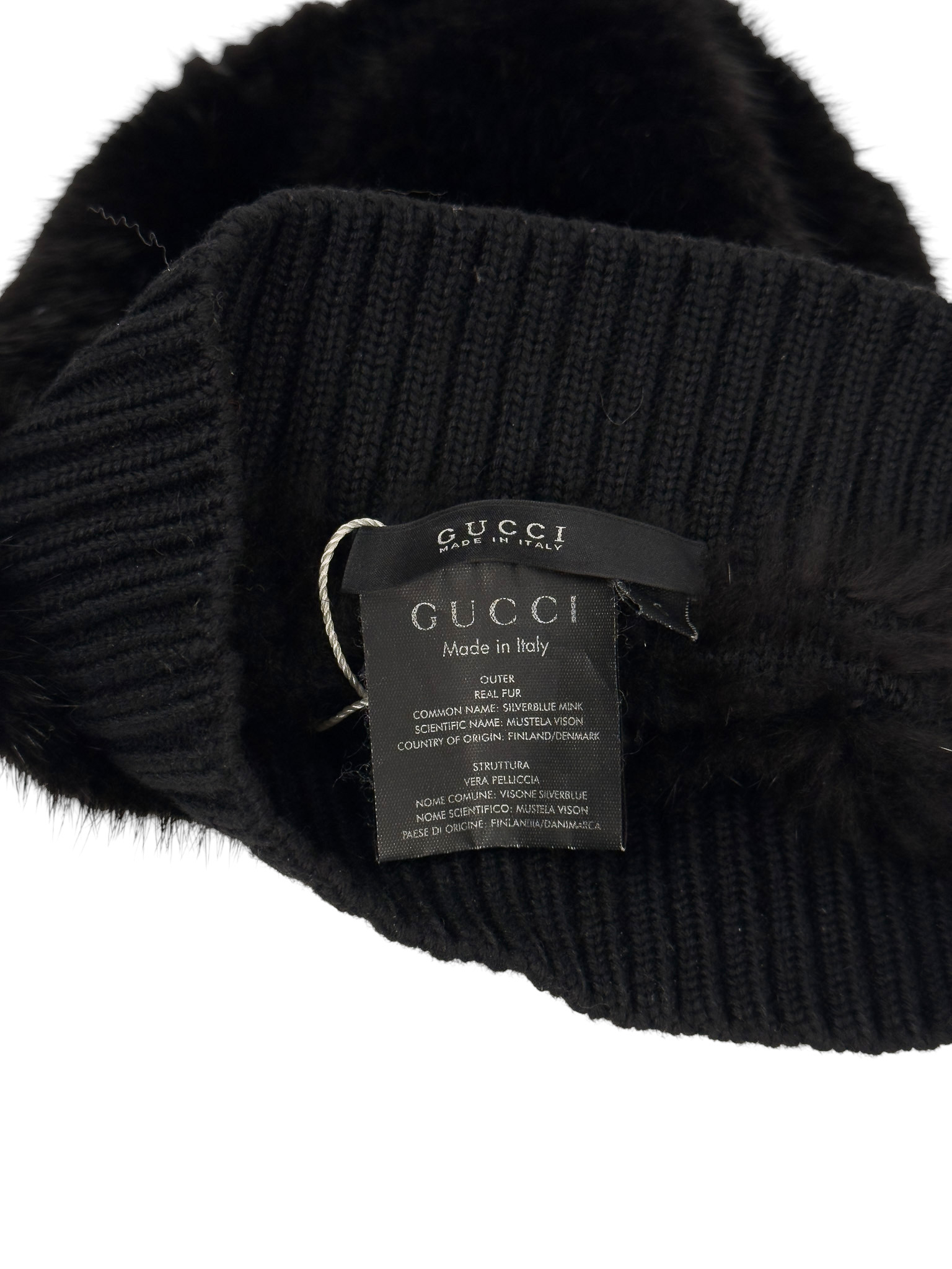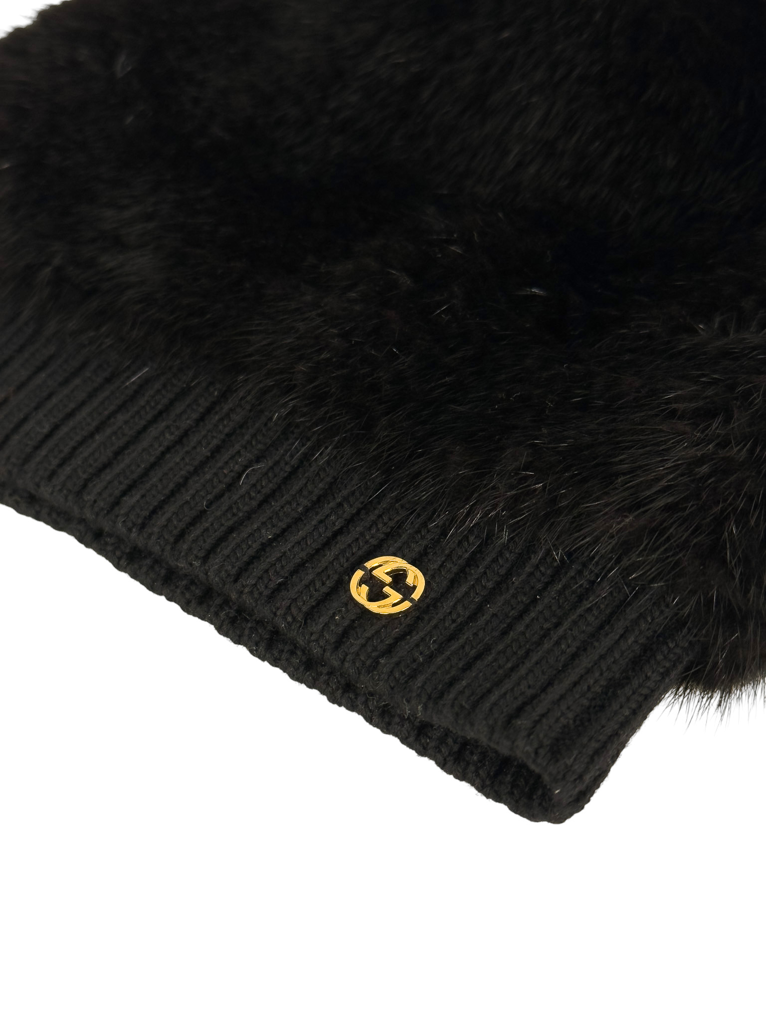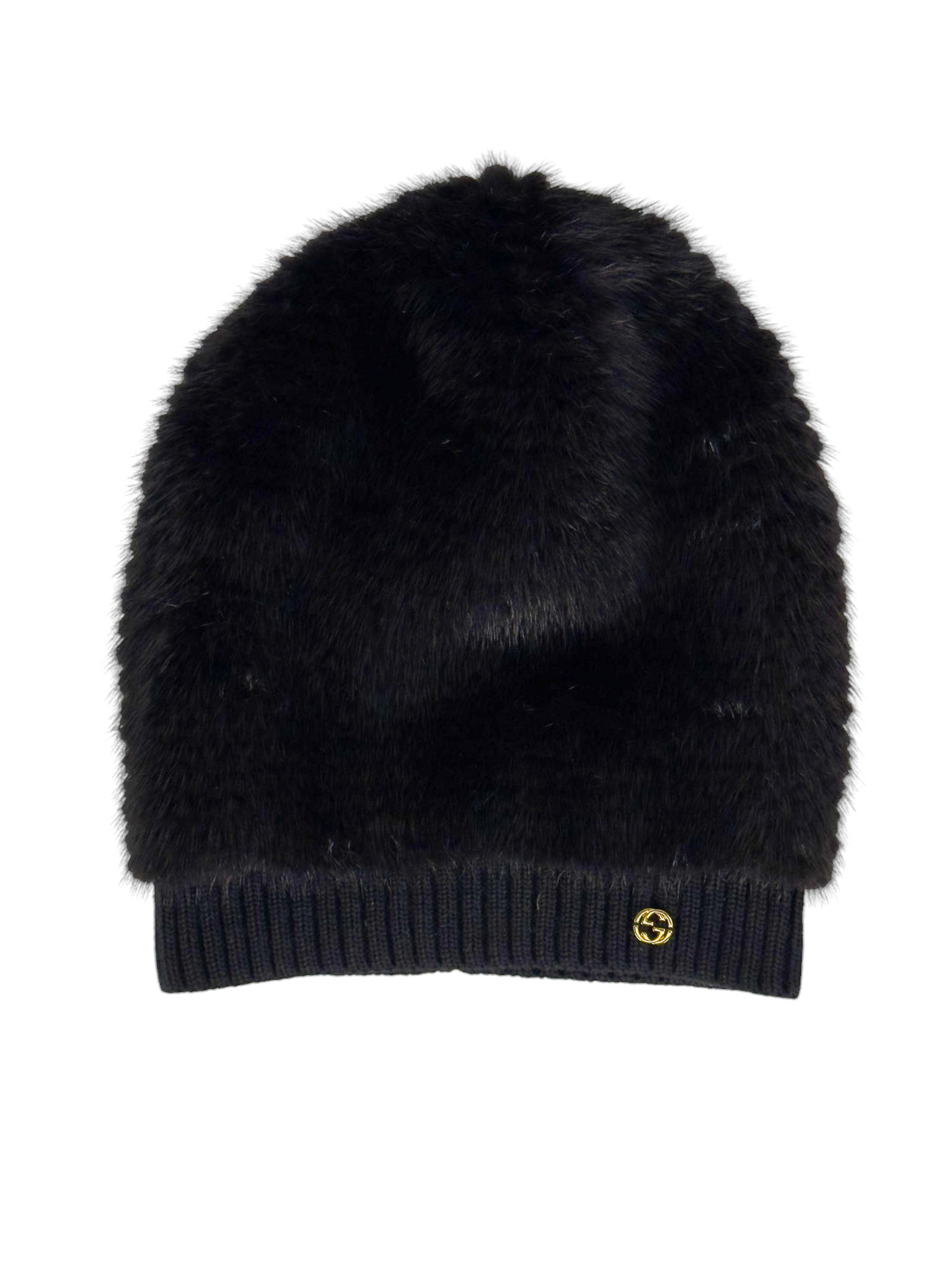 "Czarna, futrzana czapka. Delikatne, złote logowanie w rogu czapki. Wykończona prążkowanym ściągaczem. Rozmiar z metki S. Pudełko w komplecie. Stan: bardzo dobry."