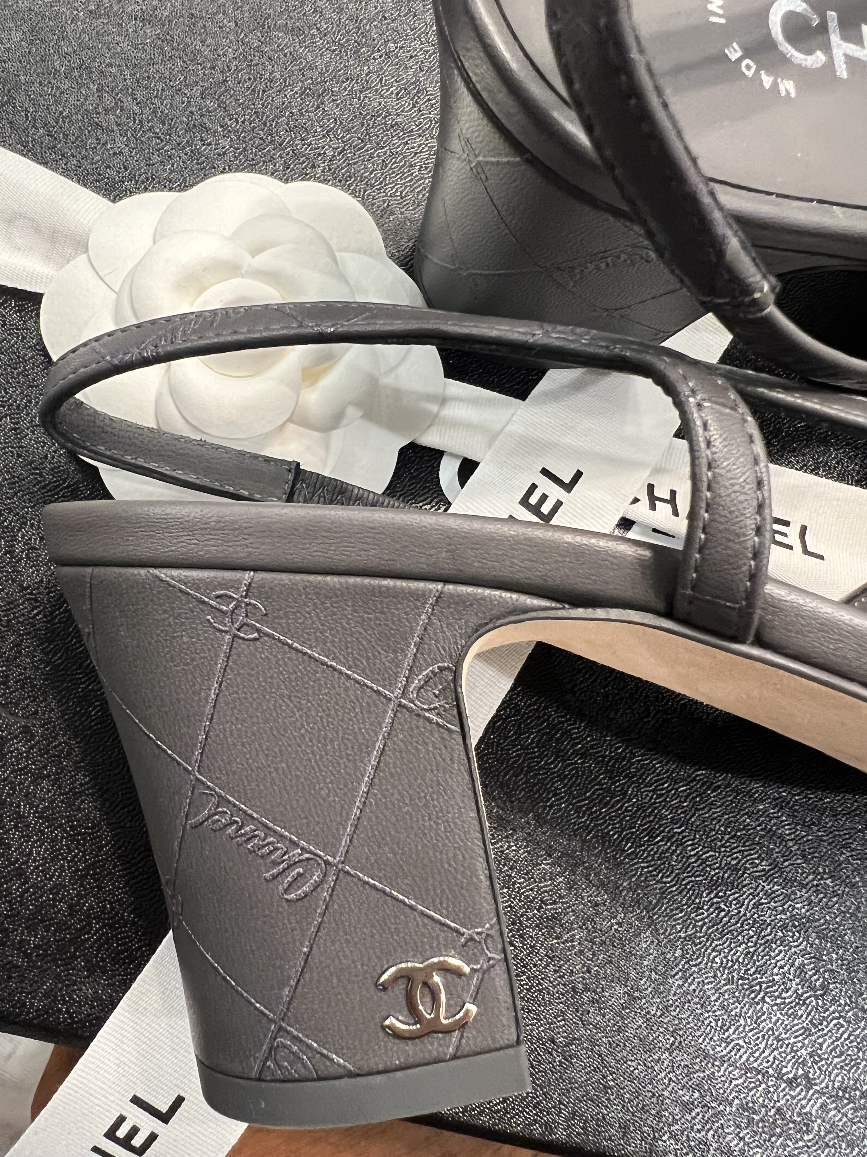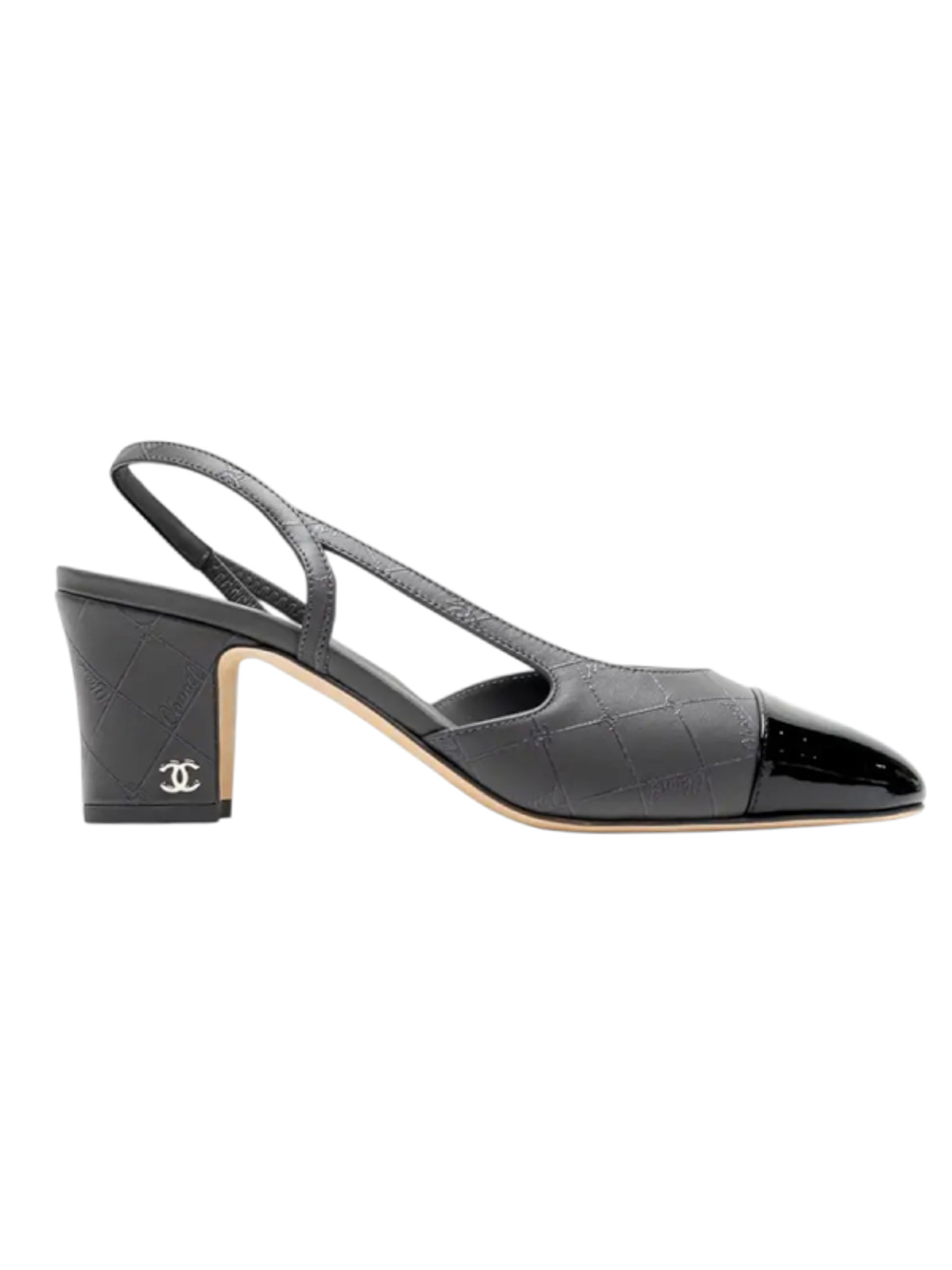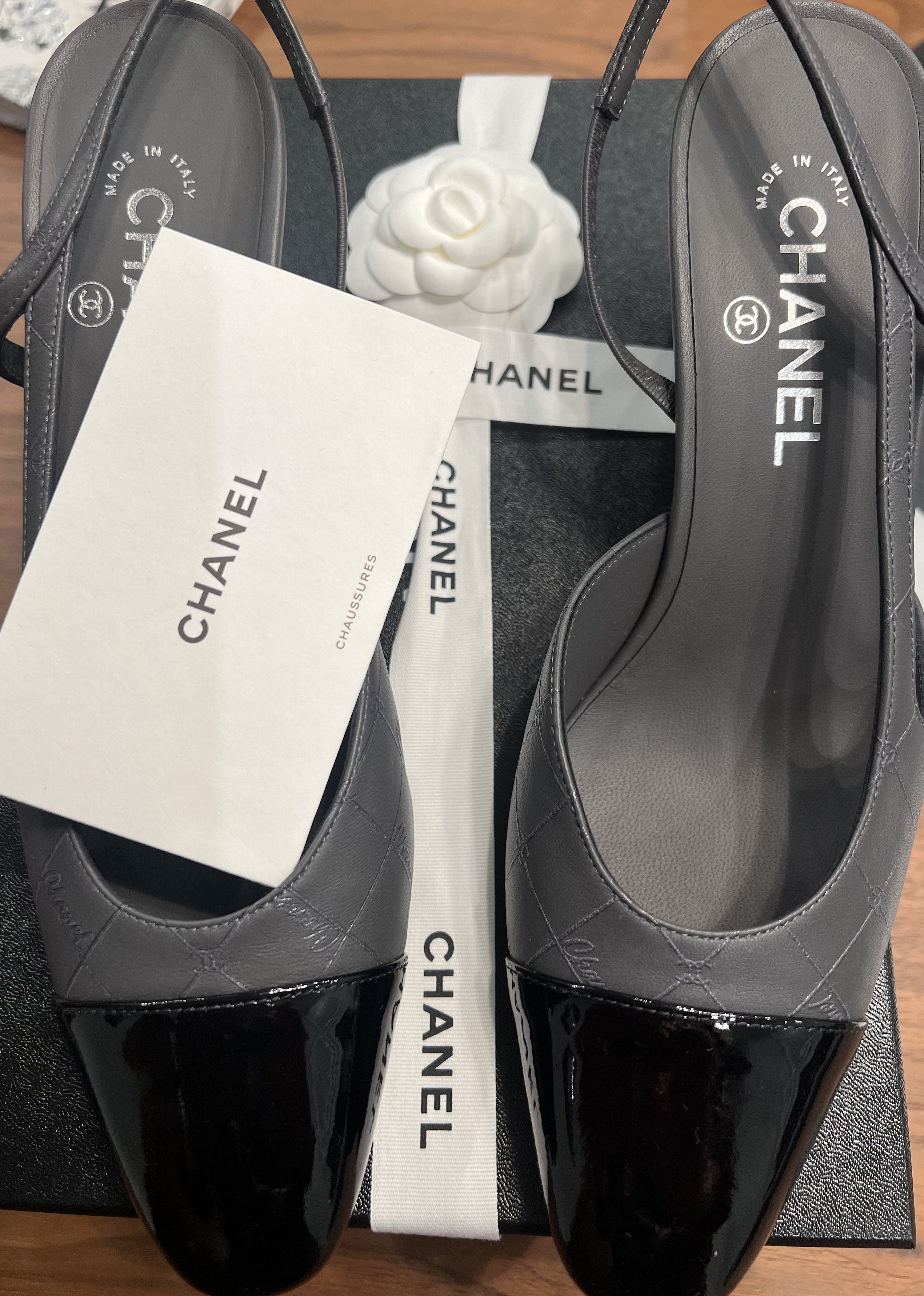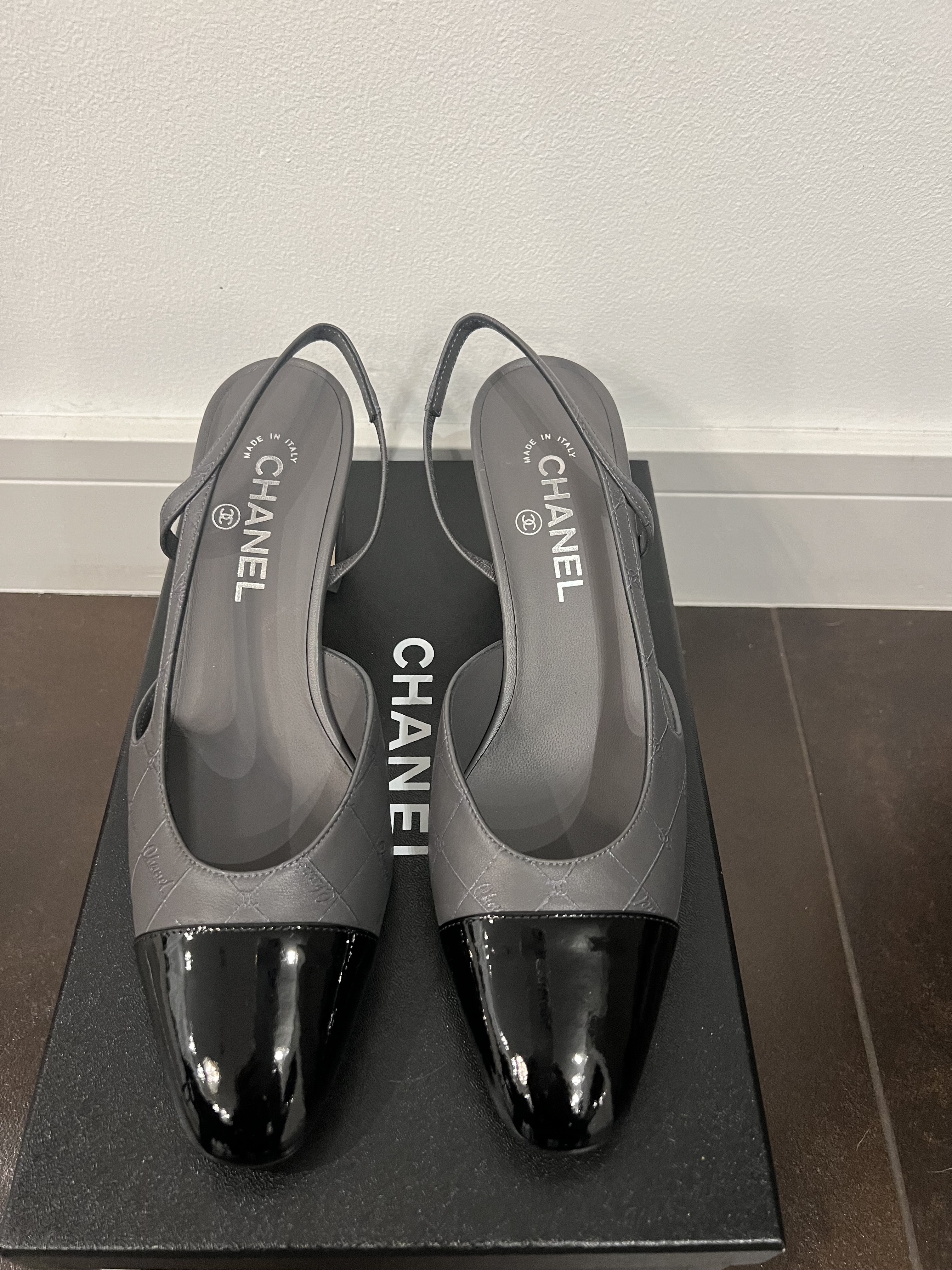 "model: Slingback. Szare skórzane czółenka, ozdobione przeszyciami z logo marki, czarne lakierowane migdałowe noski, srebrne logo marki na obcasie, pasek nad pięta. Stan nowe z całym kompletem i pudełkiem. Rozmiar 40.5, długość wkładki 26 cm."
