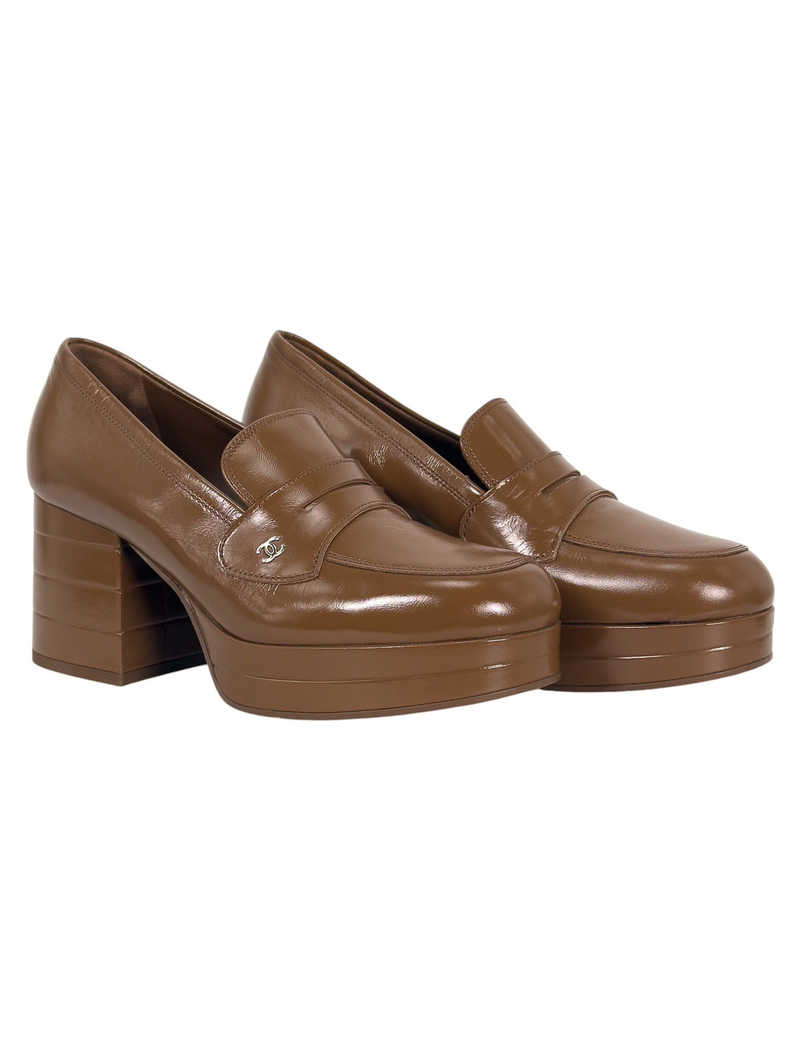 "Ciemnocamelowe czółenka na obcasie 8 cm i lekkiej platformie 2,5cm, srebrno logo marki w bocznej części, wsuwane. Stan nowe z pudełkiem, workiem przeciwkurzowym oraz rachunkiem
