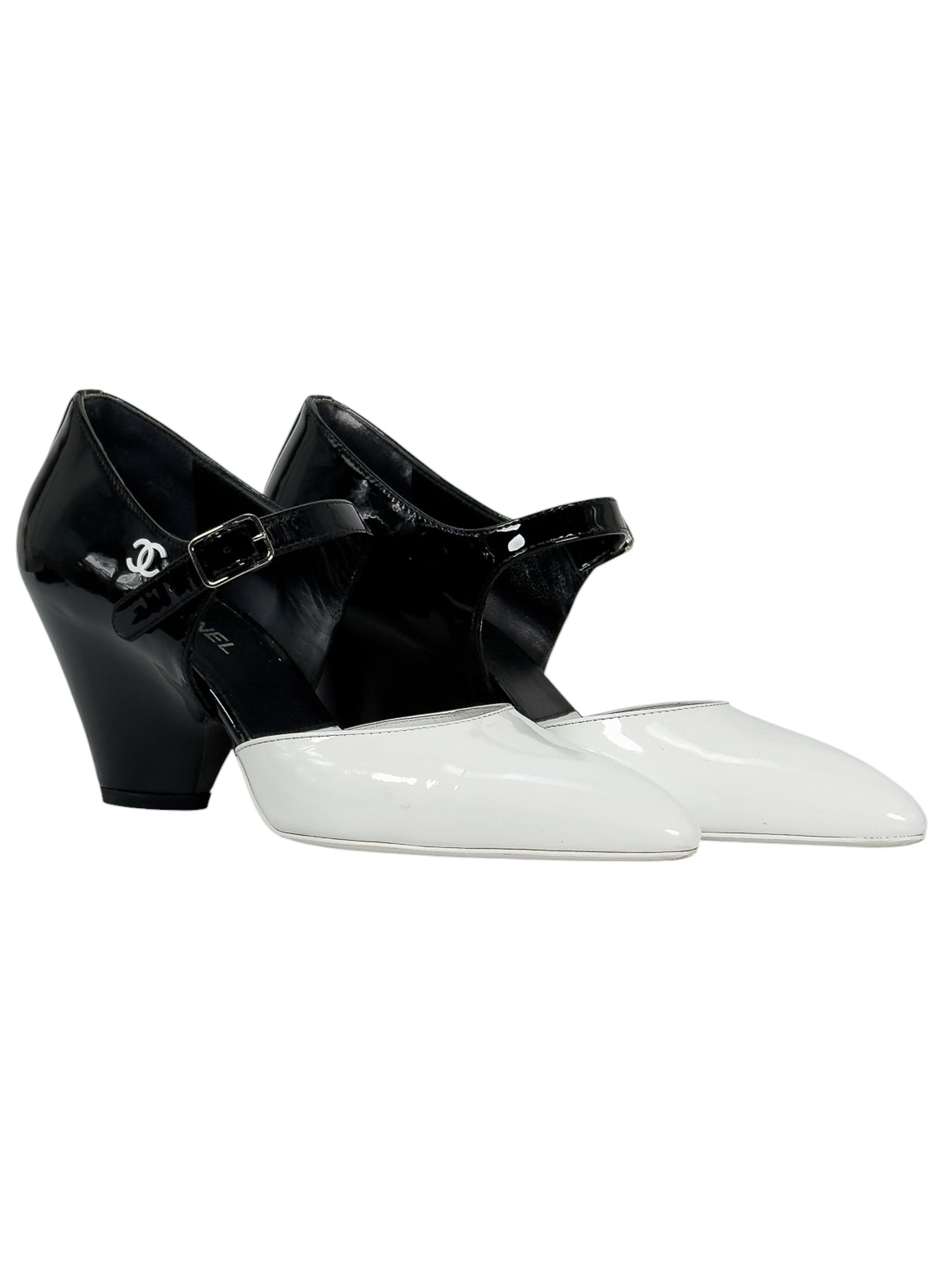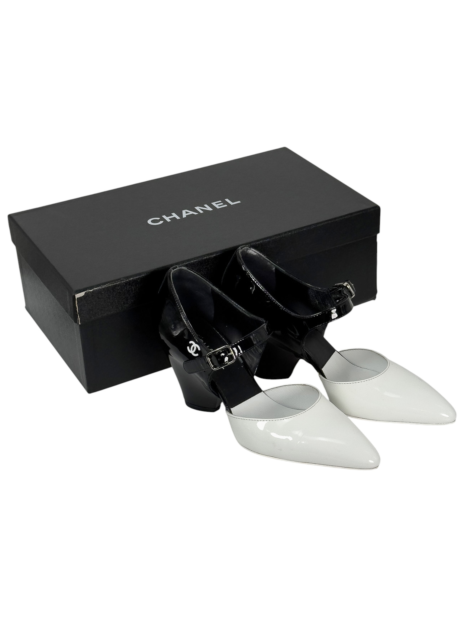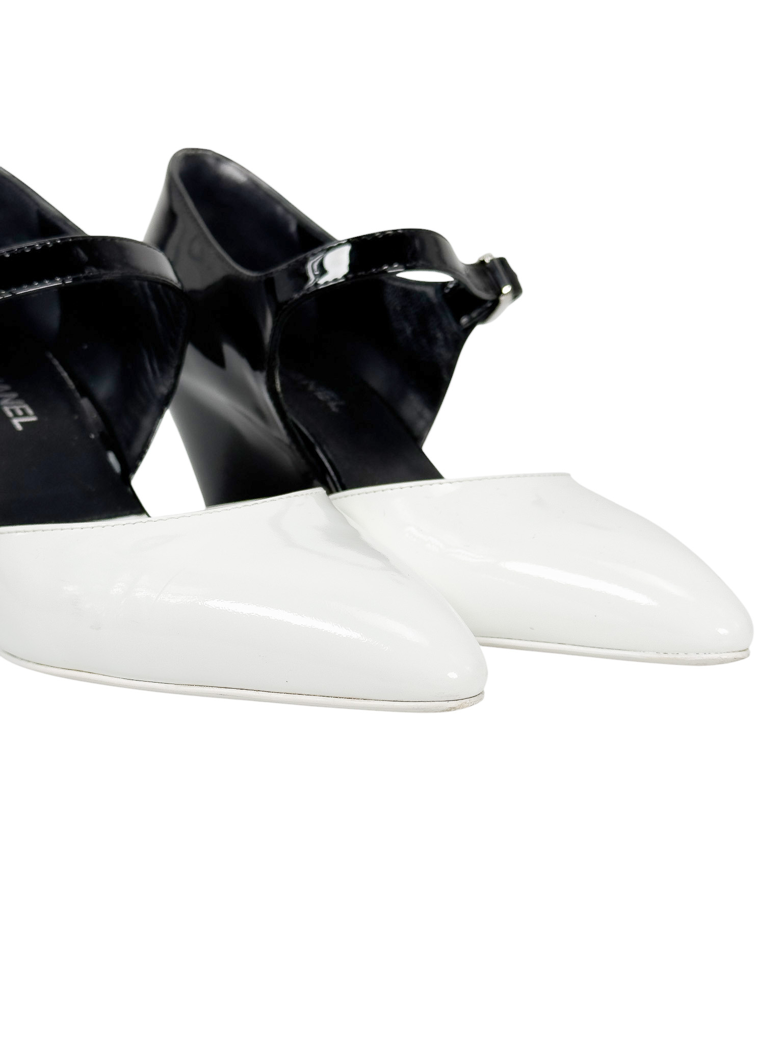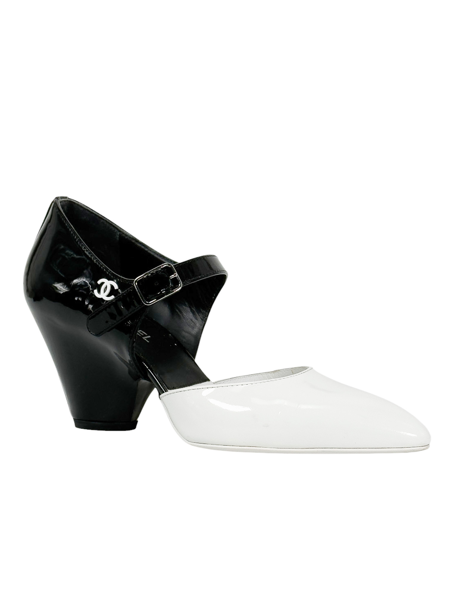 "Czarno-białe czółenka wykonane z lakierowanej skóry, migdałowe noski, stożkowy obcas, pasek wykończony srebrnym logowanym zapięciem, białe logo marki w bocznej części, pudełko w komplecie. Stan bardzo dobry, delikatne przetarcia na podeszwie. Rozmiar 36 C."