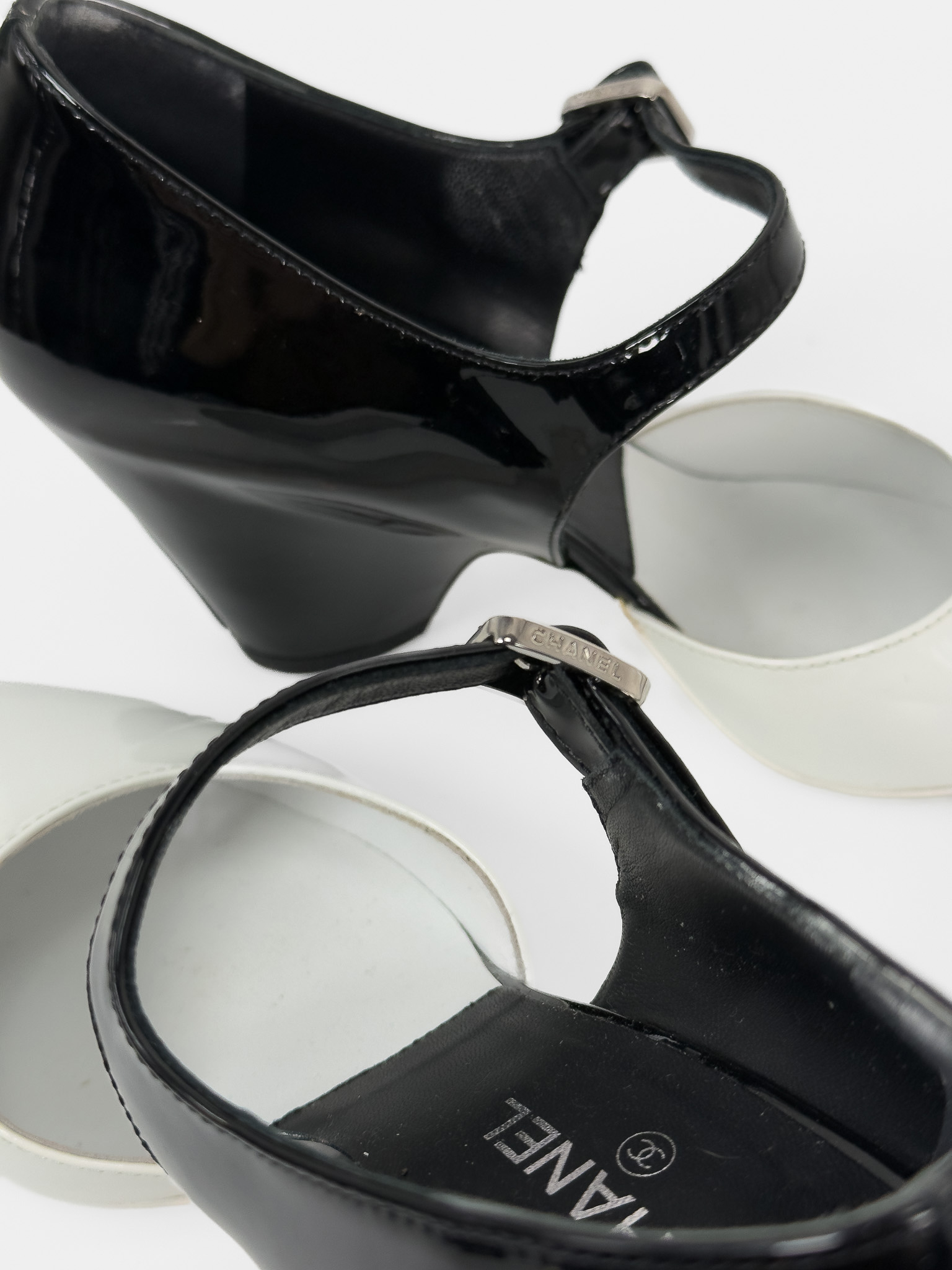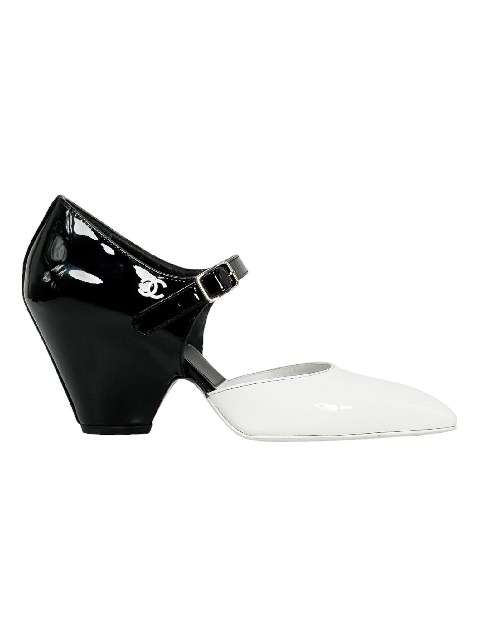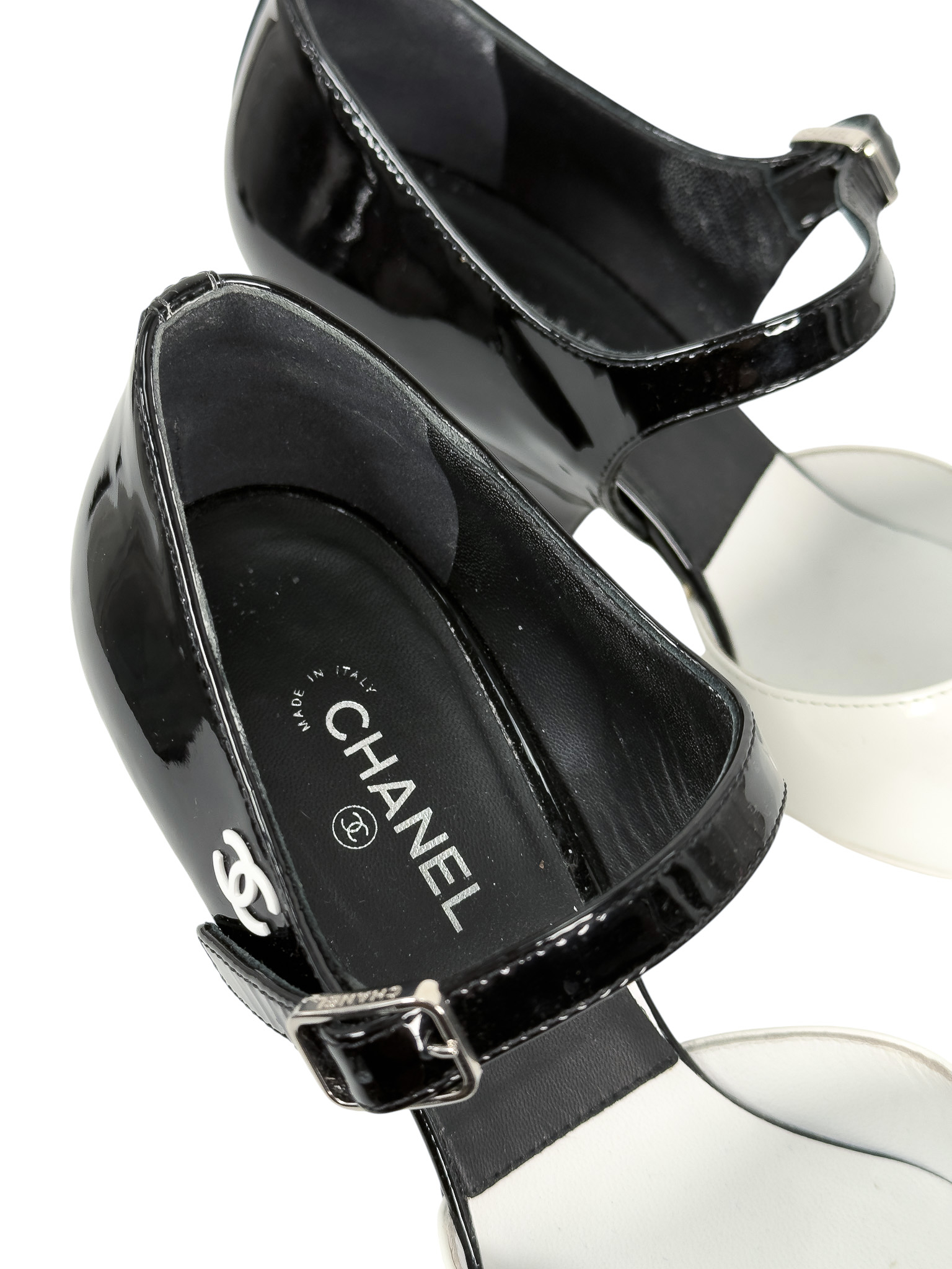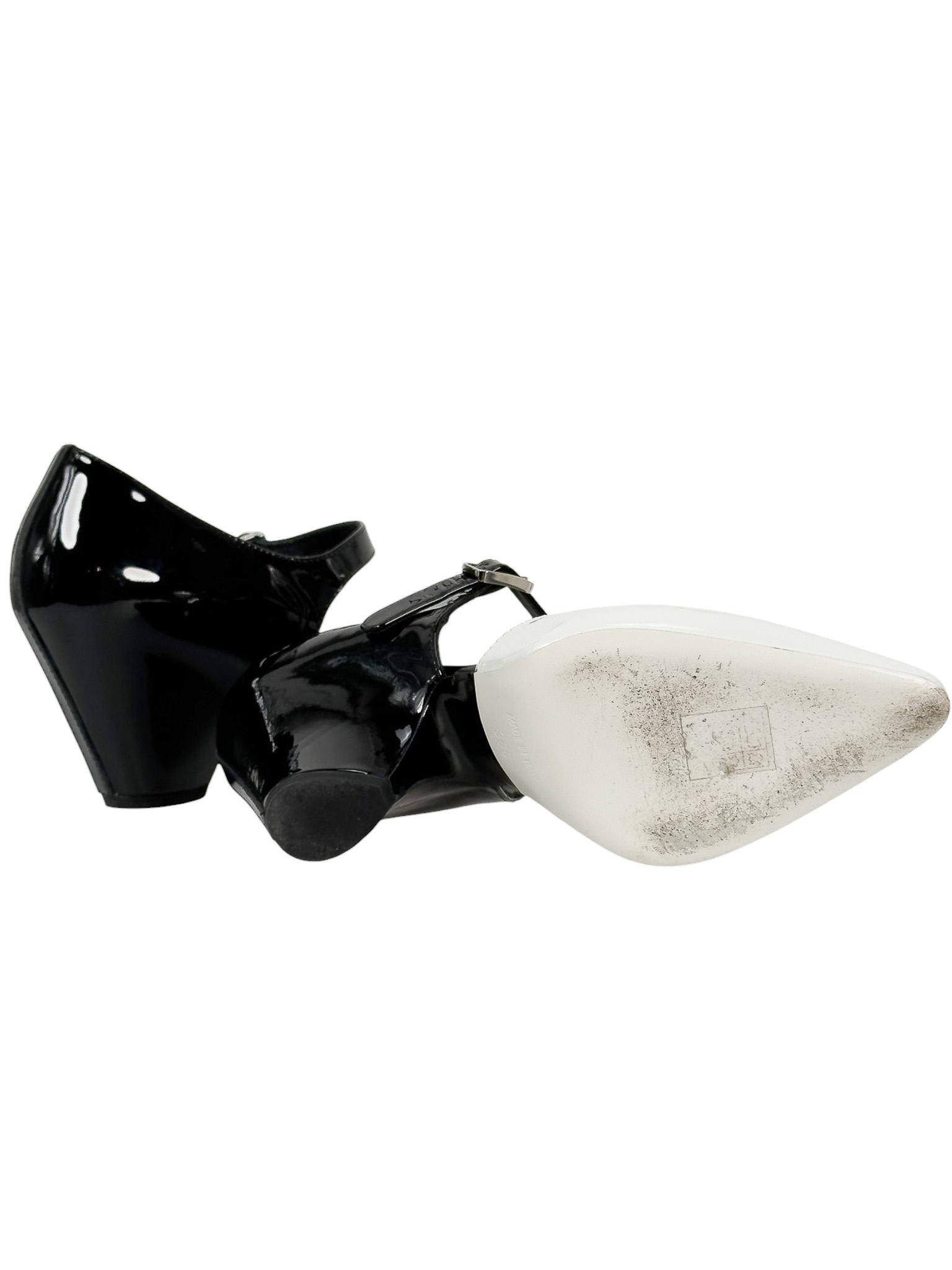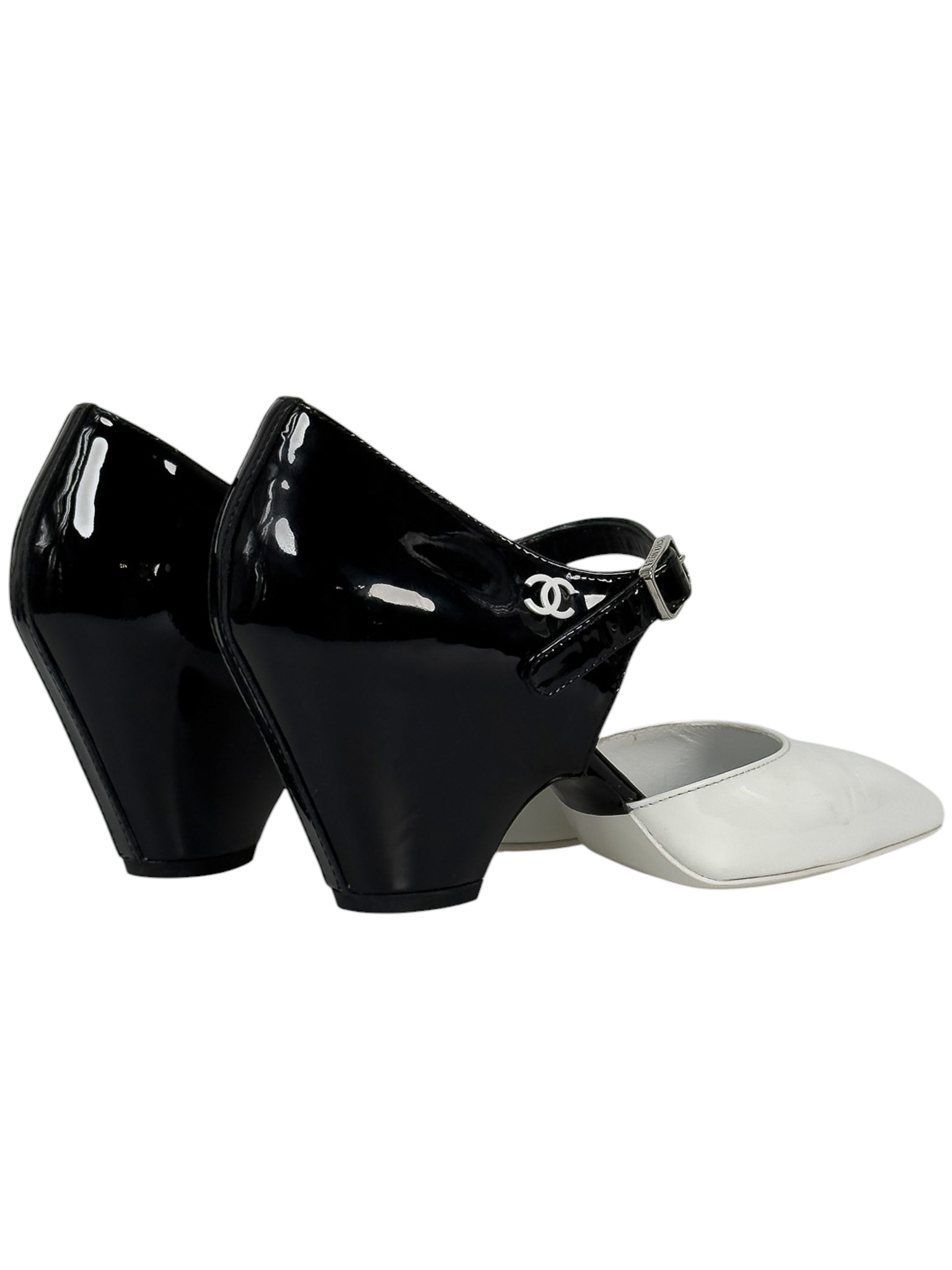"Czarno-białe czółenka wykonane z lakierowanej skóry, migdałowe noski, stożkowy obcas, pasek wykończony srebrnym logowanym zapięciem, białe logo marki w bocznej części, pudełko w komplecie. Stan bardzo dobry, delikatne przetarcia na podeszwie. Rozmiar 36 C."