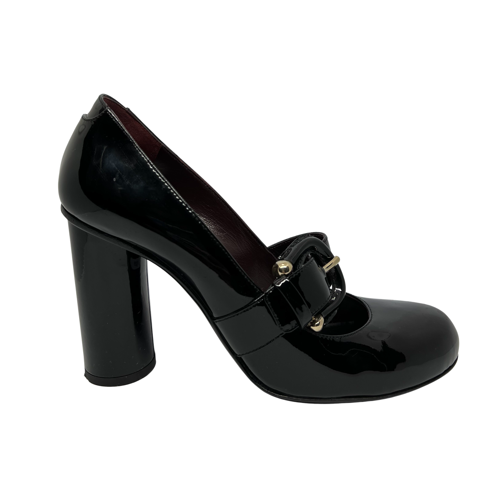 "czarne lakierowane czółenka, zapięcie na podbiciu, obcas słupek ( 9,5 cm), używane, starte podeszwy, stan dobry. Rozmiar 38,5."