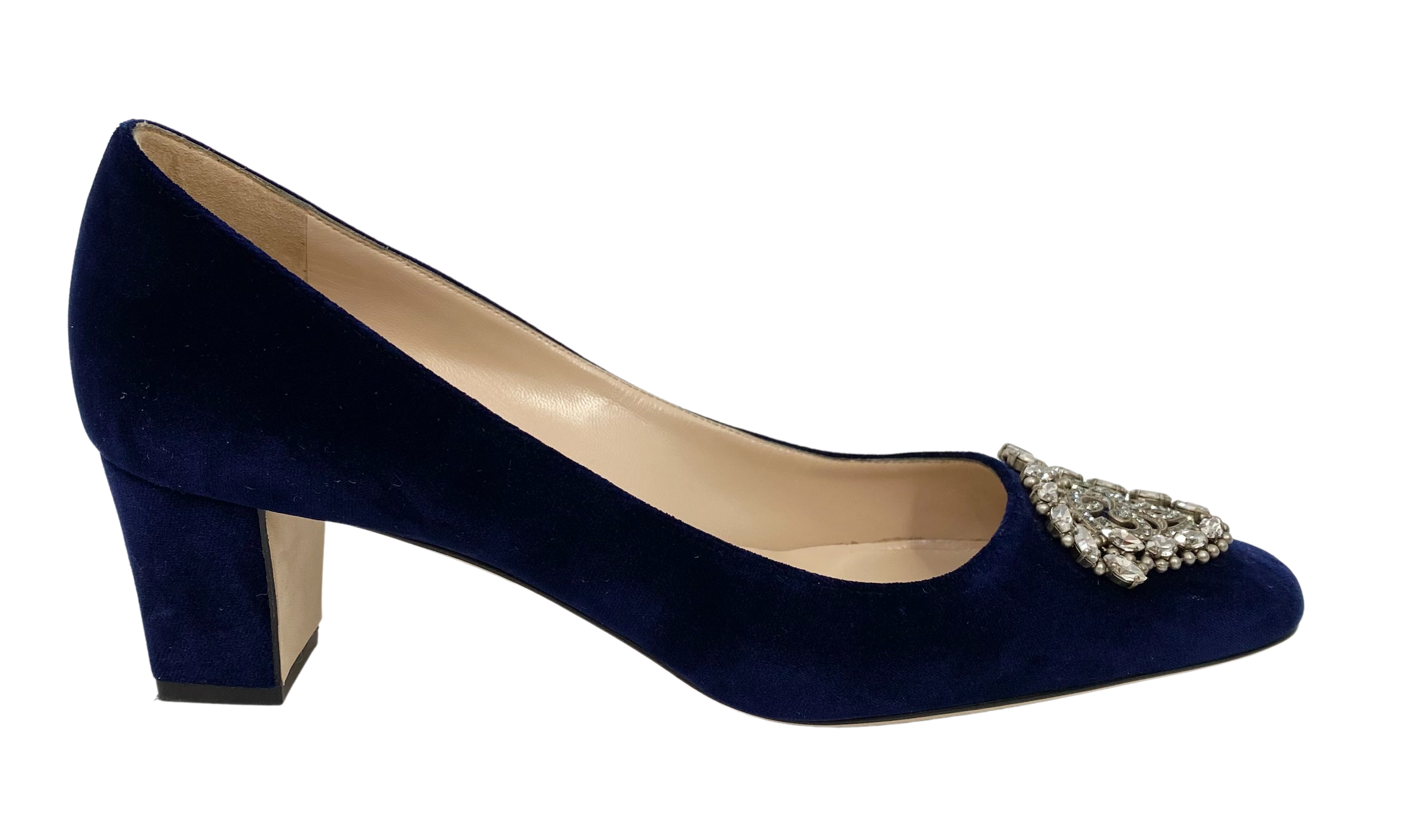 "welurowe, granatowe czółenka, na przodzie zdobienia z cyrkonii, obcas słupkowy 5,5 cm. Stan idealny, pudełko. Rozmiar 39. Model Okkato. Cena zakupu 4100,-"