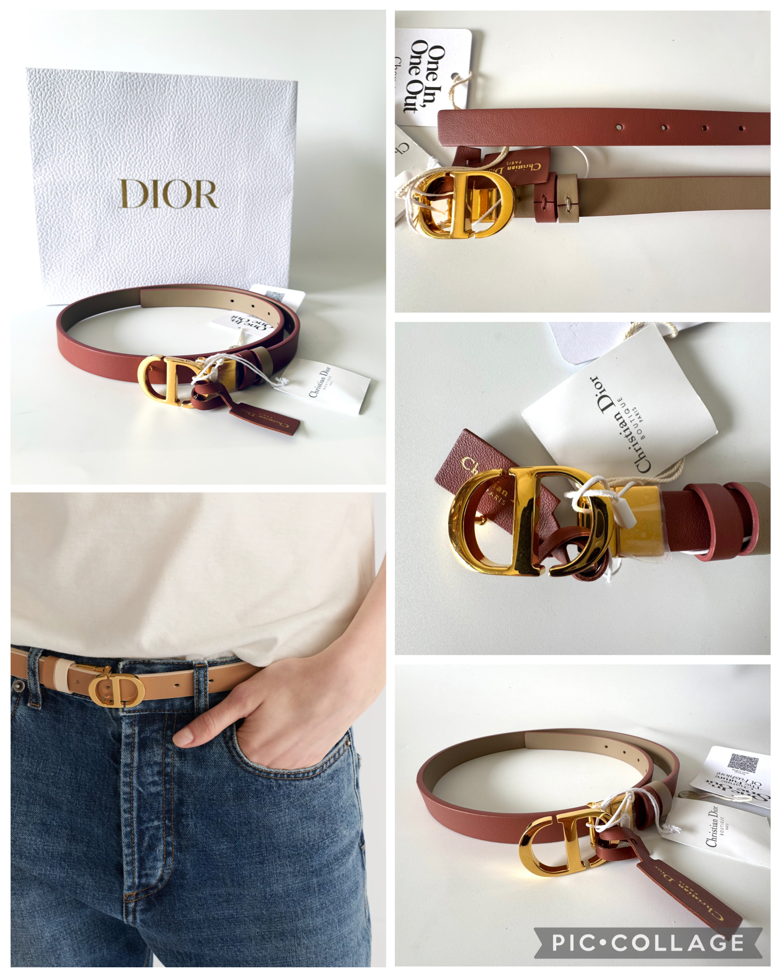 ▪️Wykonany z gładkiej skóry cielęcej w kolorze rdzawym z jednej strony i taupe z drugiej, ozdobiony jest kultową, błyszczącą, metalową klamrą „CD” w złotym wykończeniu.