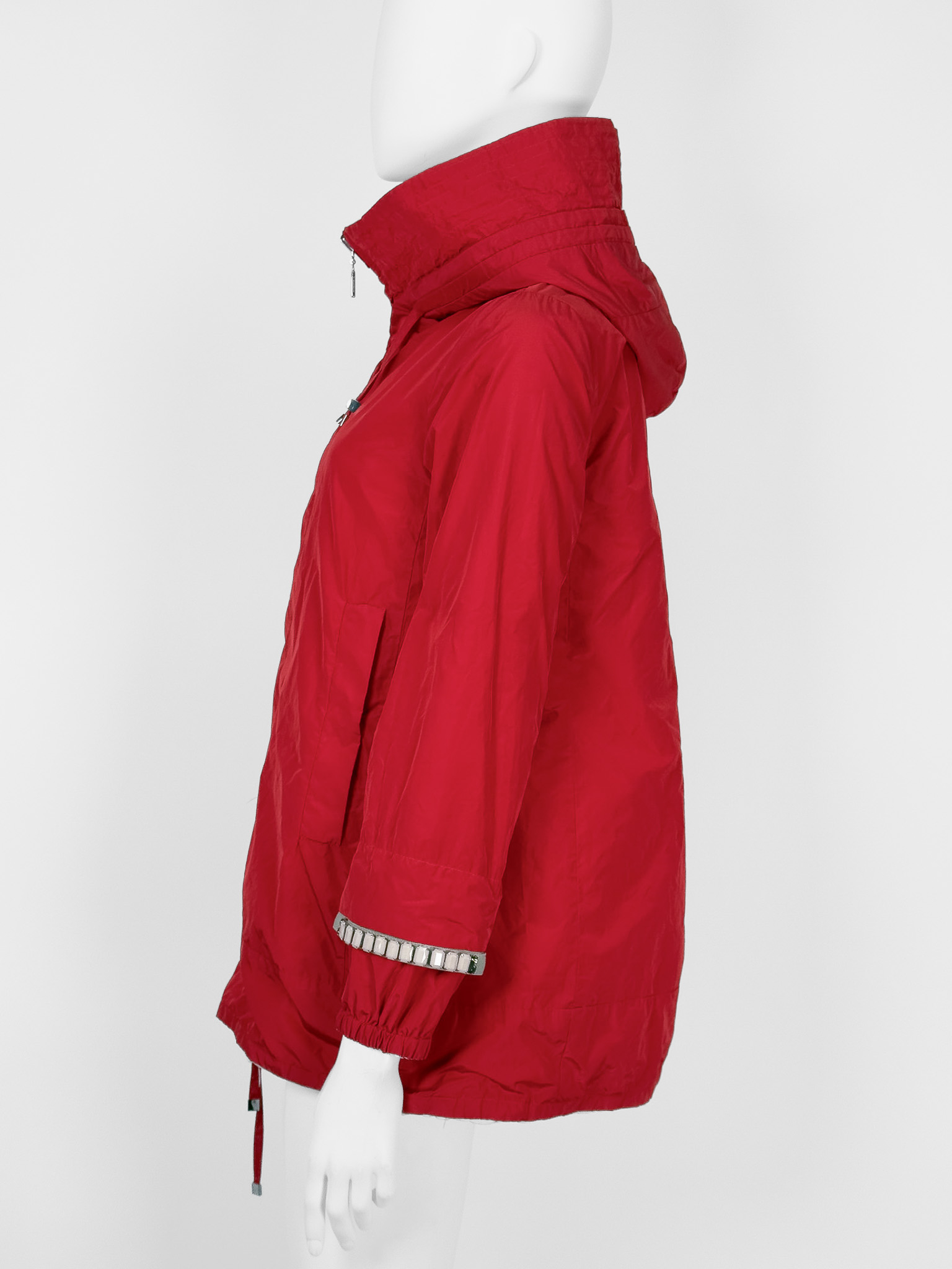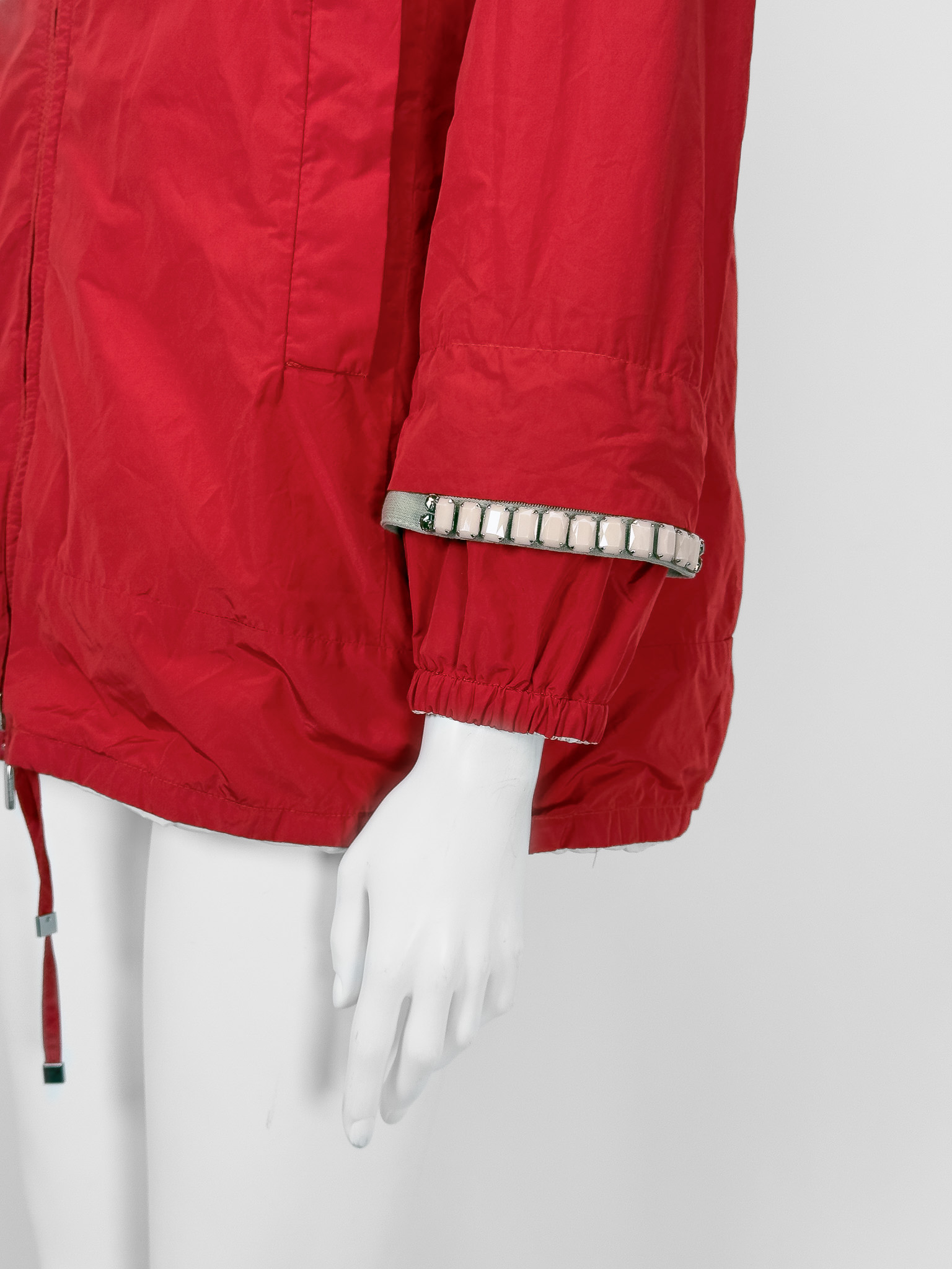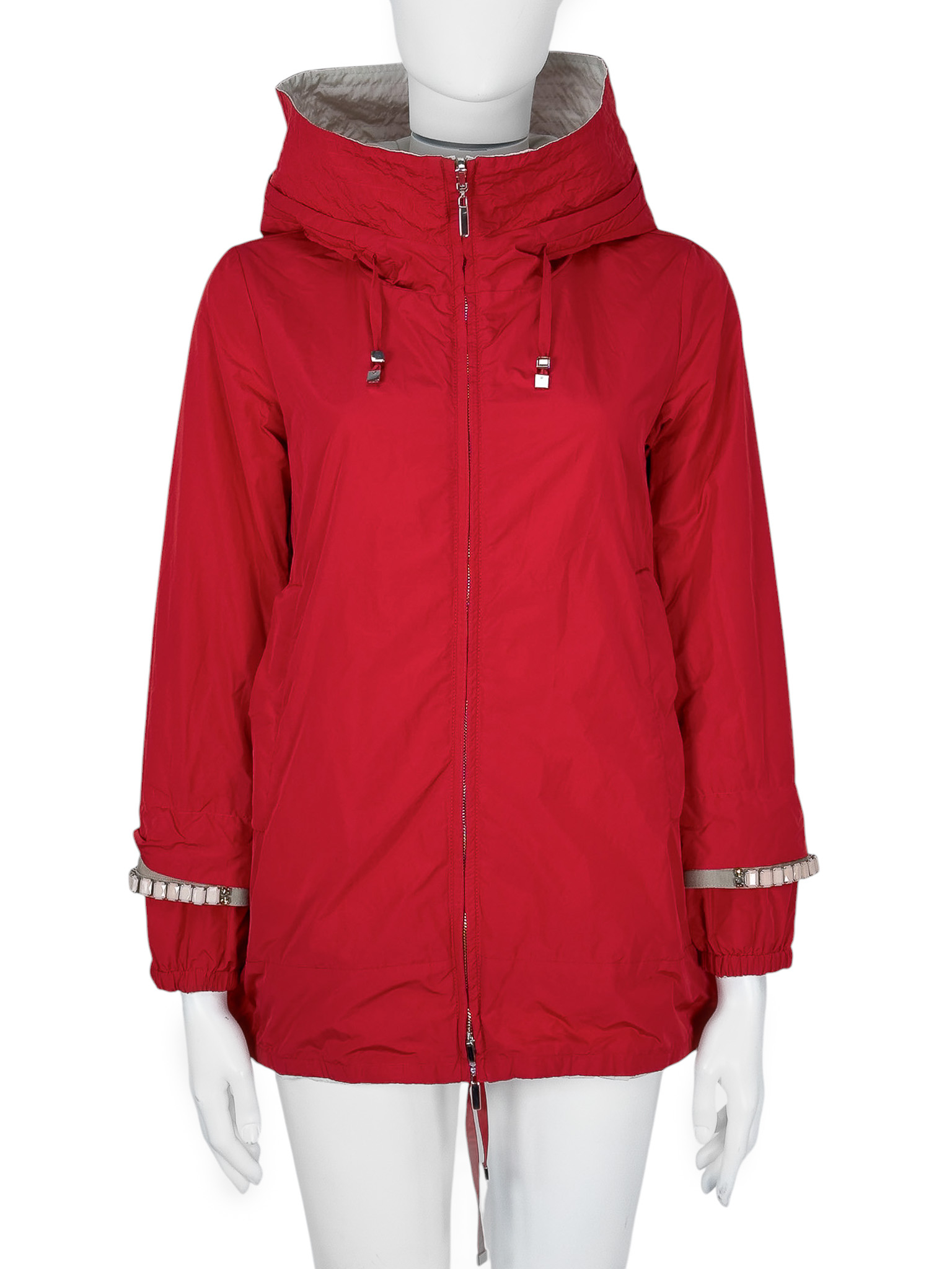 "Czerwono - szara dwustronna ortalionowa kurtka, z kapturem, zapinana na dwa srebrne suwaki, odpinane wstawki przy mankietach wysadzane połyskującymi różowymi kamieniami, regulowana w talii, dwie kryte kieszenie po bokach. Stan bardzo dobry. Rozmiar z metki IT 38. Skład: 100% poliester. Wymiary: szerokość mierzona od pachy do pachy 50cm, długość całkowita 70cm."