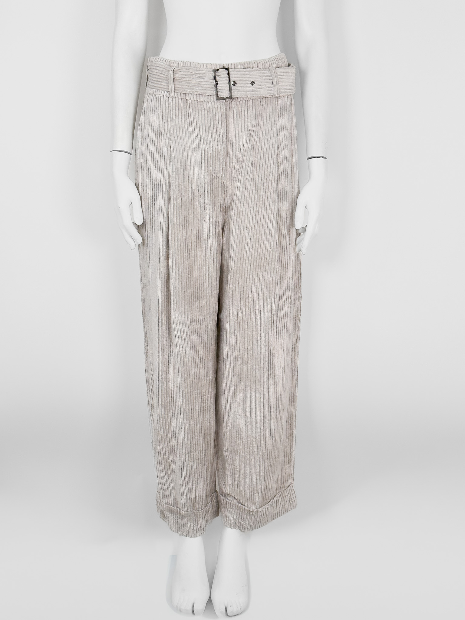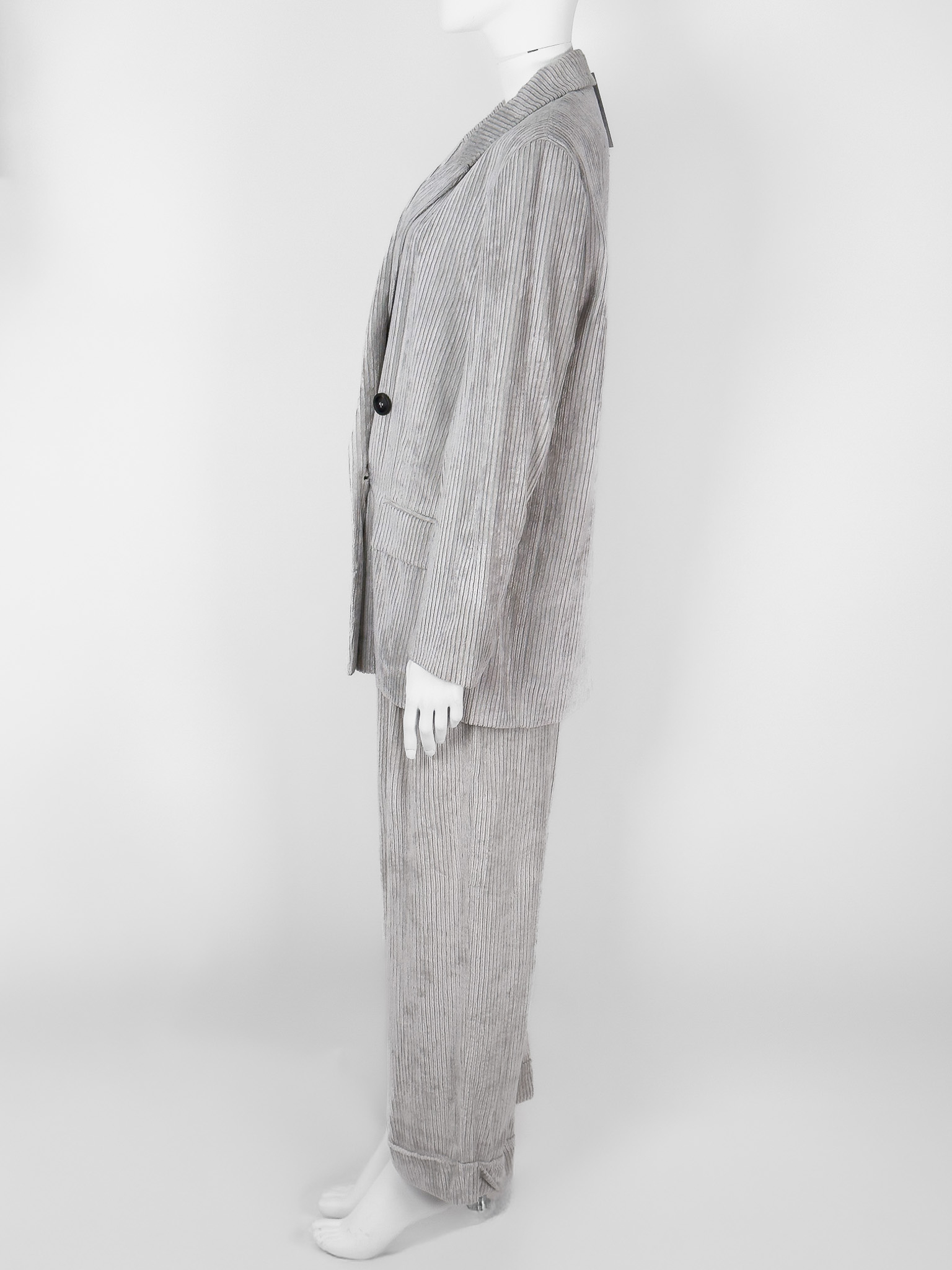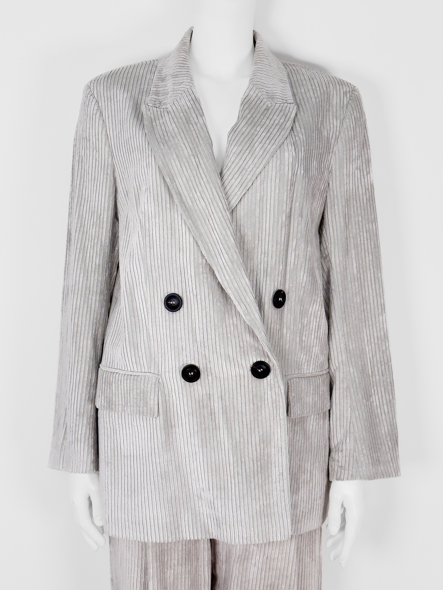 "Jasnoszary prążkowany garnitur, komplet: marynarka+ spodnie, marynarka zapinana na dwa brązowe guziki na przodzie, dwurzędowa, prosty, dłuższy krój, głęboki dekolt, dwie zaszyte kieszenie z klapami, małe poduszki na ramionach, rozporek, spodnie zapinane na kryty suwak, dwie haftki oraz guzik, regulowany pasek ze srebrną klamrą w pasie, wysoki stan, proste nogawki podwinięte na końcach, dwie kryte kieszenie po bokach oraz dwie zaszyte z tyłu. Nowy z metkami. Rozmiar z metki IT 44. Skład marynarki: materiał 1: 83% wiskoza, 17% poliamid; podszewka: 58% bawełna, 42% wiskoza. Skład spodni: materiał 1: 83% wiskoza, 17% poliamid;; materiał 2: 61% acetat, 39% kupro."