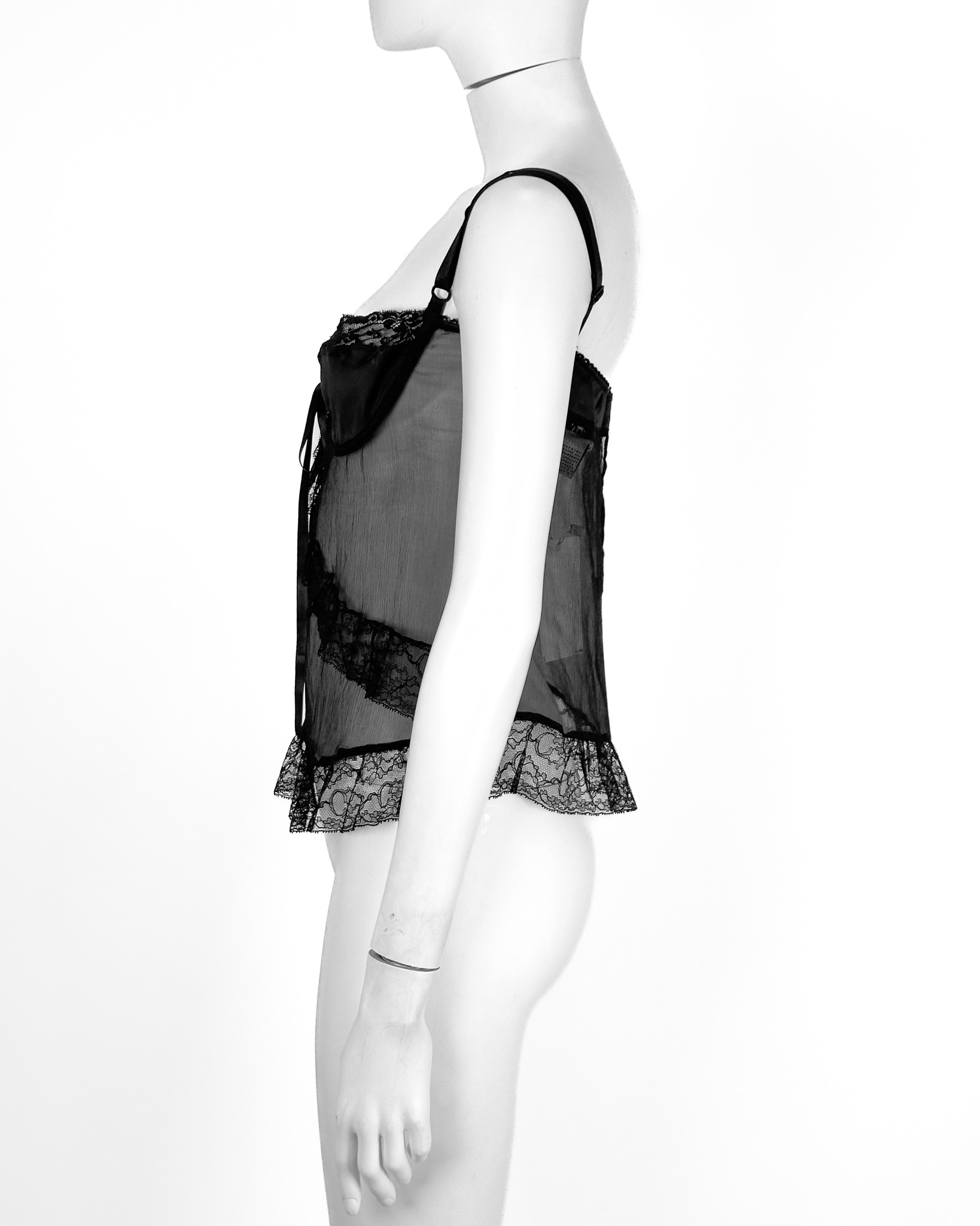 "Czarna halka ozdobiona koronką, krótka, cienkie regulowane ramiączka, częściowo transparentna, biust wykończony satynowym materiałem, prosty dekolt z wiązaną kokardą, wszyte fiszbiny, regulowana z tyłu, zapinana na dwie kryte czarne haftki. Rozmiar z metki IT 42. Wycięta metka ze składem."