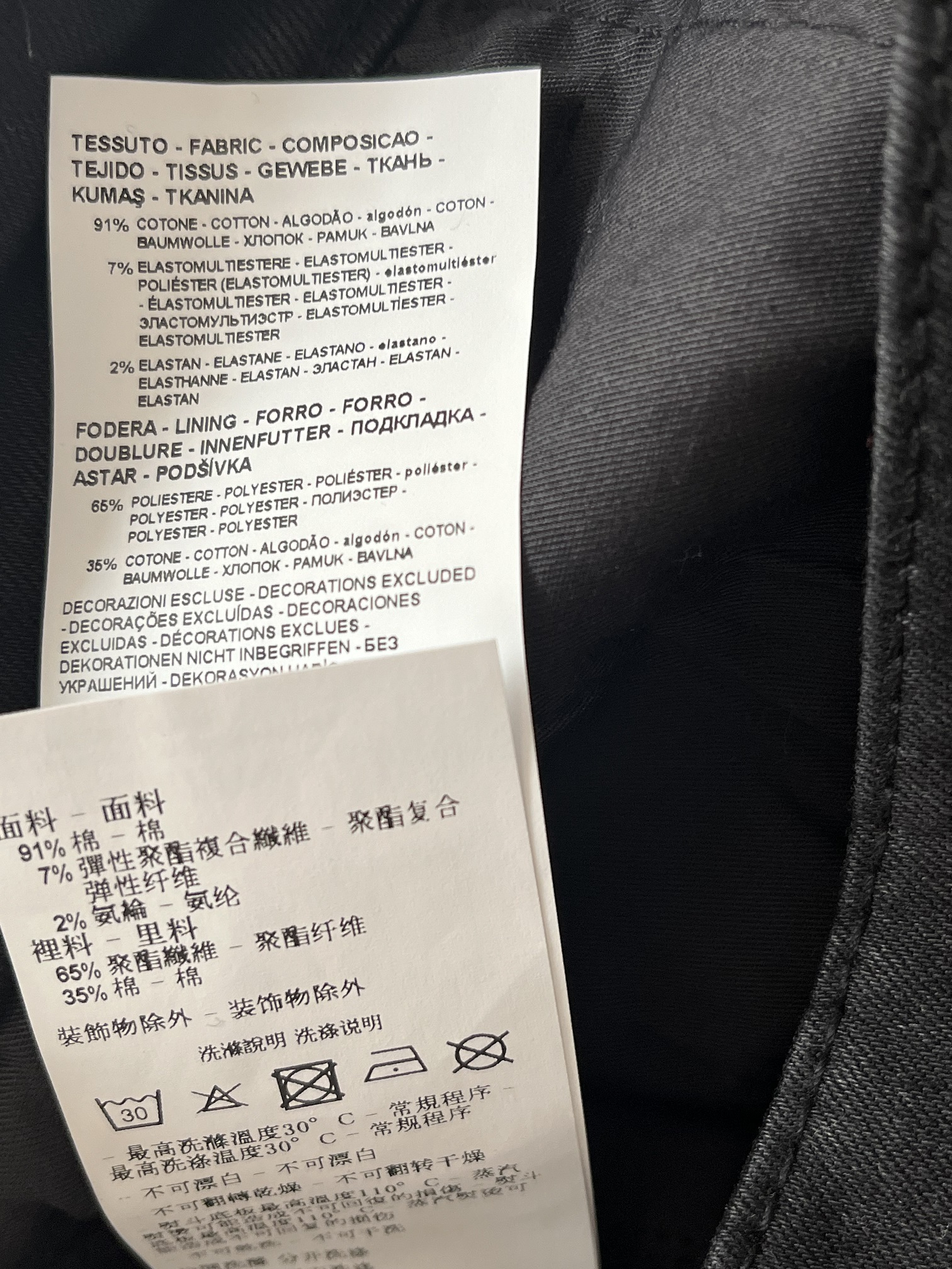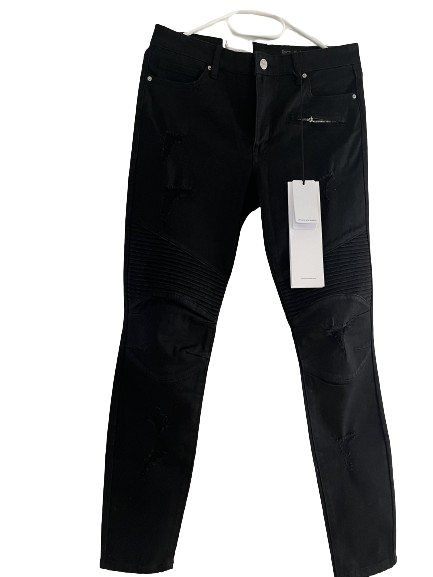 "Nowe z metkami jeansy marki Armani Exchange. Kolor czarny. Z przodu boczne kieszenie plus kieszonka na suwak. Tylne kieszenie kryte - również na suwak. Jeansy mają przetarcia (bez widocznych dziur) na całej długości spodni z przodu. Tył spodni gładki. Wymiary: w pasie ok. 80 cm, biodra ok. 92-94 cm, długość całkowita ok. 98 cm (wszystkie wymiary na płasko, bez naciągania). Skład: 91% bawełna, 7% poliester, 2 % elastan."