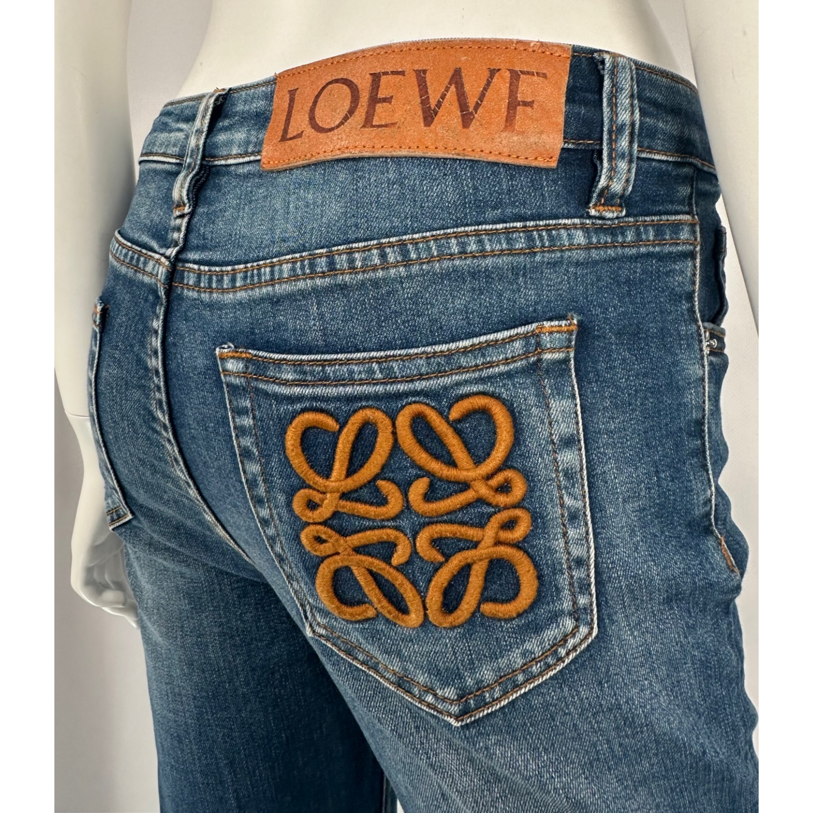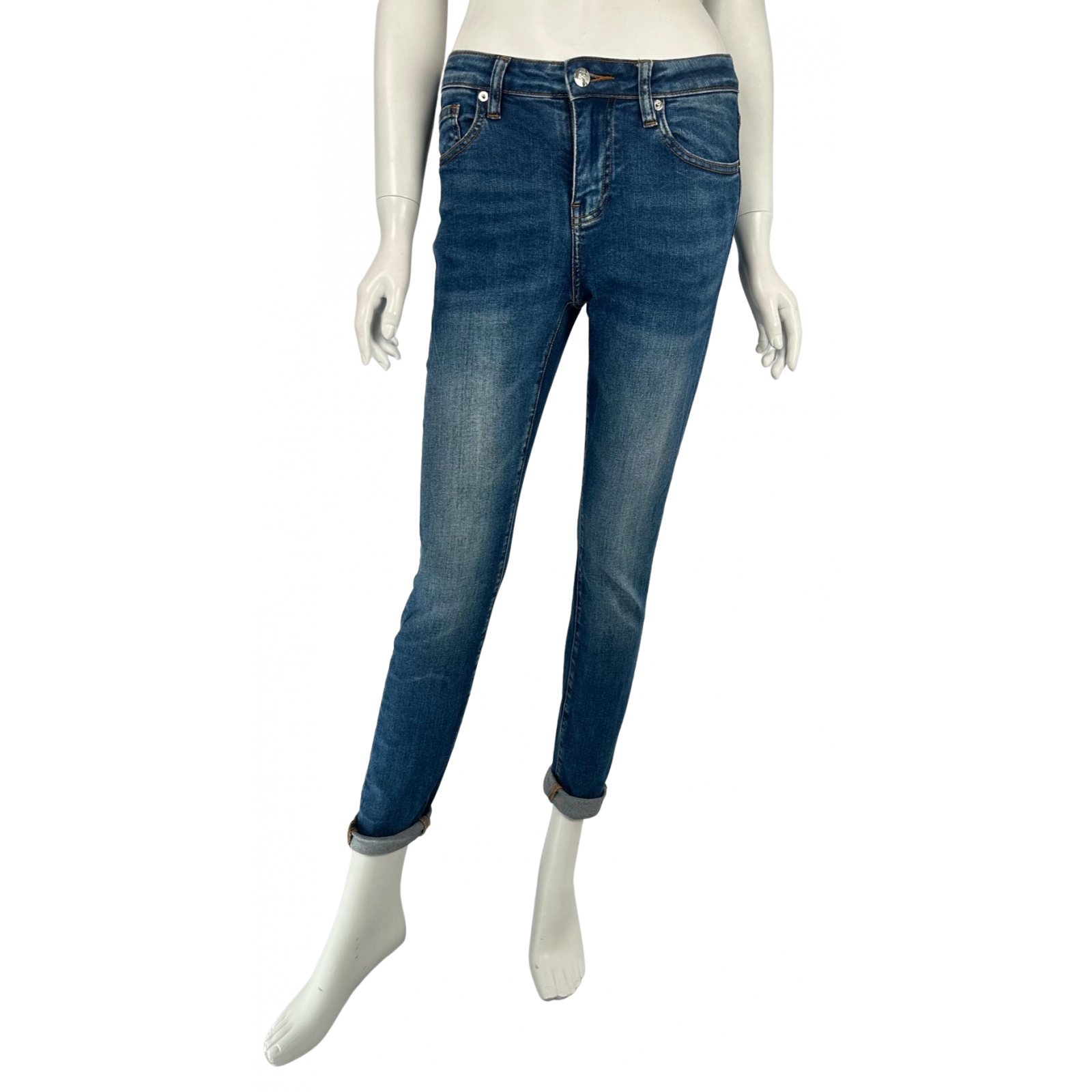 "granatowe cieniowane jeansy z wąska nogawką, boczne i tylne kieszenie, pomarańczowe przeszycia, z tyłu wyszywane logo oraz skórzana naszywka, zapięcie w talii na suwak i guzik. Rozmiar 38. Skład 95% bawełna, 5% elastan. Szerokość talia 38 cm, dł. całkowita 98 cm"