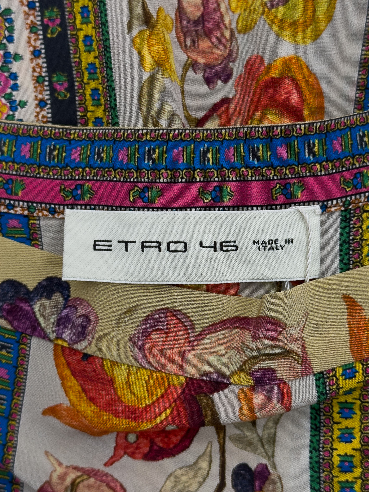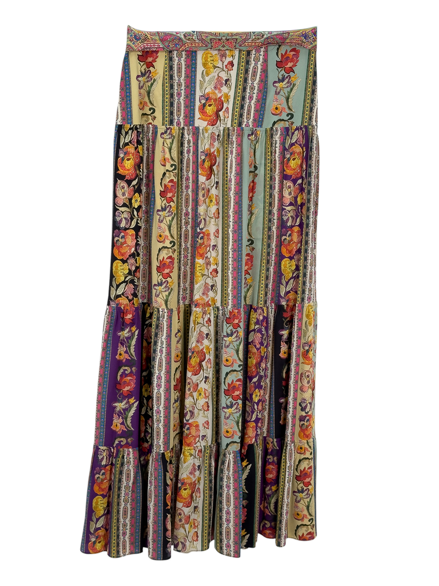 "Wielobarwna jedwabna spódnica ozdobiona wzorami kwiatów, długość maxi, rozkloszowany krój, wiązany pasek w pasie, zapinana w bocznej części na kryty suwak oraz haftkę. Stan bardzo dobry. Rozmiar z metki IT 46. Skład: 100% jedwab. Wymiary: szerokość w pasie 40cm, długość całkowita 114cm."
