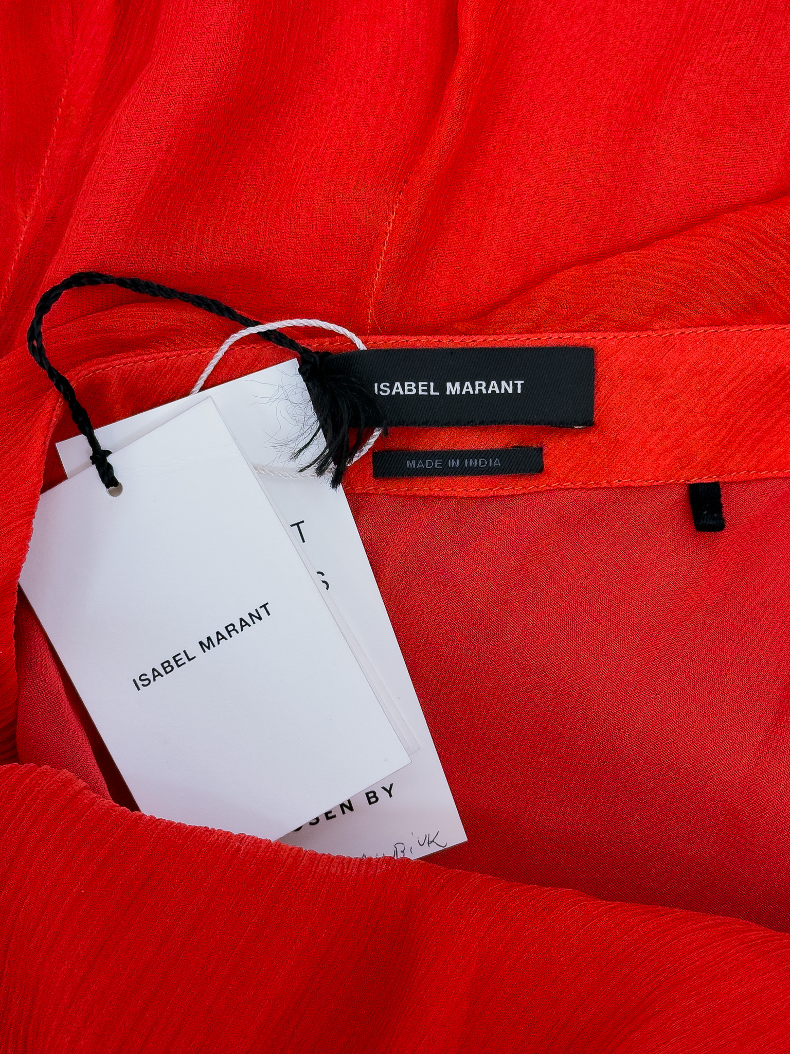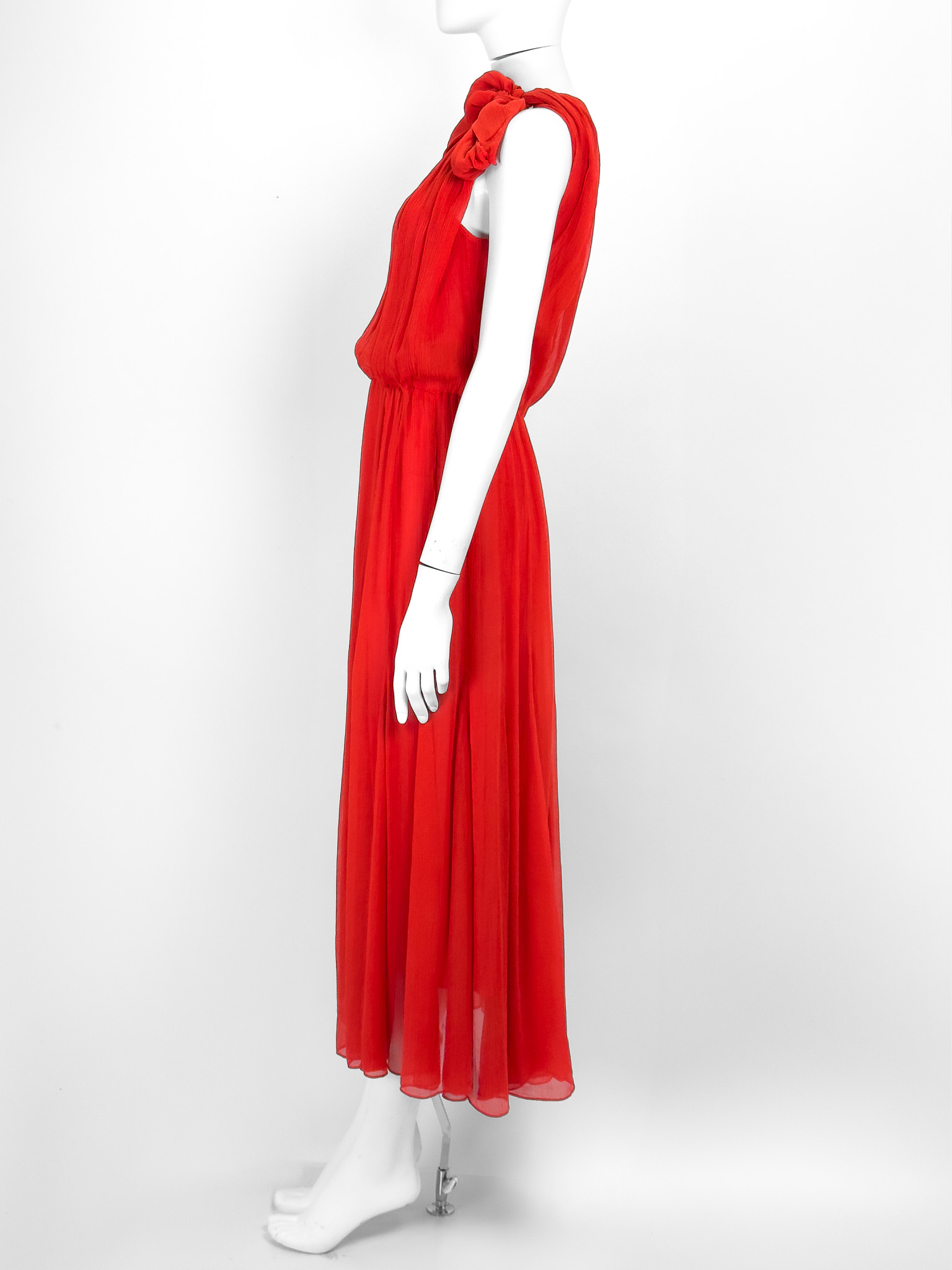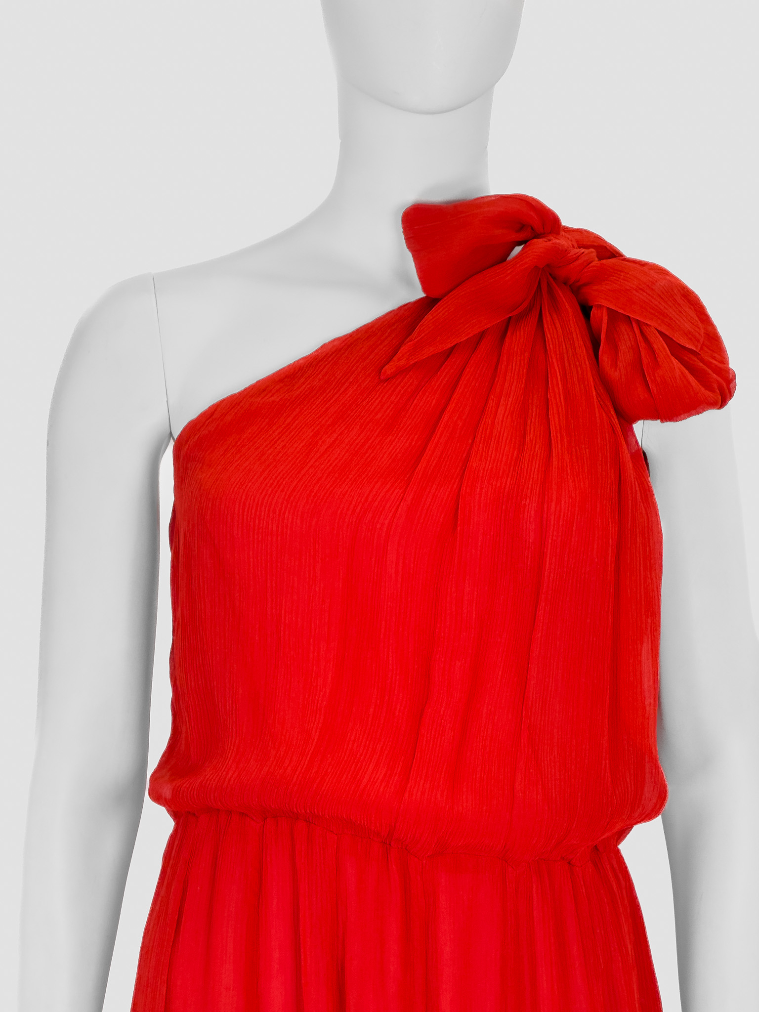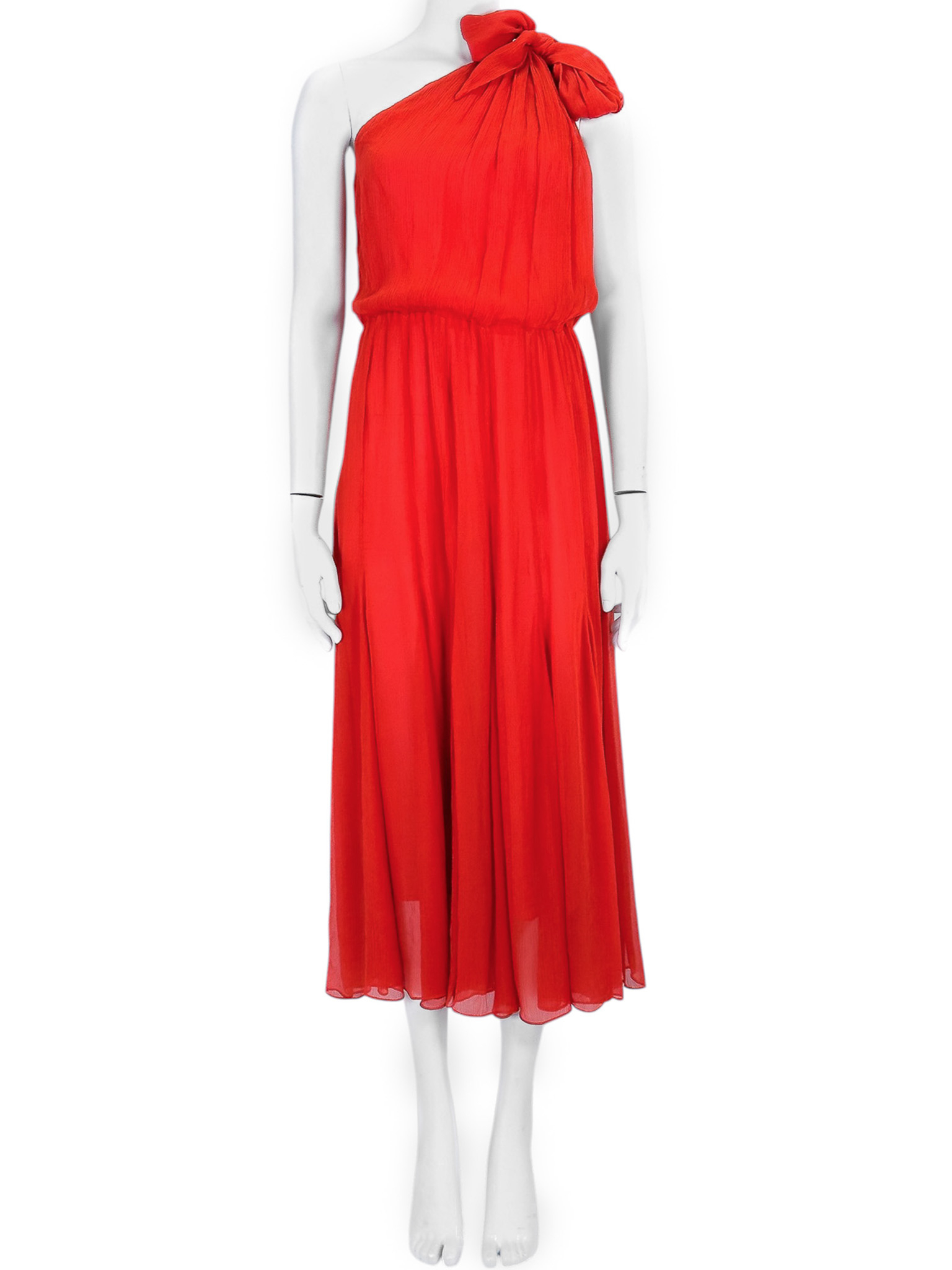 "Jedwabna czerwona sukienka ozdobiona wiązaniem na ramieniu, bez rękawów, długość midi, taliowana, delikatnie rozkloszowany dół, w zestawie z metką. Rozmiar z metki FR 38. Skład: 100% jedwab; podszewka: 100% wiskoza. Wymiary: szerokość mierzona od pachy do pachy 47cm, długość całkowita 150cm."