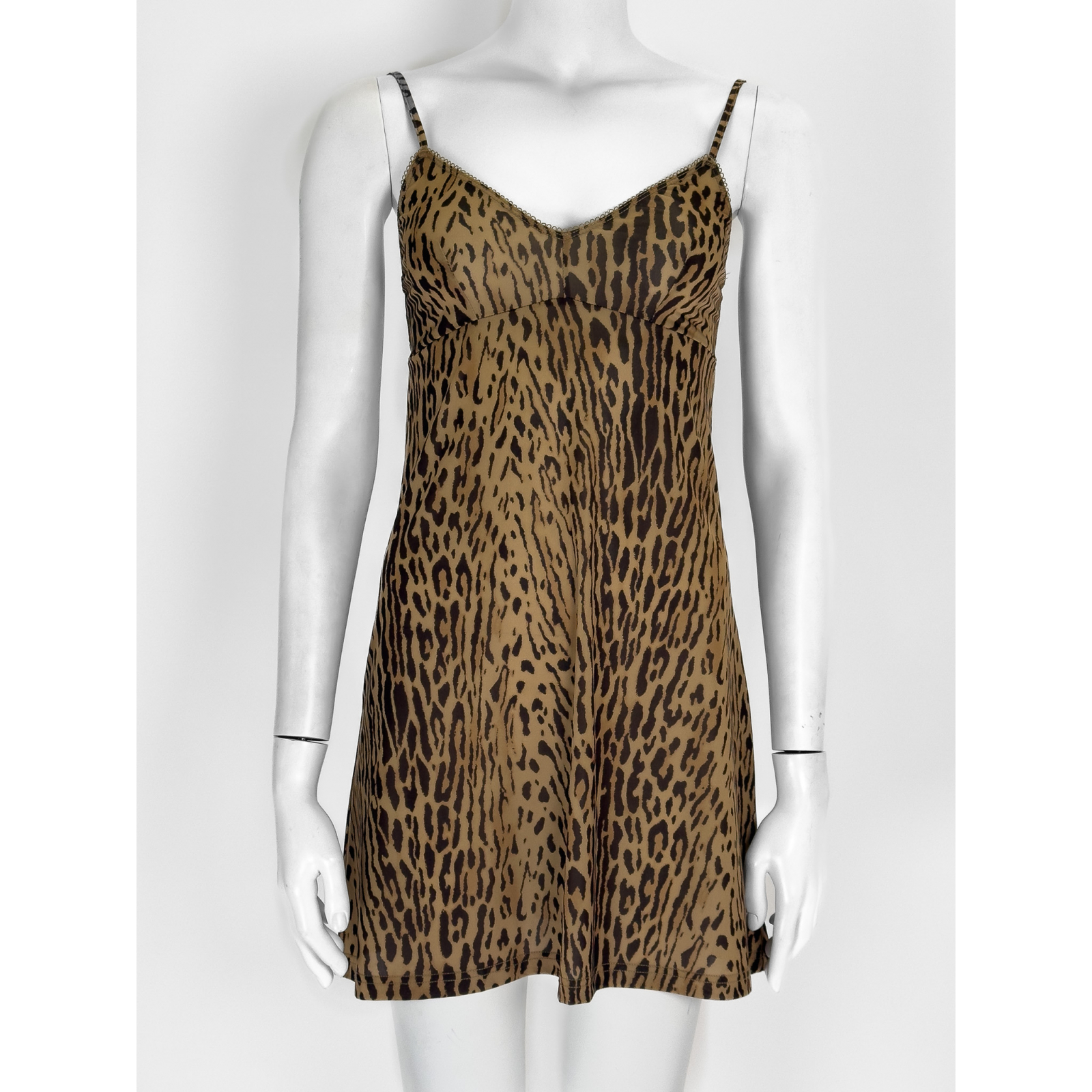 "Brązowa jedwabna sukienka w print pantery, długość do kolan, zapinana w centralnej części na złote guziki, wiązana w okolicy dekoltu, bufiaste rękawy, mankiety wykończone gumą, w zestawie z halką na ramiączkach. Rozmiar z metki 0. Skład: 100% jedwab; halka: 90% poliester, 10% elastan. Wymiary: szerokość mierzona od pachy do pachy 52cm, długość całkowita 90cm."