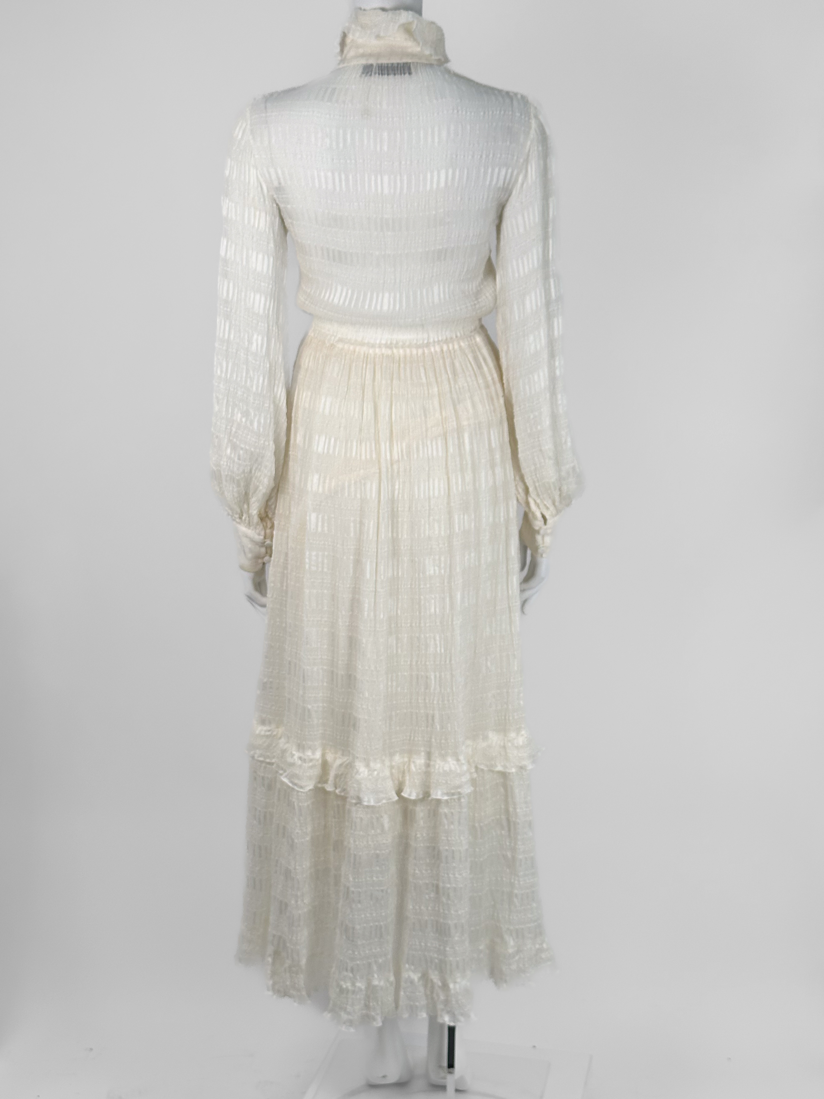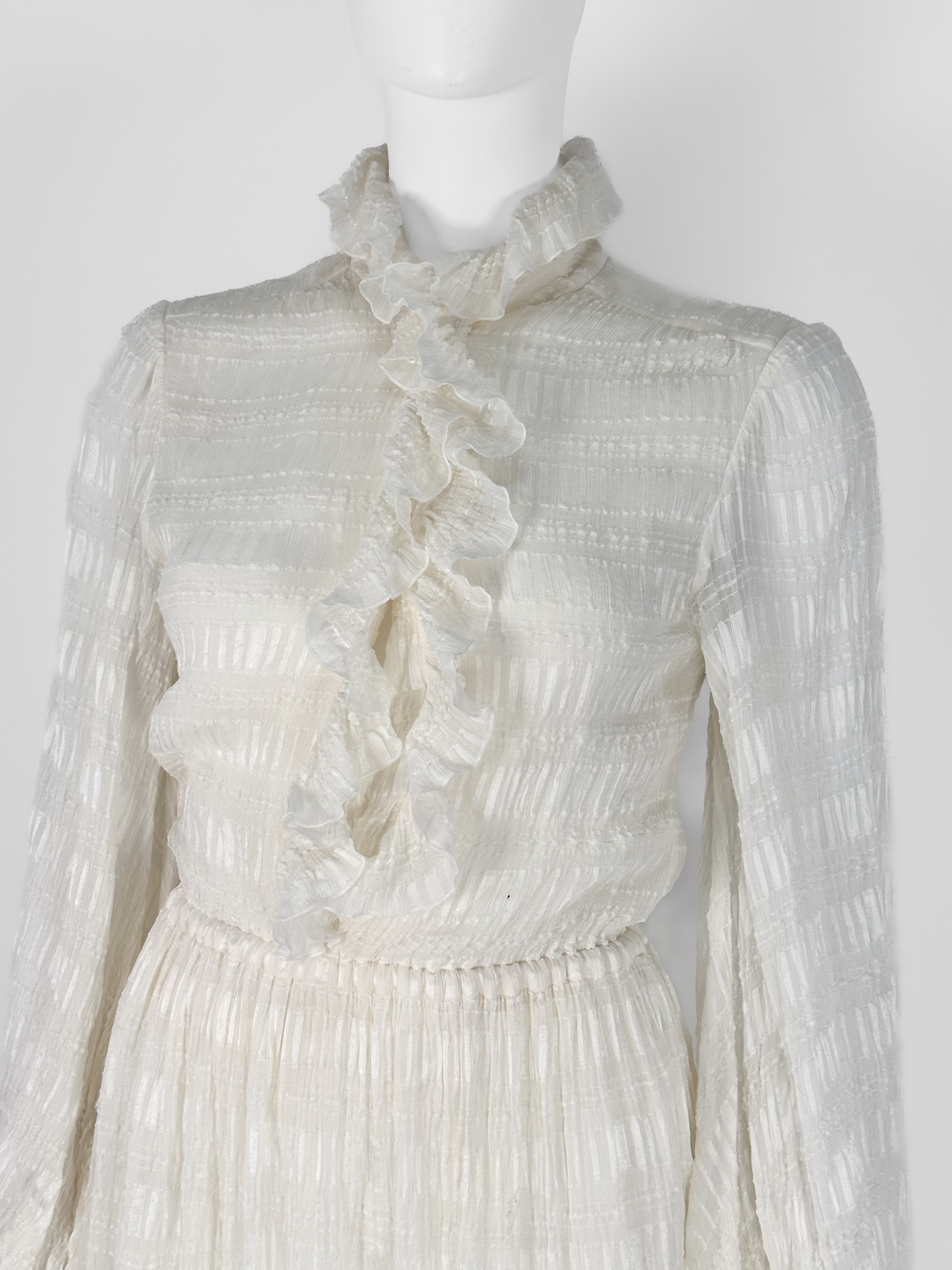 "Kremowa, jedwabna, zwiewna sukienka, materiał w fakturę, dekolt wykończony falbanką i zapinany na guzik, rękawy zapinane na guziki, dół wykończony dwoma rzędami falban. Rozmiar z metki IT 44. Skład: 100% jedwab. Stan : bardzo dobry, posiada delikatne zabrudzenia na materiale. Wymiary: szerokość mierzona od pachy do pachy 44cm, długość całkowita 146cm."