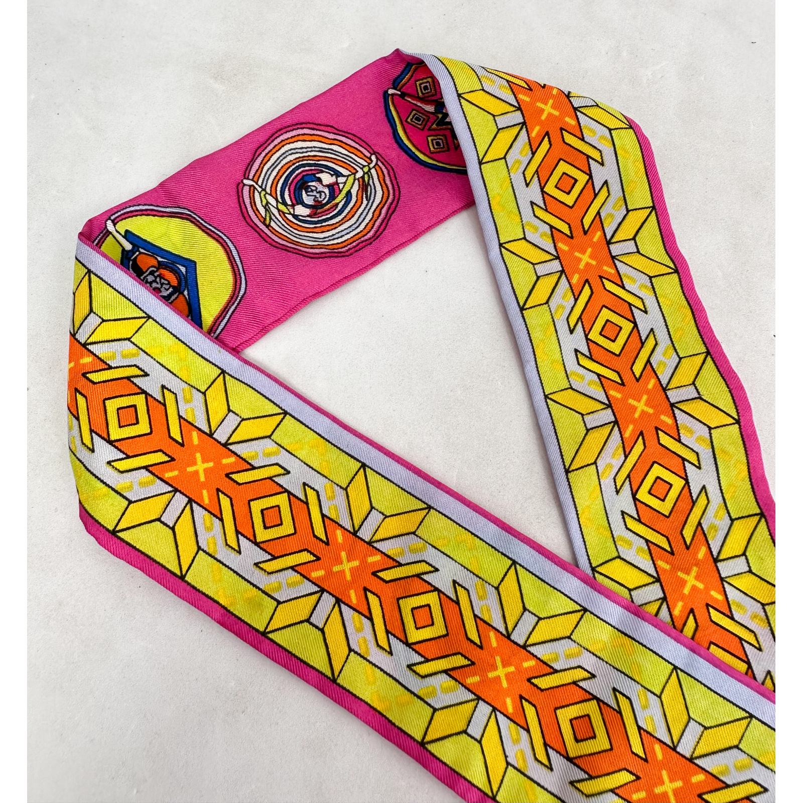 "Różowe jedwabne twilly z wielobarwną geometryczną grafikę z logo marki, dwustronne. Stan bardzo dobry. Skład: 100% jedwab"