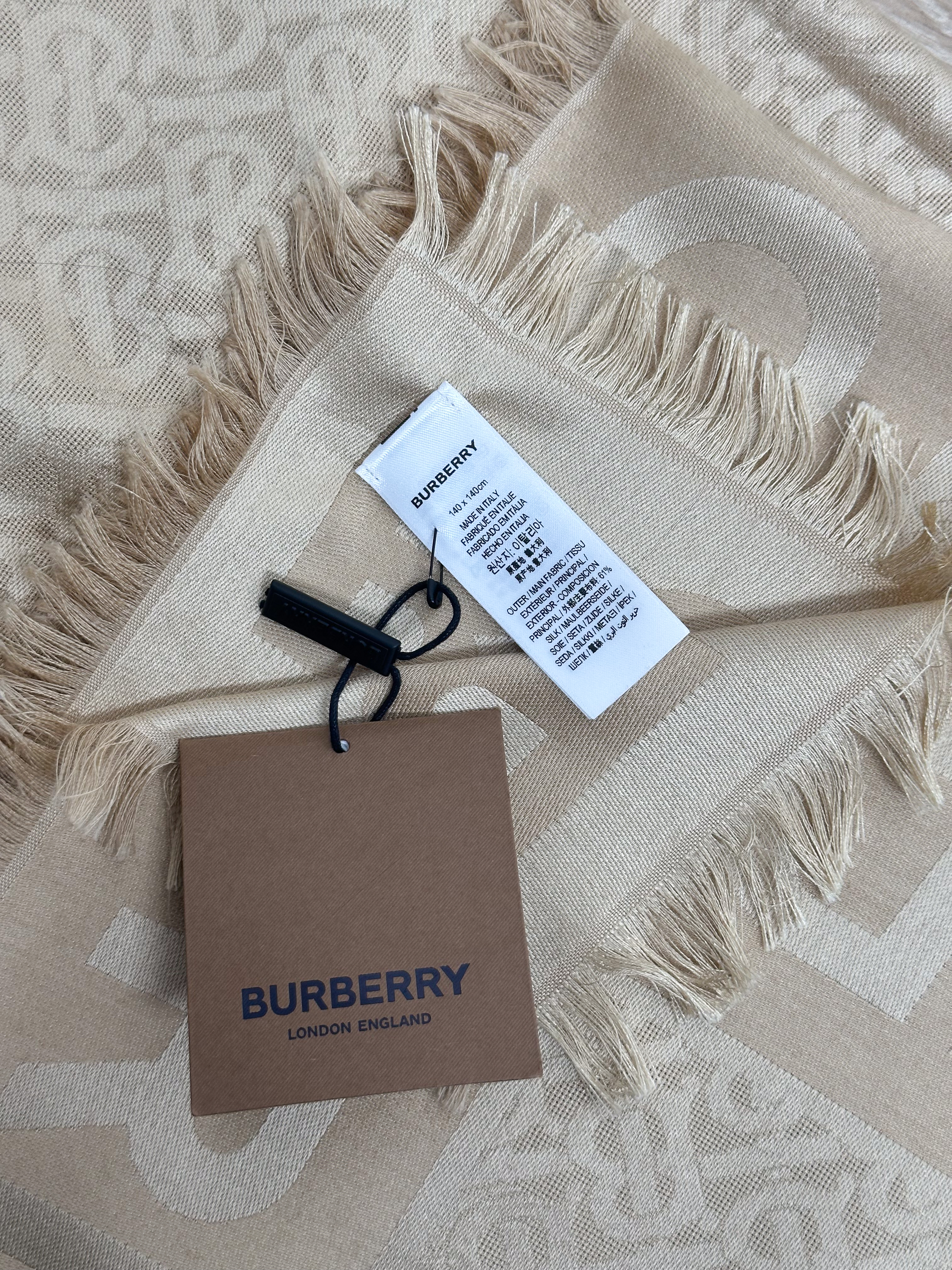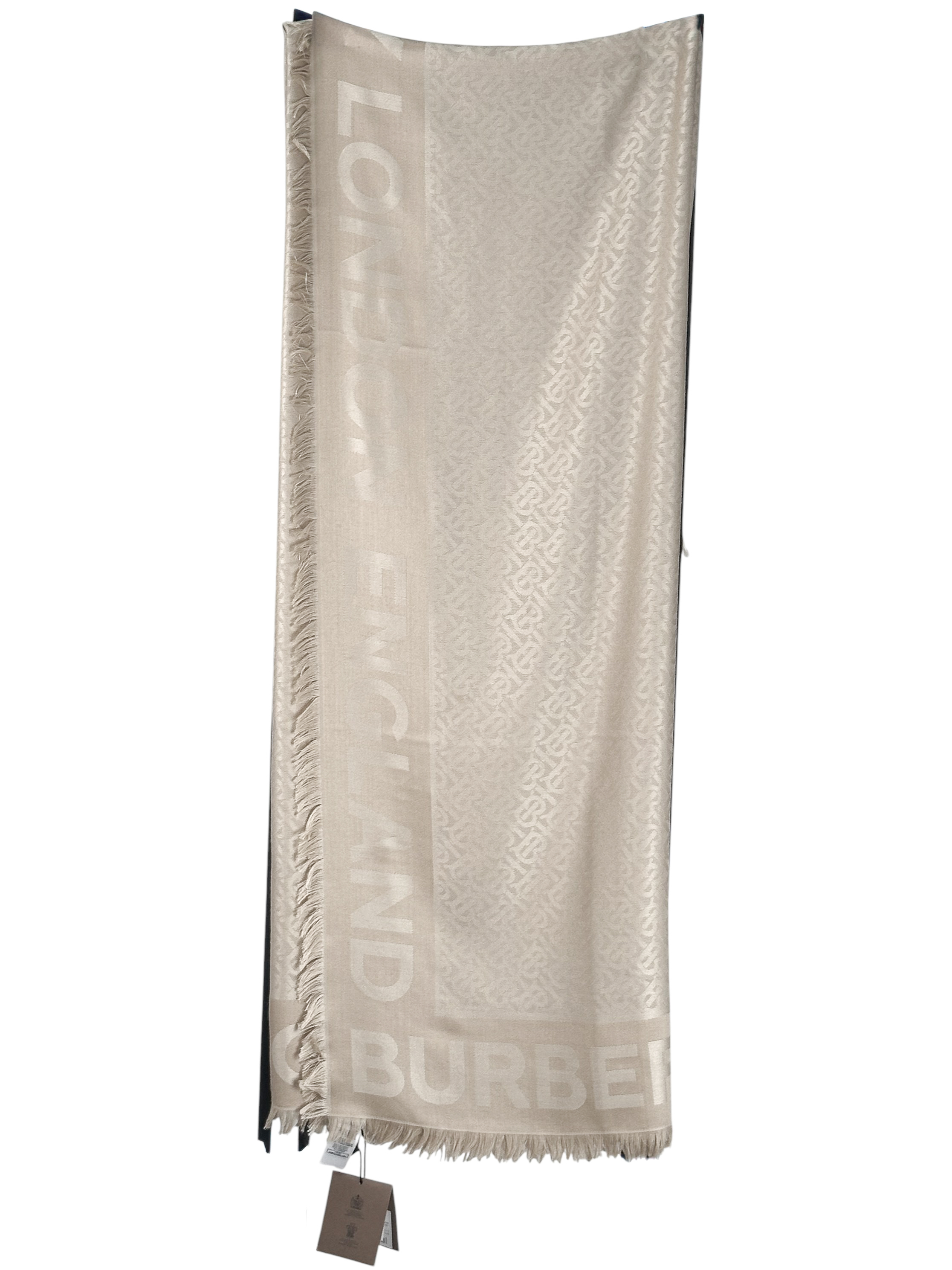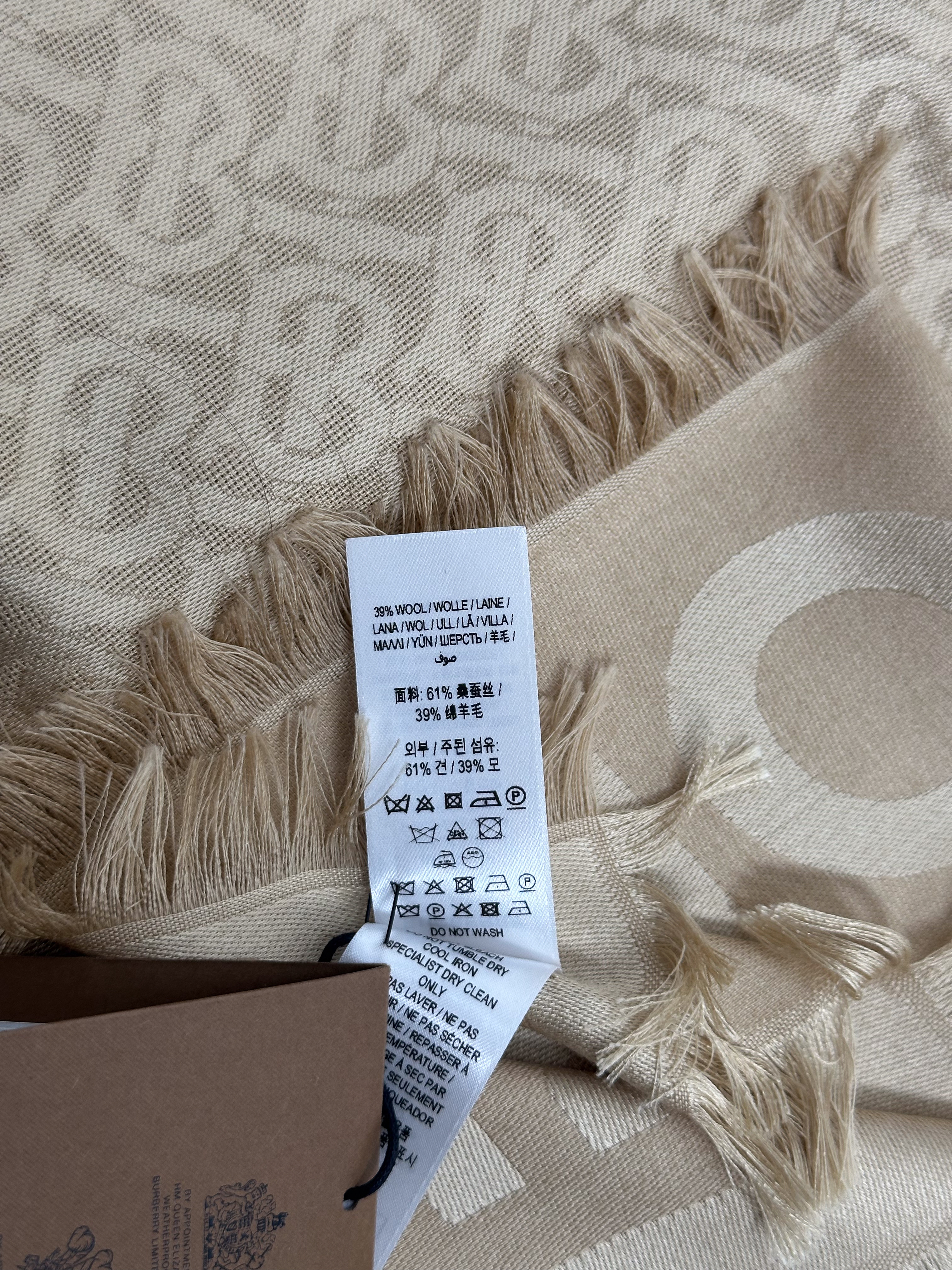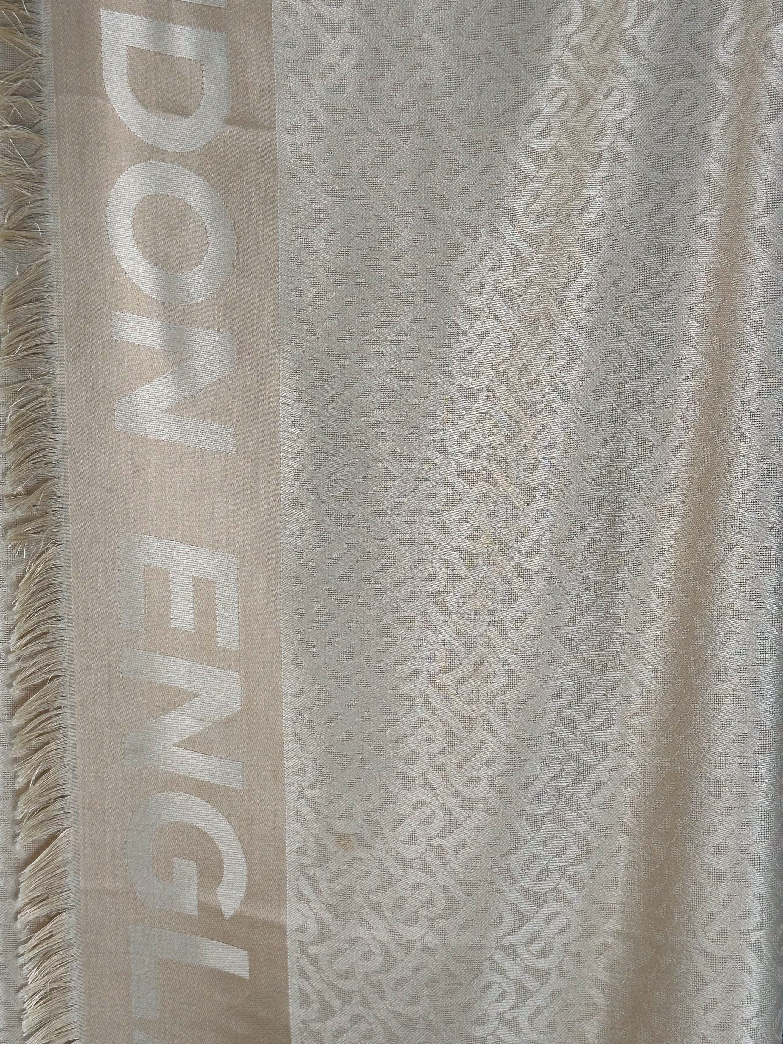 "Beżowa jedwabno-wełniana chusta w logo marki, brzegi zakończone frędzlami. Skład: 61% jedwab, 39 % wełna."