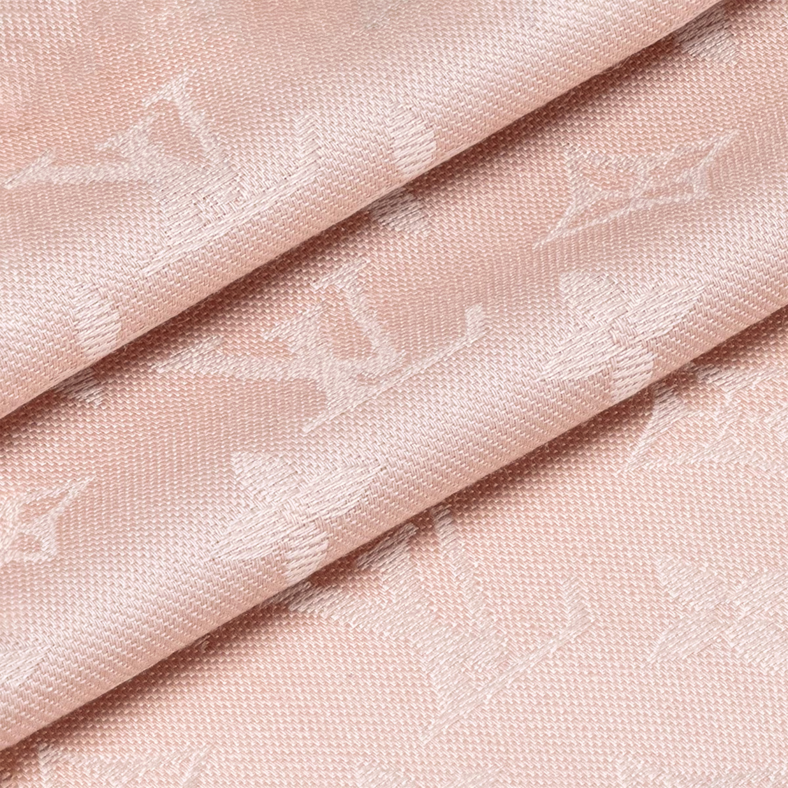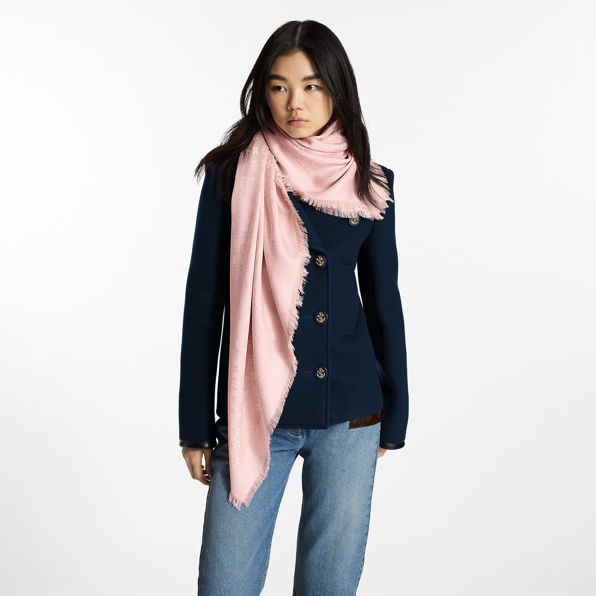 "Jedwabno-wełniana chusta w kolorze pudrowego różu w wyszyty monogram marki, zakończona krótkimi frędzlami, logo marki przy jednym rogu. Stan: nowy, bez pudełka. Skład: 60% jedwab, 40% wełna. Wymiary: 144cm x 142cm."