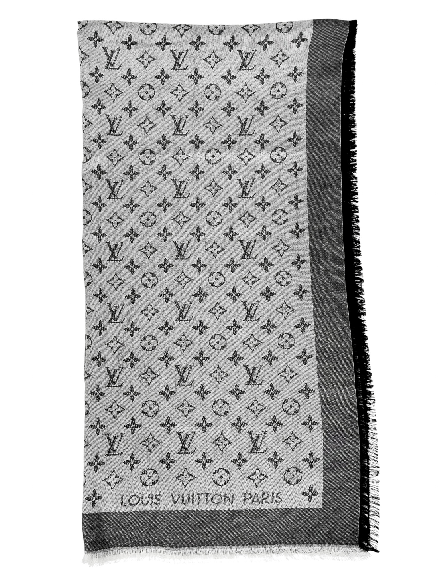 "Szara jedwabno-wełniana chusta w czarne logo marki, zakończona krótkimi frędzlami, logo marki przy jednym rogu. Stan bardzo dobry, posiada drobne zaciągnięcia. Skład: 60% jedwab, 40% wełna. Wymiary: 144cm x 138cm."