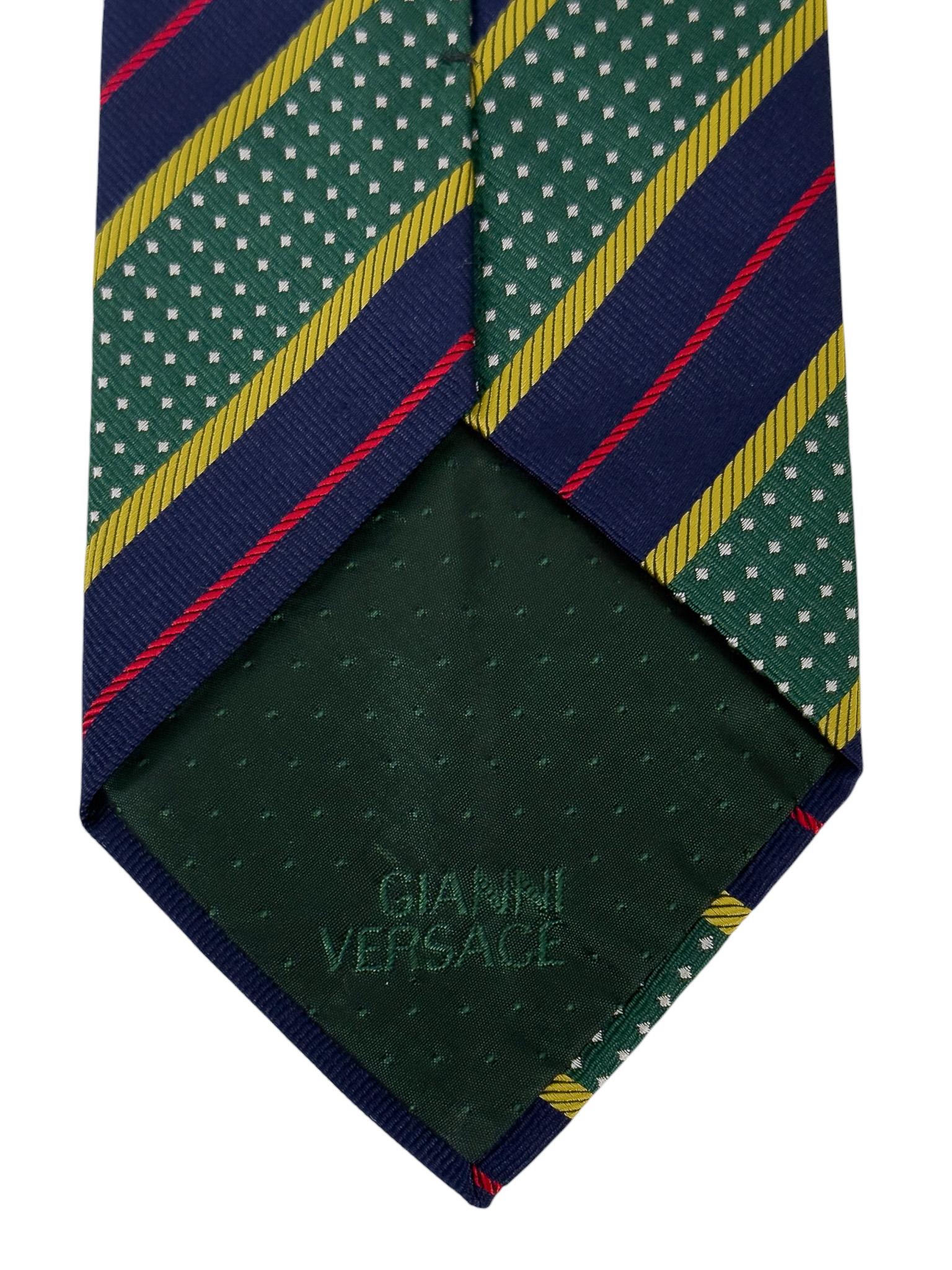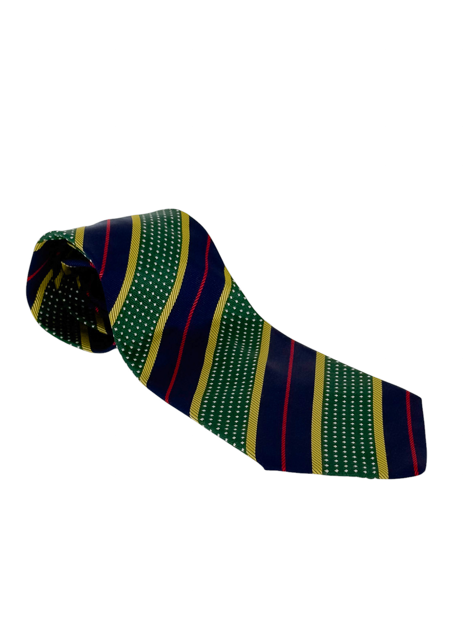 "Wielobarwny jedwabny krawat w odcieniach zieleni, granatu, żółci oraz czerwieni, w motyw pasków ułożonych na skos. Stan bardzo dobry. Skład: 100% jedwab."