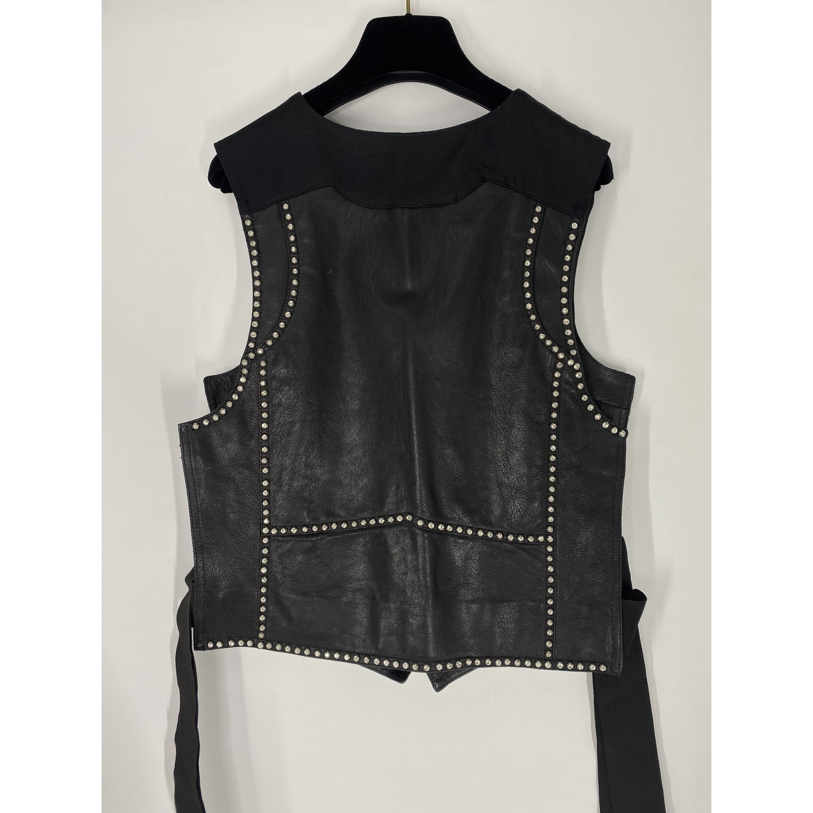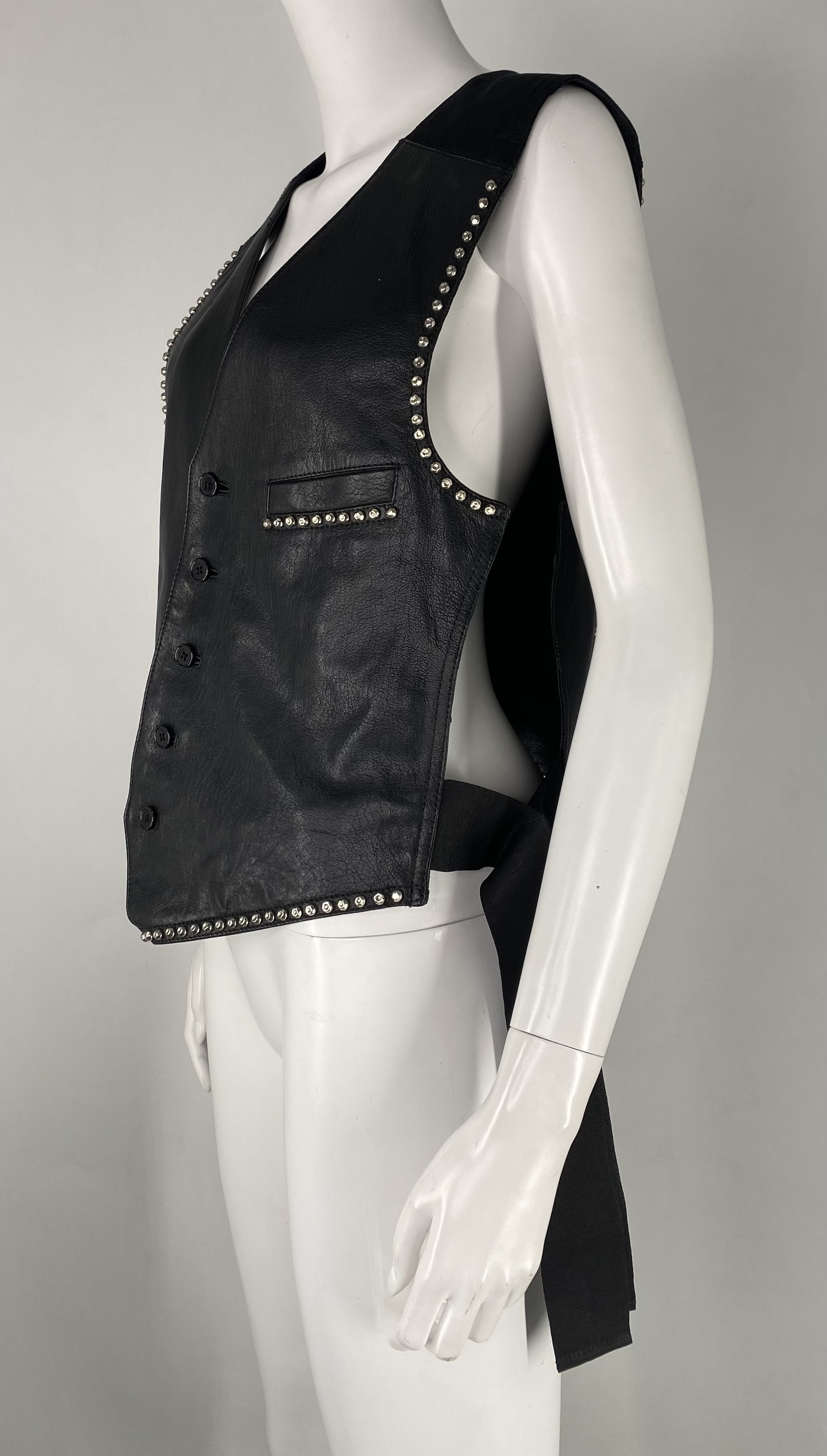 "skórzana kamizelka z srebrnymi nitami, zapinana na 5 guzików, z boku doszyty czarne taśmy. Długość 58 cm, szerokość biust 43 cm"