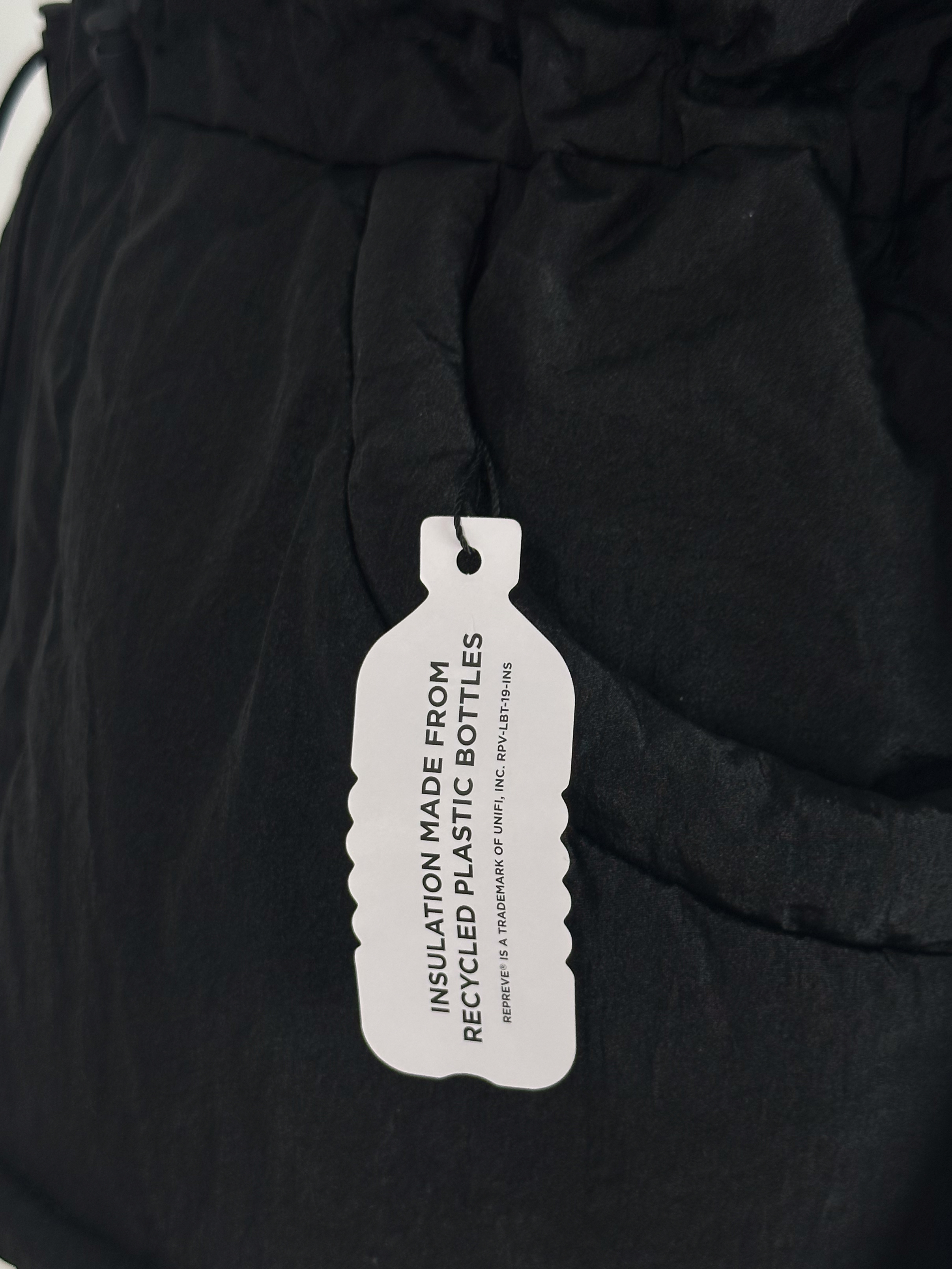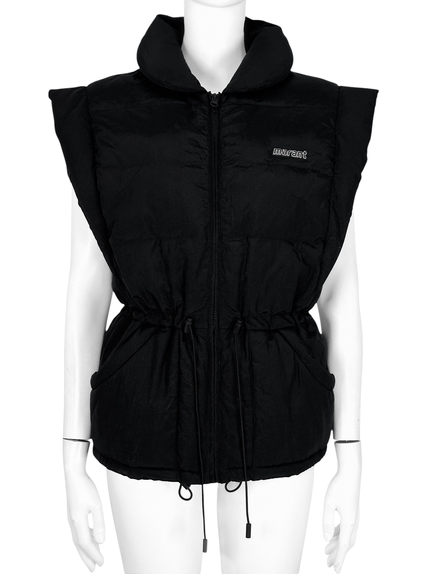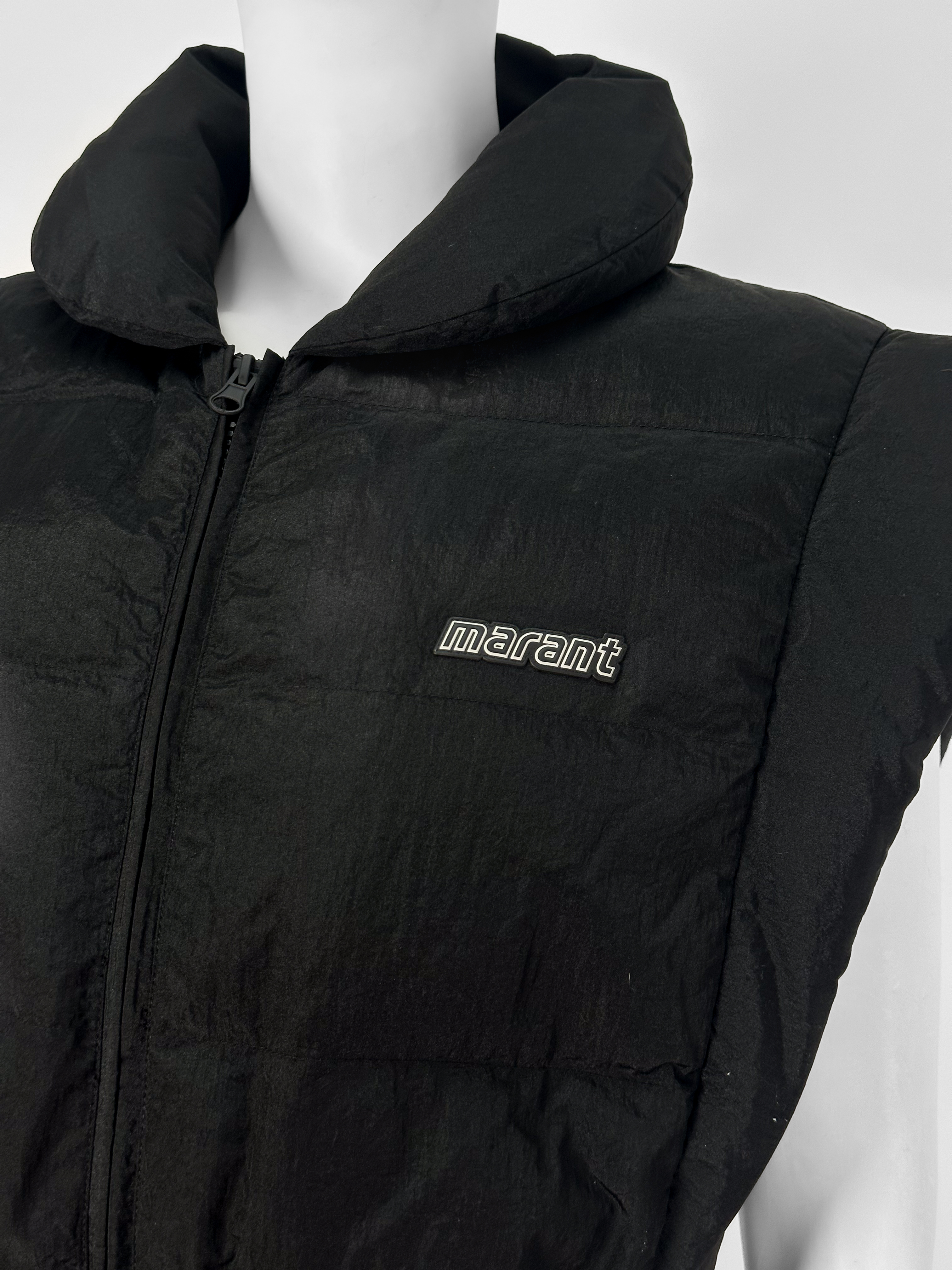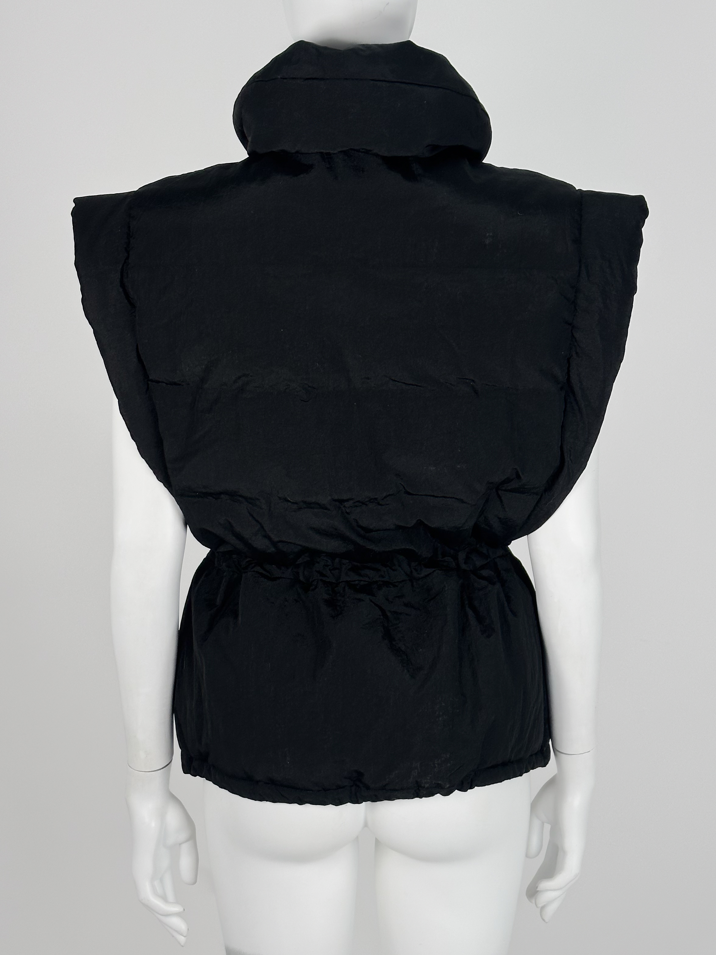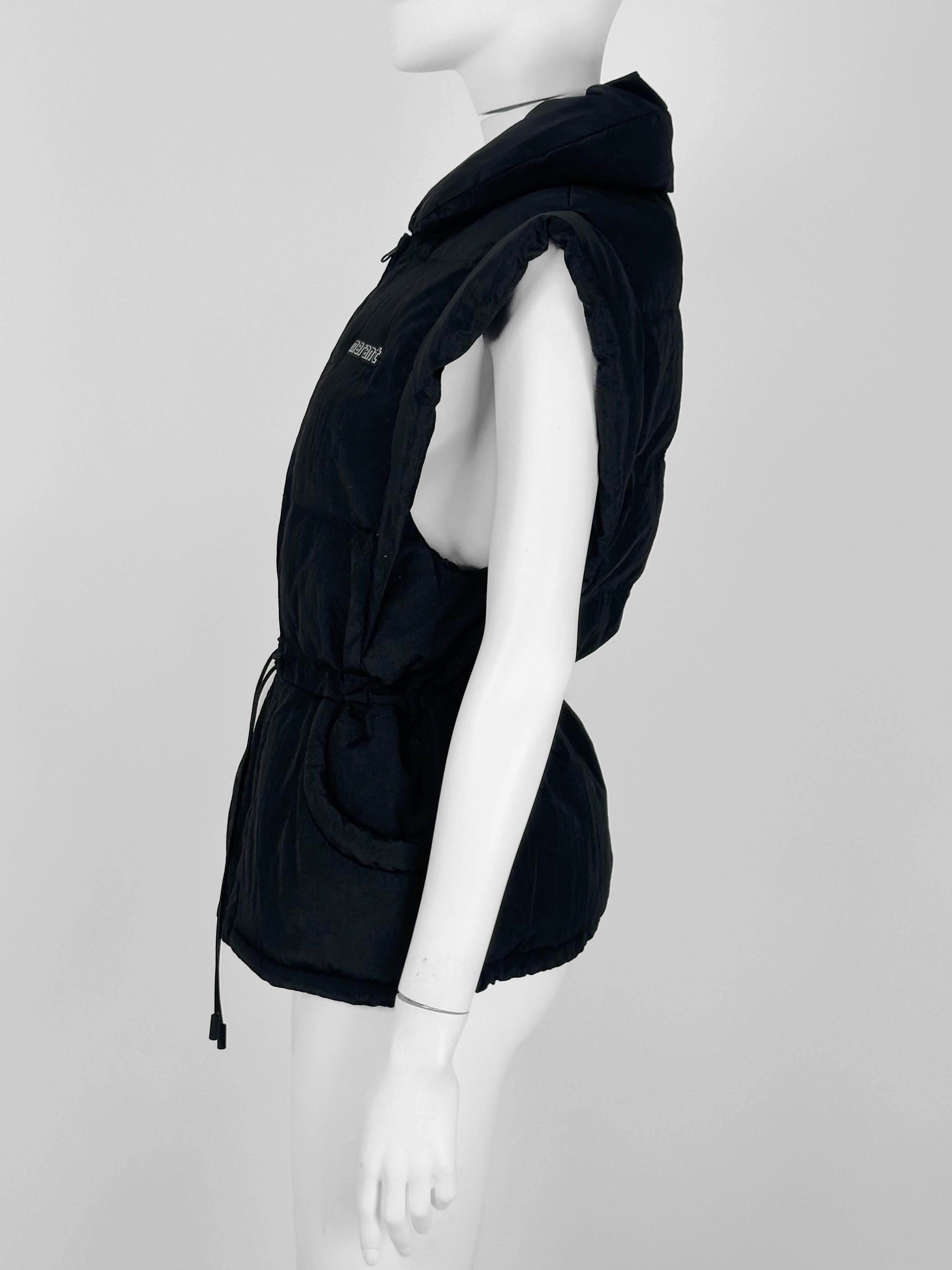 "Czarna kamizelka, logo na przodzie, taliowana, zapinana na suwak, dwie kryte kieszenie po bokach. Rozmiar 38. Stan nowa. Wymiary: szerokość ramiona 54 cm, szerokość pod pachami 44cm, długość 68 cm."