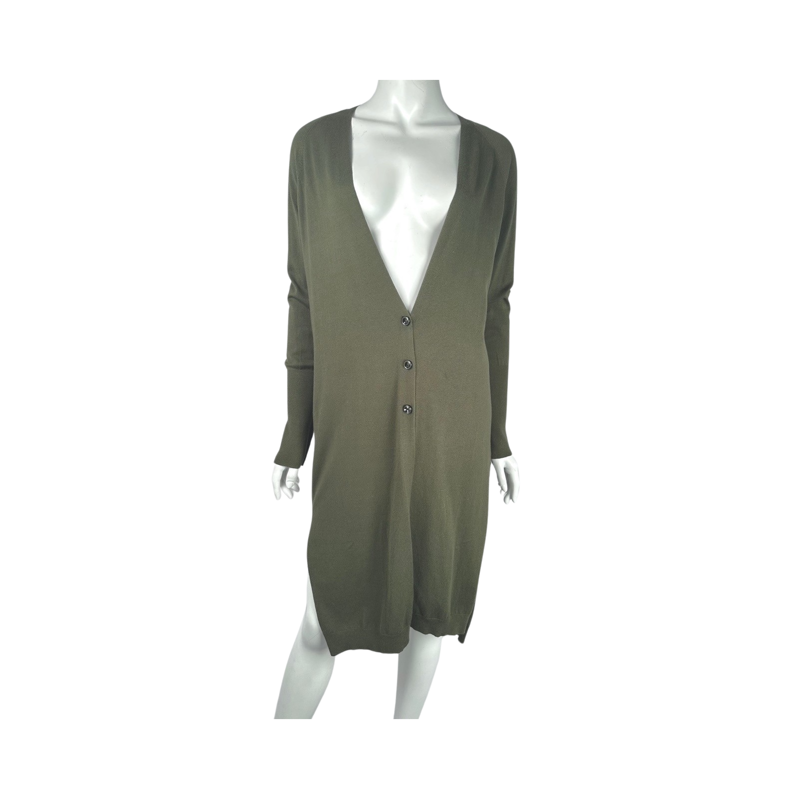 "Długi, zielony kardigan. Jego cechą wyróżniającą na tle innych kardiganów jest zapięcie na trzy guziki w połowie jego długości. Drobne guziczki zostały również przyszyte i użyte jako element ozdobny przy mankietach, są one rozpinane. Po całej ich długości naszyty jest wąski ściągacz. Znajdziemy go również przy bokach oraz na dole swetra. Od spodu, po bokach, ma dwa, dość długie rozcięcia. Stan: bardzo dobry. Rozmiar: M. Skład: 79% wiskoza, 22% poliamid. Wymiary: dł. mierzona od karku: 119 cm., szer. (mierzona od pachy do pachy): 45 cm., dł. rękawa (mierzona od pachy): 50 cm., szer. mankietu: 9 cm., szer. (mierzona na linii pachy): 18 cm."