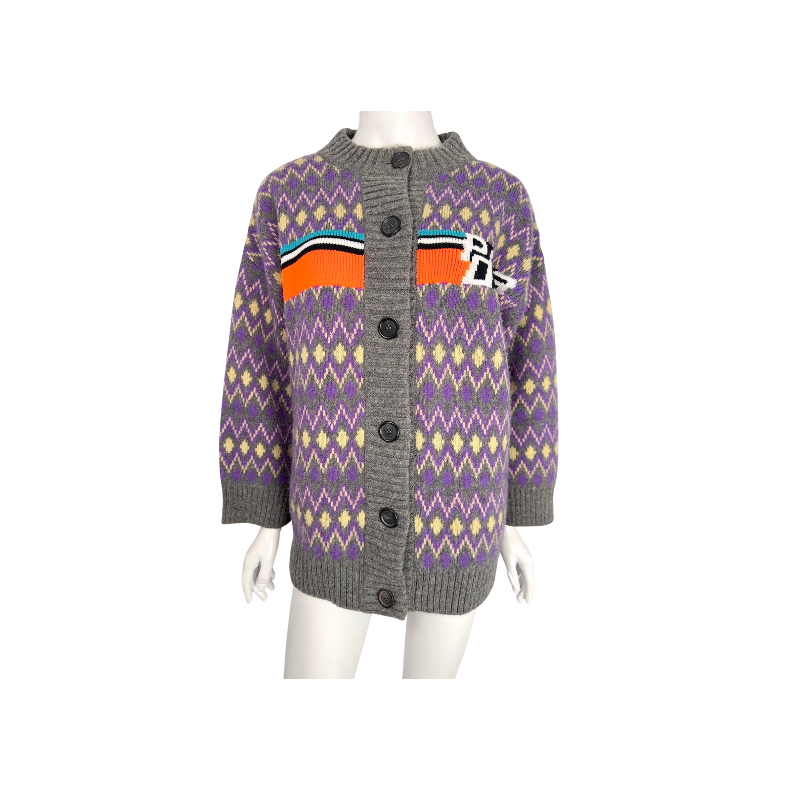 "Szary kardigan w fioletowo-żółty wzór, na wysokości biustu wyszyte biało-czarne logo marki połączone z paskami w odcieniach niebieskiego i pomarańczowego, oversize, zapinany na sześć guzików, zakończony ściągaczem przy dekolcie, mankietach oraz na dole. Rozmiar z metki IT 38. Skład: 95% wełna dziewicza, 5% poliester."
