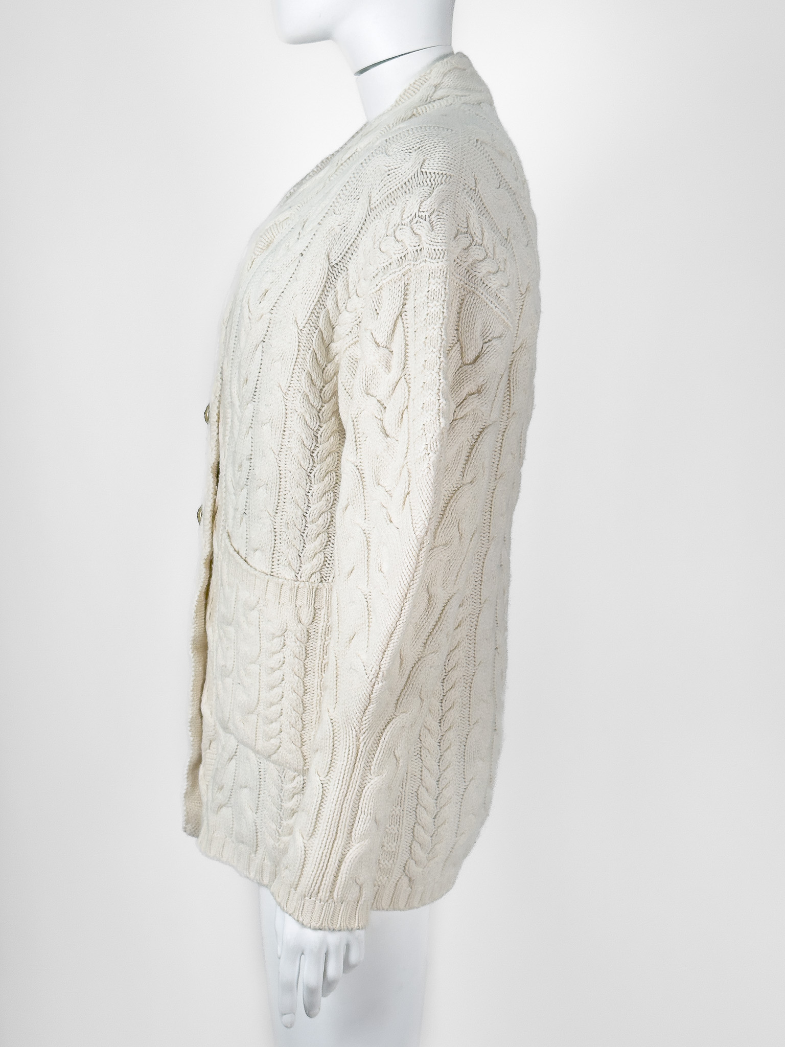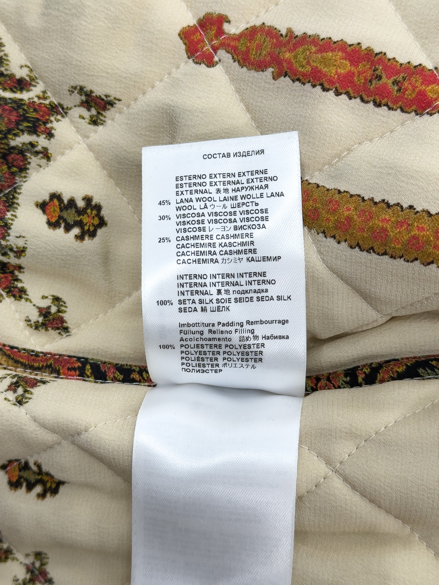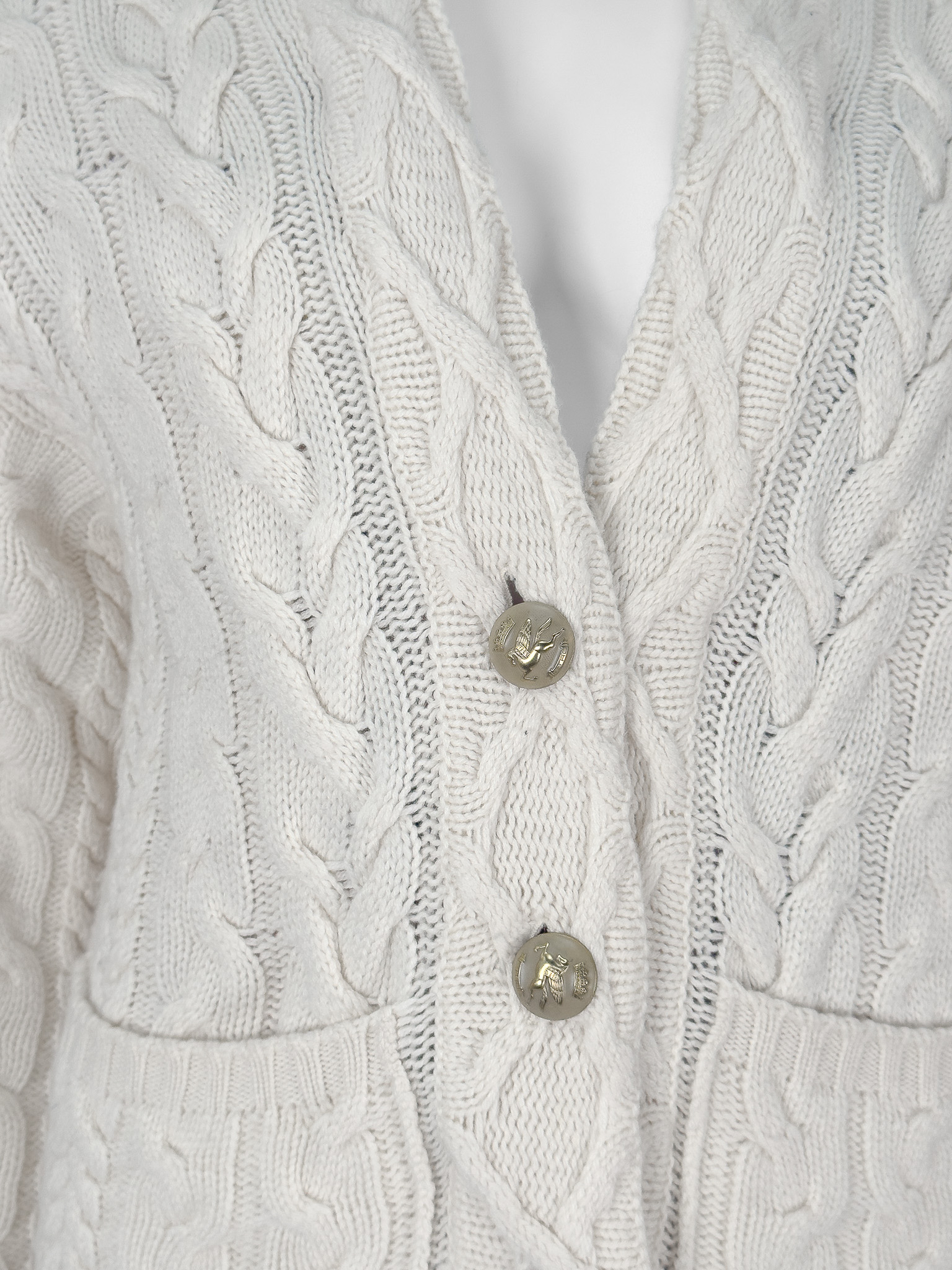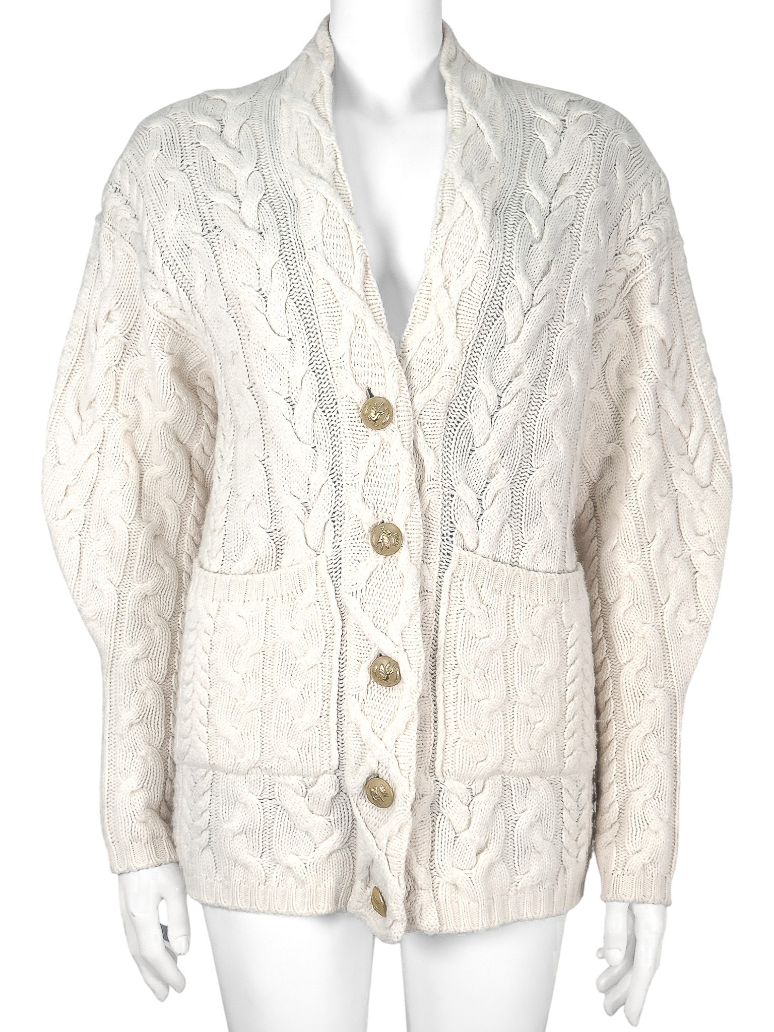 "Beżowy kardigan zapinany na złote guziki, kolorowa podszewka ( odpinana) w kolorach charakterystycznych dla marki. Rozmiar z metki 38. Skład: 45% wełna, 30% wiskoza, 25% kaszmir. Wymiary: szerokość mierzona od pachy do pachy 51cm, długość całkowita 69cm."