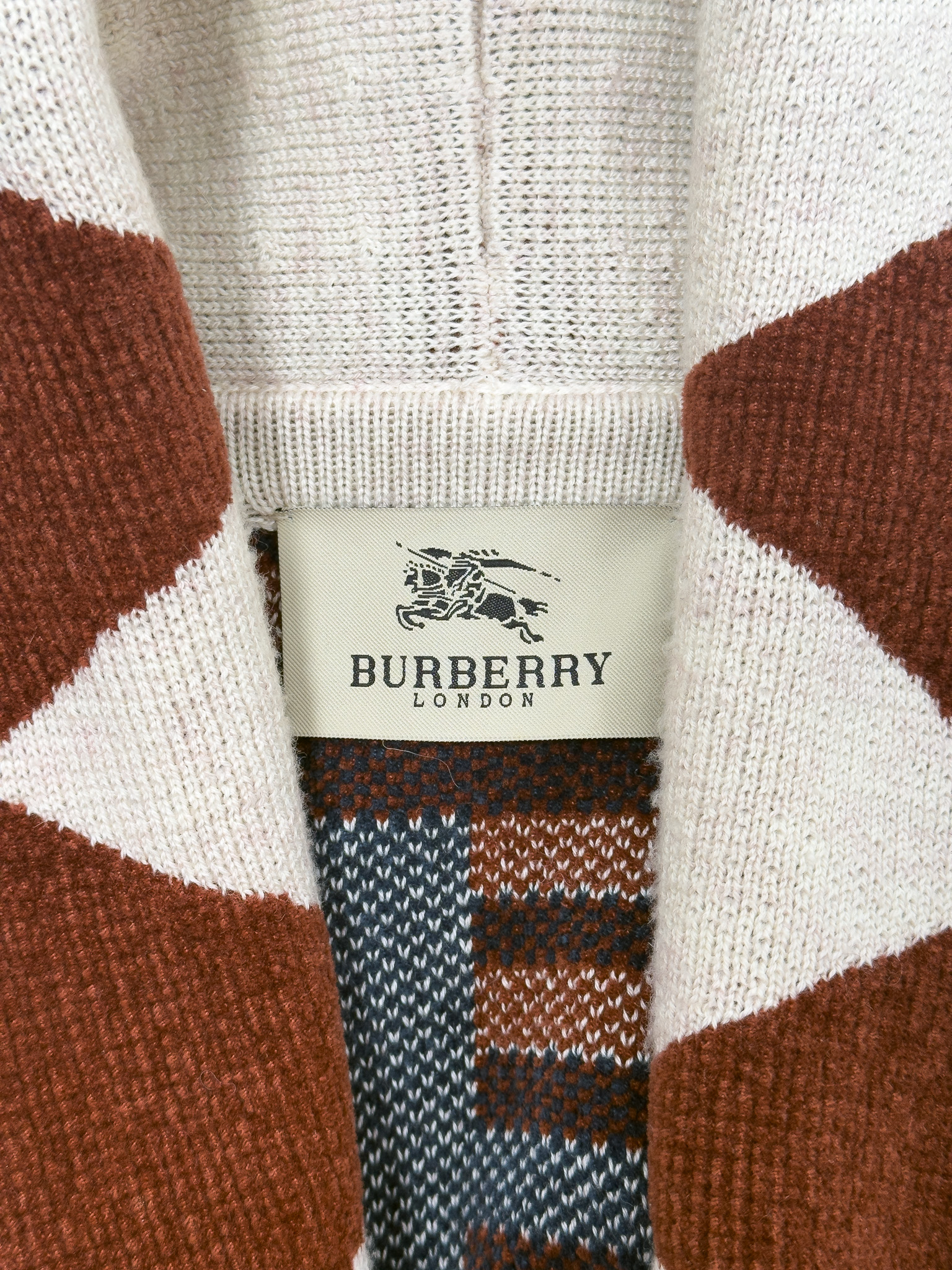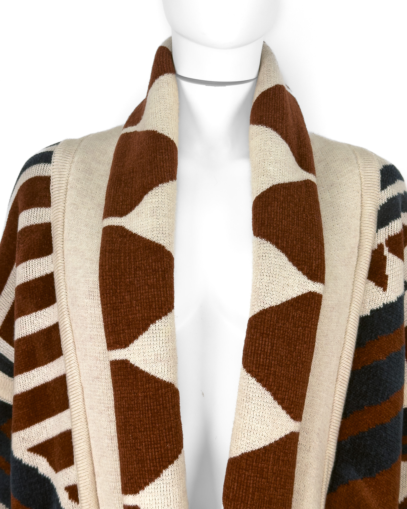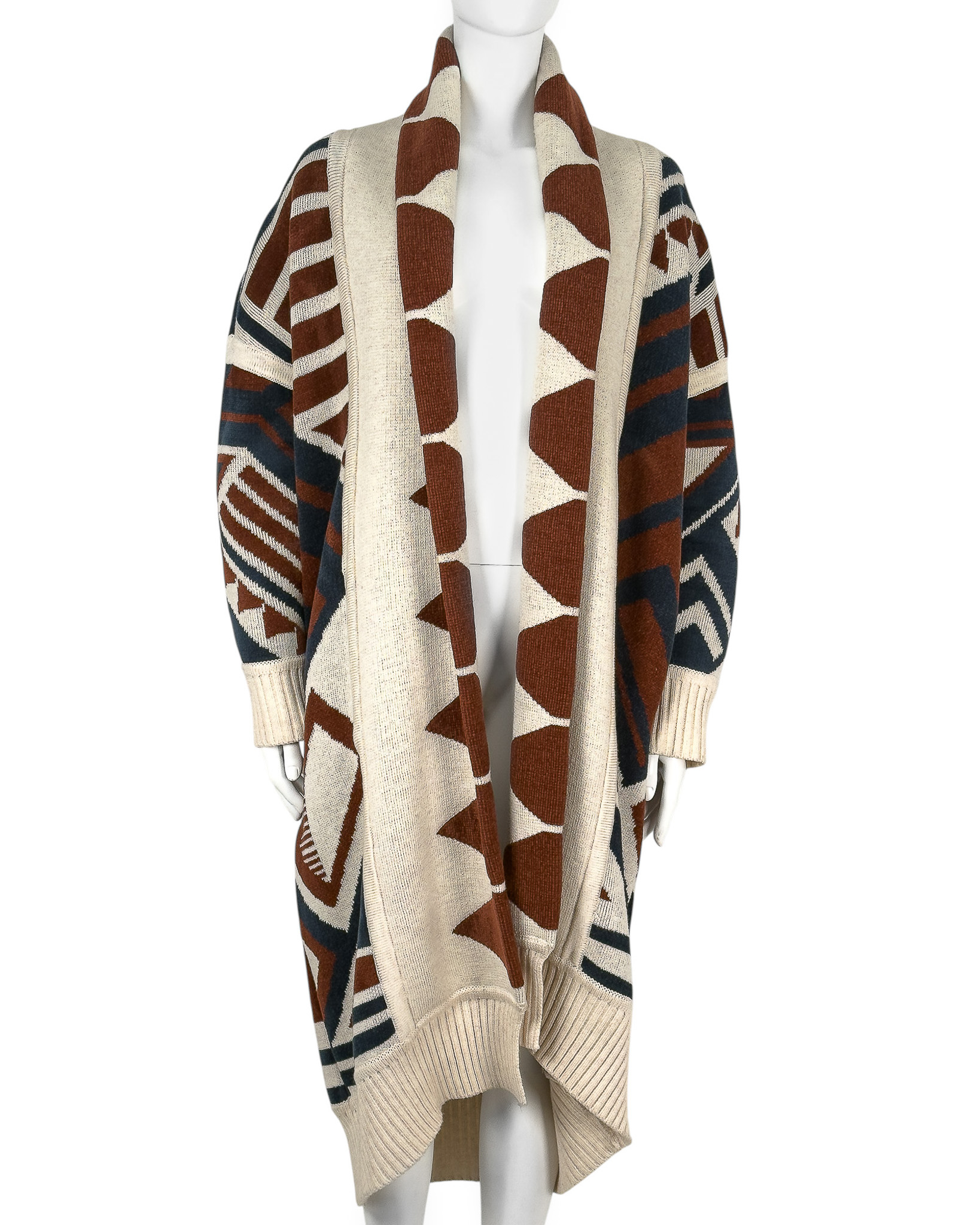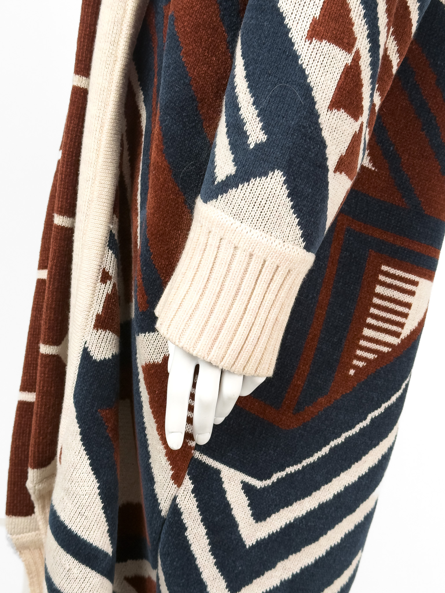 "Długi gruby kardigan ozdobiony kolorowym wzorem w odcieniach brązu, niebieskiego oraz ecru, ciężki, odwijany kołnierz, wykończony prążkowanym ściągaczem, niezapinany, dwie kryte kieszenie po bokach. Brak metki z rozmiarem oraz składem. Rozmiarowo wypada jak L. Wymiary: szerokość mierzona od pachy do pachy 71cm, długość całkowita 109cm."