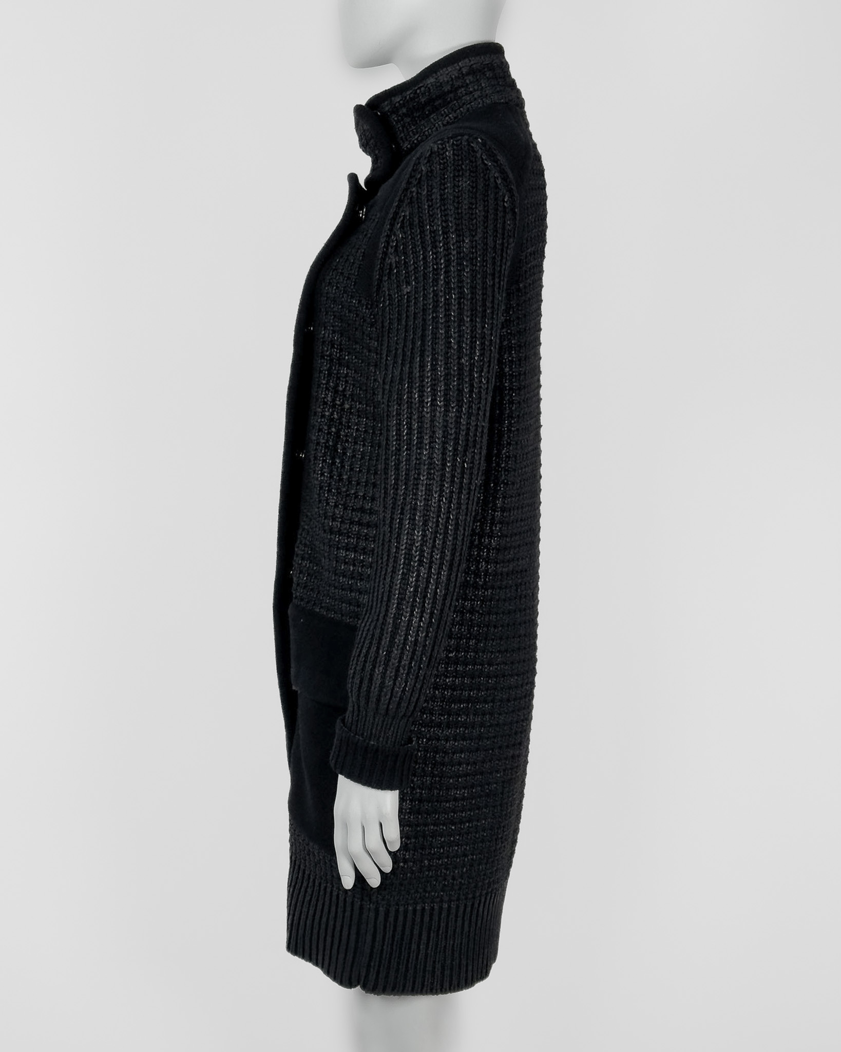 "Grafitowo-czarny długi kardigan z domieszką wełny w składzie, z kołnierzem zapinanym pod szyję, wykonany z błyszczącej, woskowanej nitki, zapinany na napy po całej długości. Posiada dwie duże kieszenie z przodu. Rozmiar z metki IT 42. Stan bardzo dobry. Skład: 80% wełna, 15% poliamid, 5% wiskoza. Wymiary: szerokość mierzona od pachy do pachy 46cm, długość całkowita 92cm."