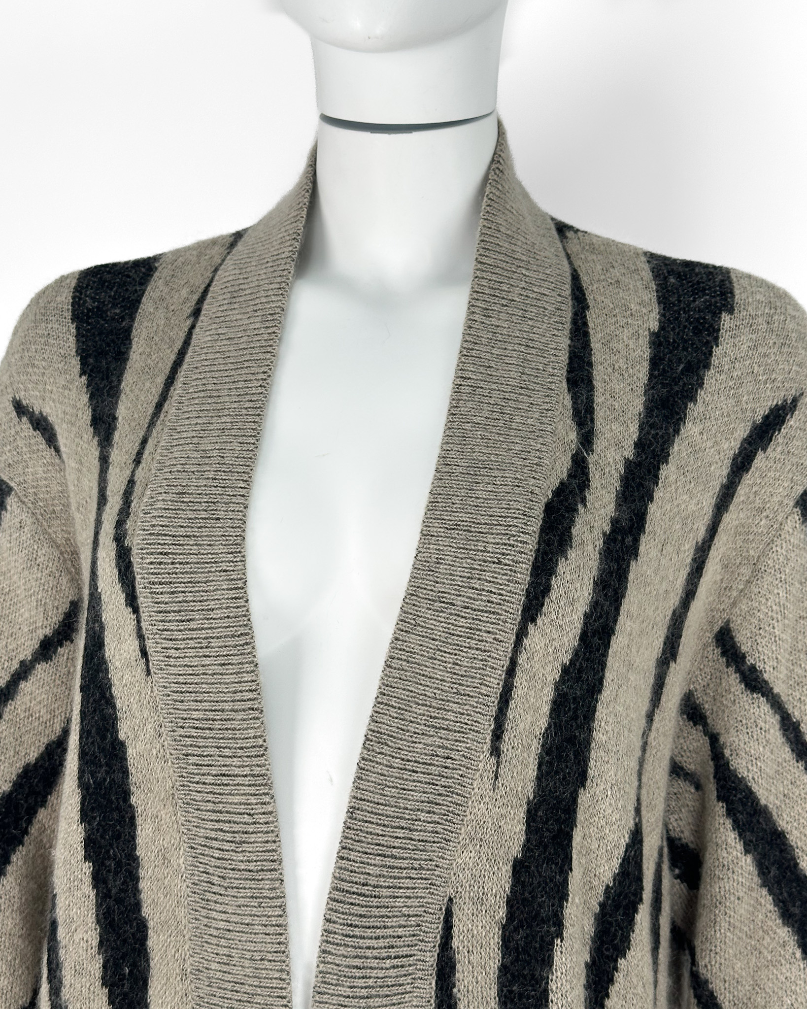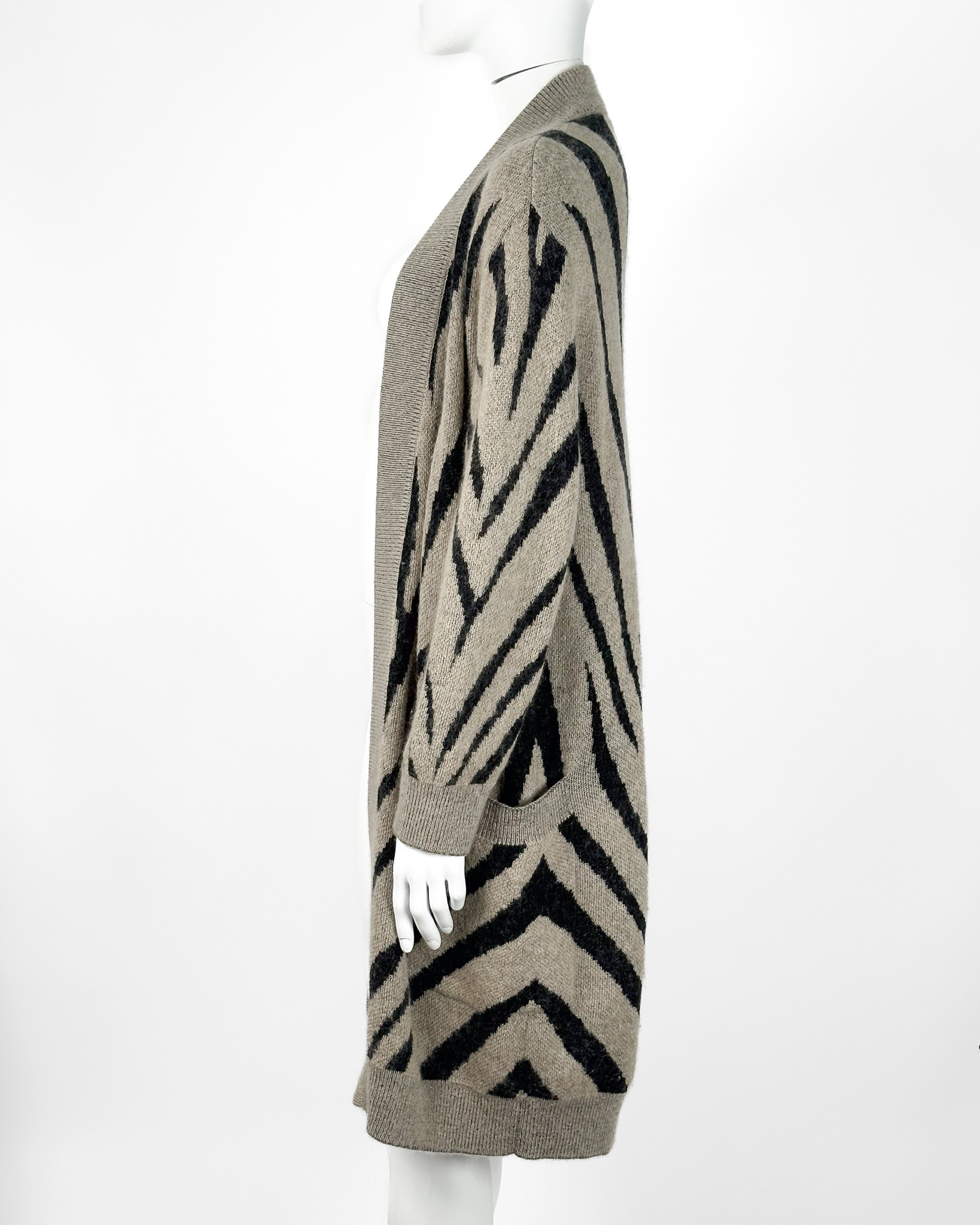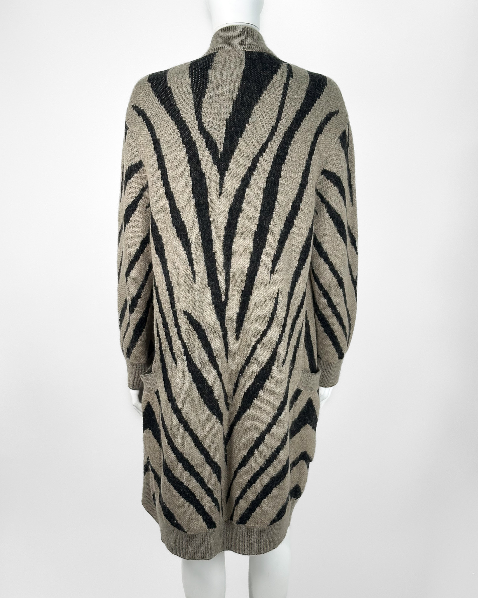 "Długi beżowo-czarny kardigan, wzór zebry, dwie kieszenie po bokach, niezapiany, wykończony prążkowanym ściągaczem. Stan bardzo dobry. Rozmiar z metki S. Skład: 34 % moher, 26% wiskoza, 18% poliamid, 16% poliester, 6% wełna. Wymiary: szerokość mierzona od pachy do pachy 50cm, długość całkowita 98cm."