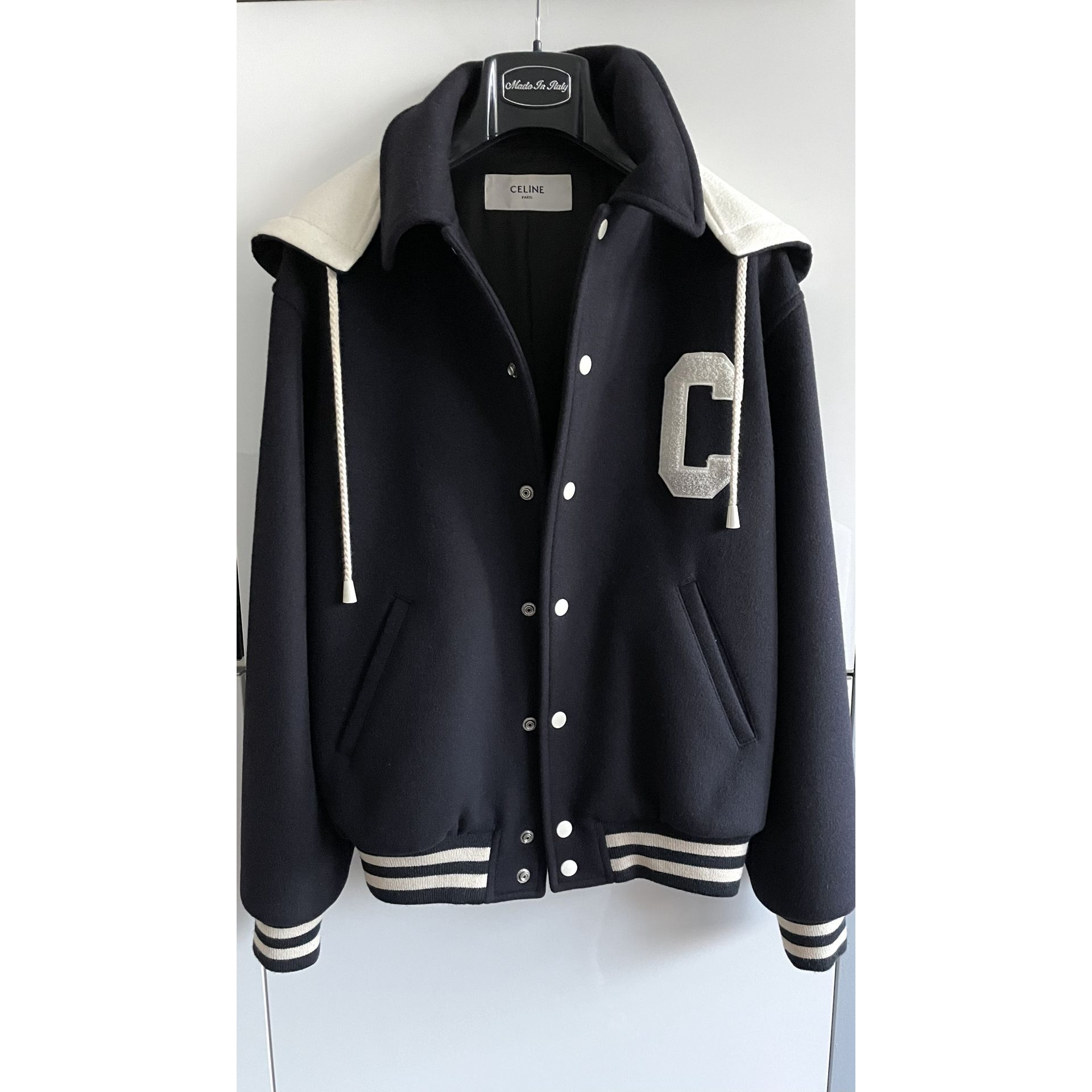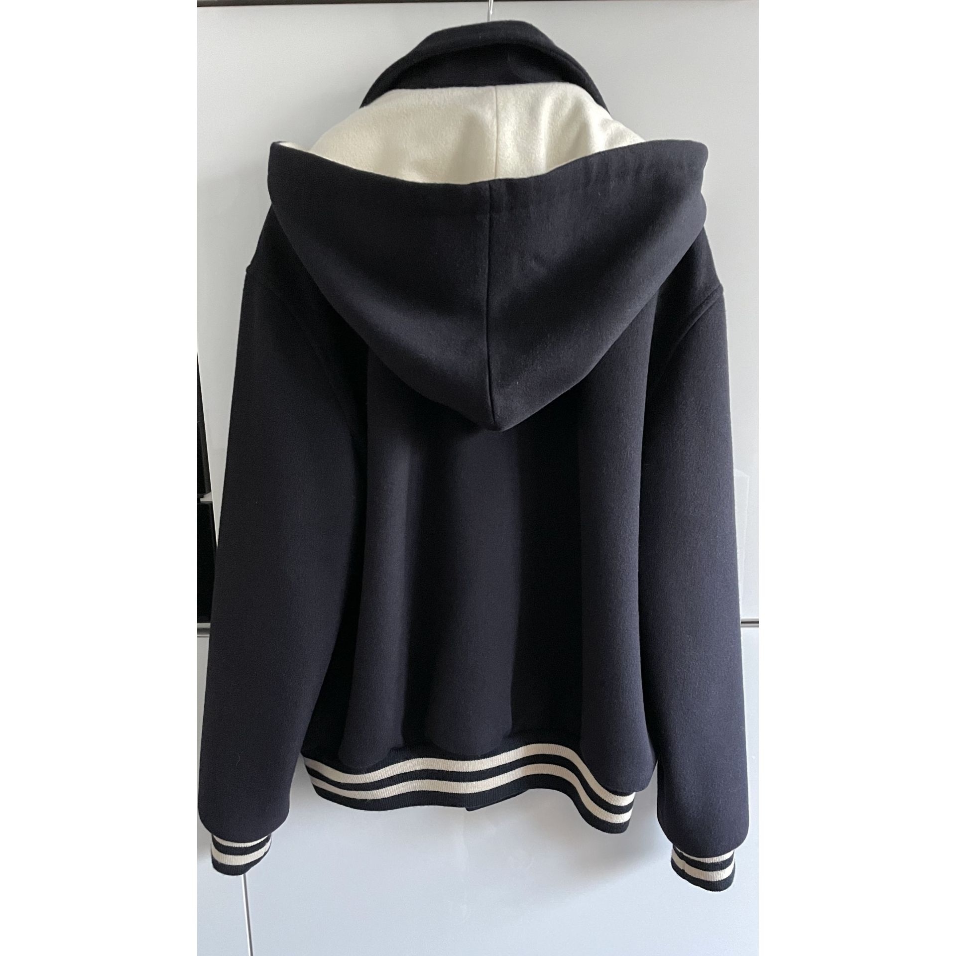 "KURTKA BOMBERKA Z GRUBEGO MIĘSISTEGO KASZMIRU MARKI CELINE, KOLOR GRANATOWY W POŁACZENIU ZE ZŁAMANĄ BIELĄ. NA PODSZEWCE, Z ODSUWANYM KAPTUREM, ZAPINANA NA BIAŁE ZATRZASKI. ROZMIAR Z METKI 36 ALE JEST OVERSIZE - PASUJE NA 36 I 38. STAN BARDZO DOBRY. KOSZT TYCH KURTEK TO 17000."
