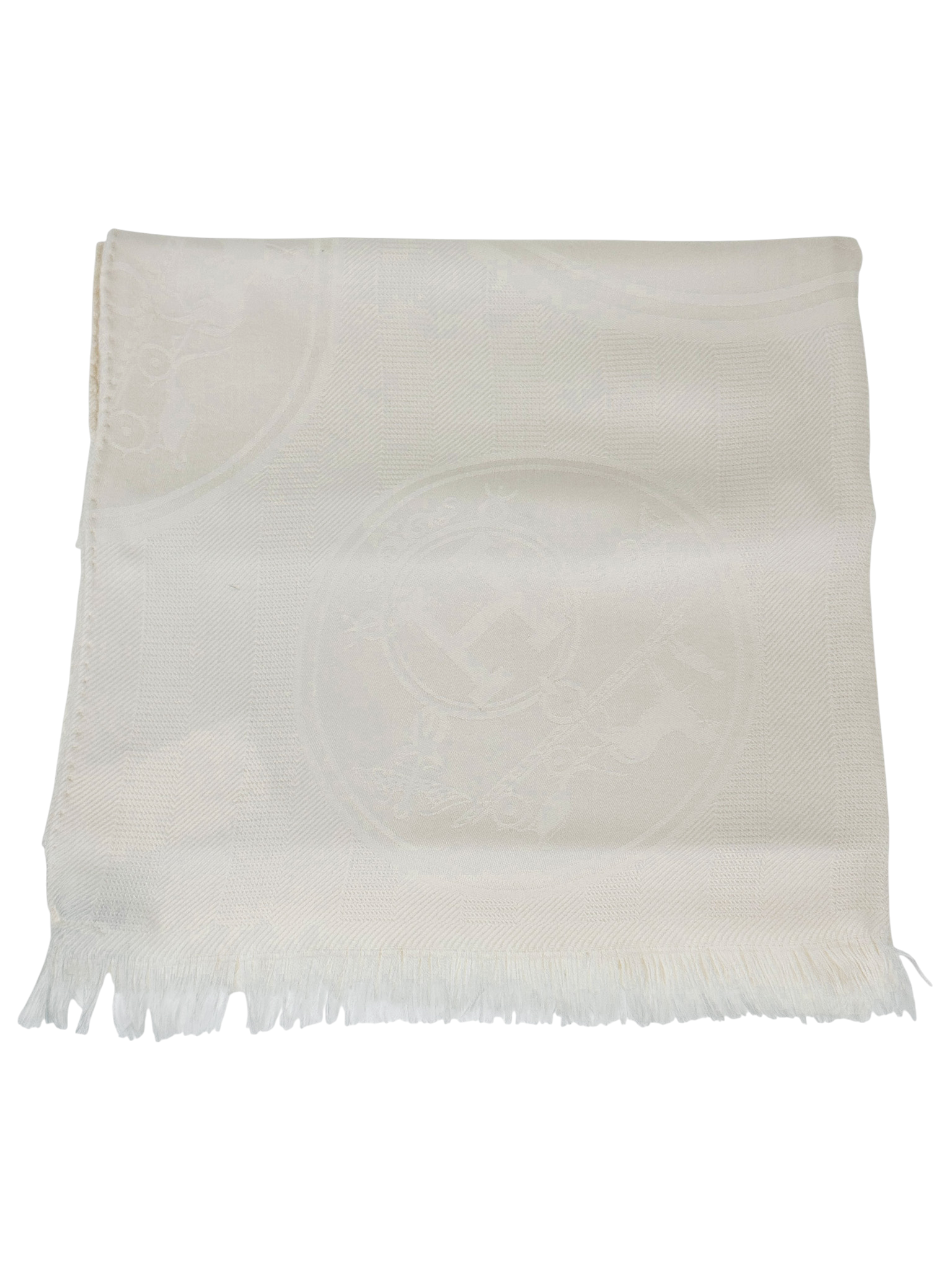 "model: New Libris stole. Kremowy kaszmirowo-jedwabny szal, we wzór marki. Skład: 85% kaszmir, 15% jedwab. Stan: bardzo dobry. Wymiary: 75cm x 212cm."