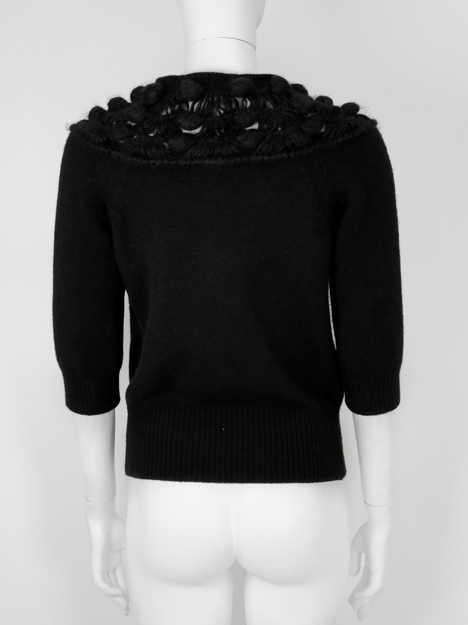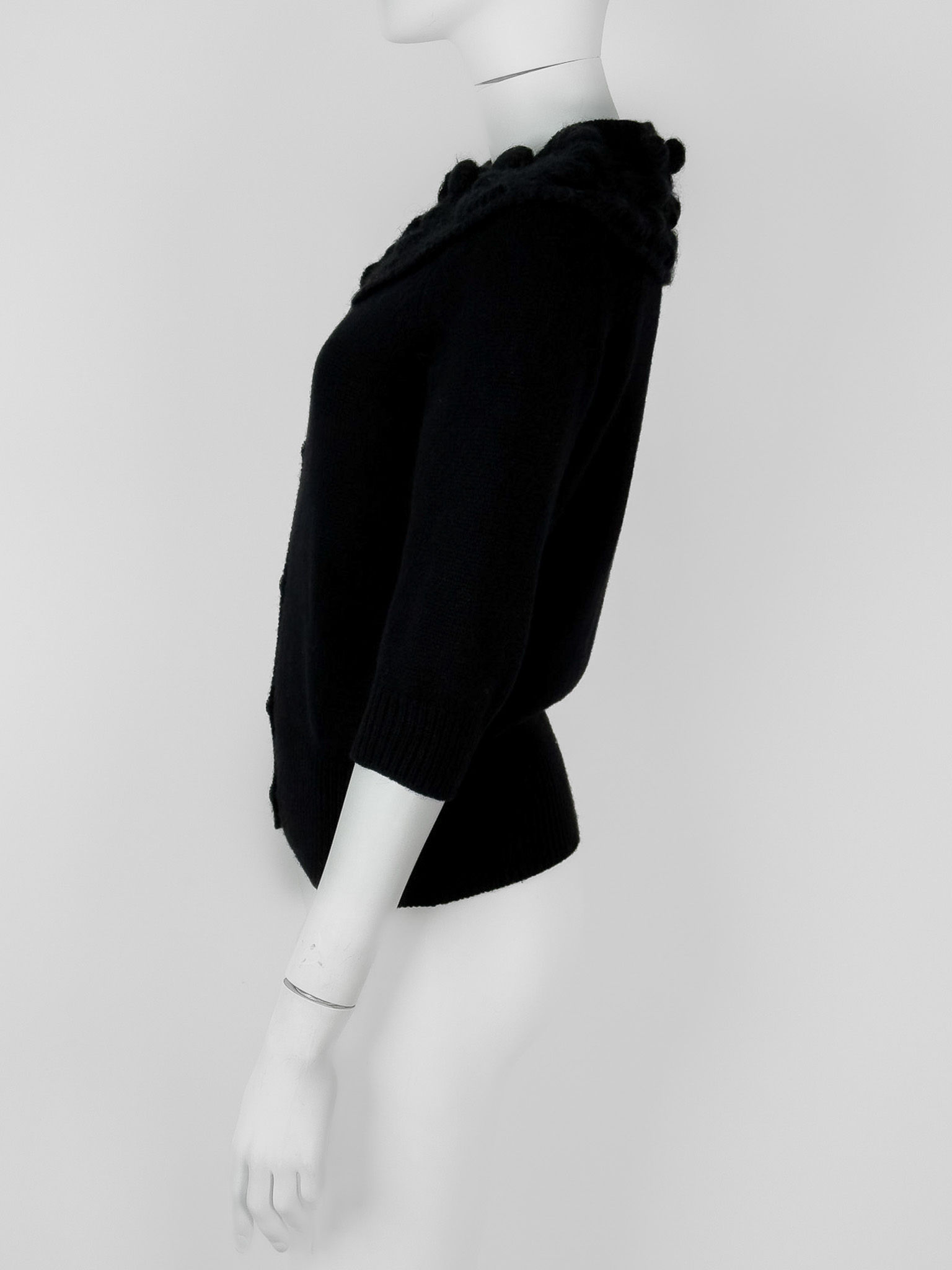 "Czarny kaszmirowy kardigan z domieszką moheru w składzie, zapinany na guziki z grafiką korony z logo marki, ażurowy w górnej części ozdobiony naszytymi kulkami, zaokrąglony dekolt, rękaw o długości 3/4, wykończony ściągaczem. Stan bardzo dobry. Rozmiar z metki IT 40. Skład: 92% kaszmir, 5% moher, 2% poliamid, 1% wełna. Wymiary: szerokość mierzona do pachy do pachy 44cm, długość całkowita 58cm."