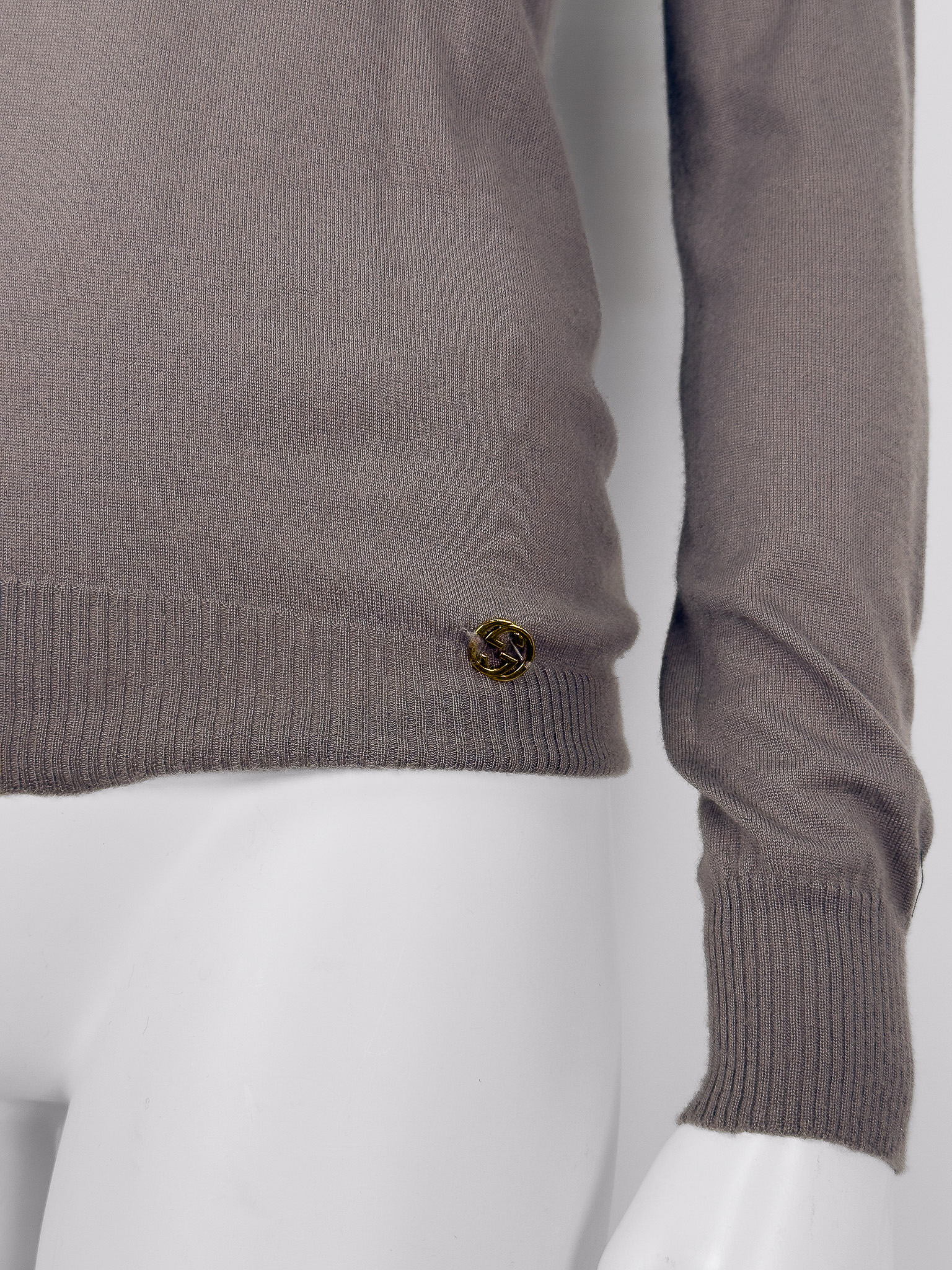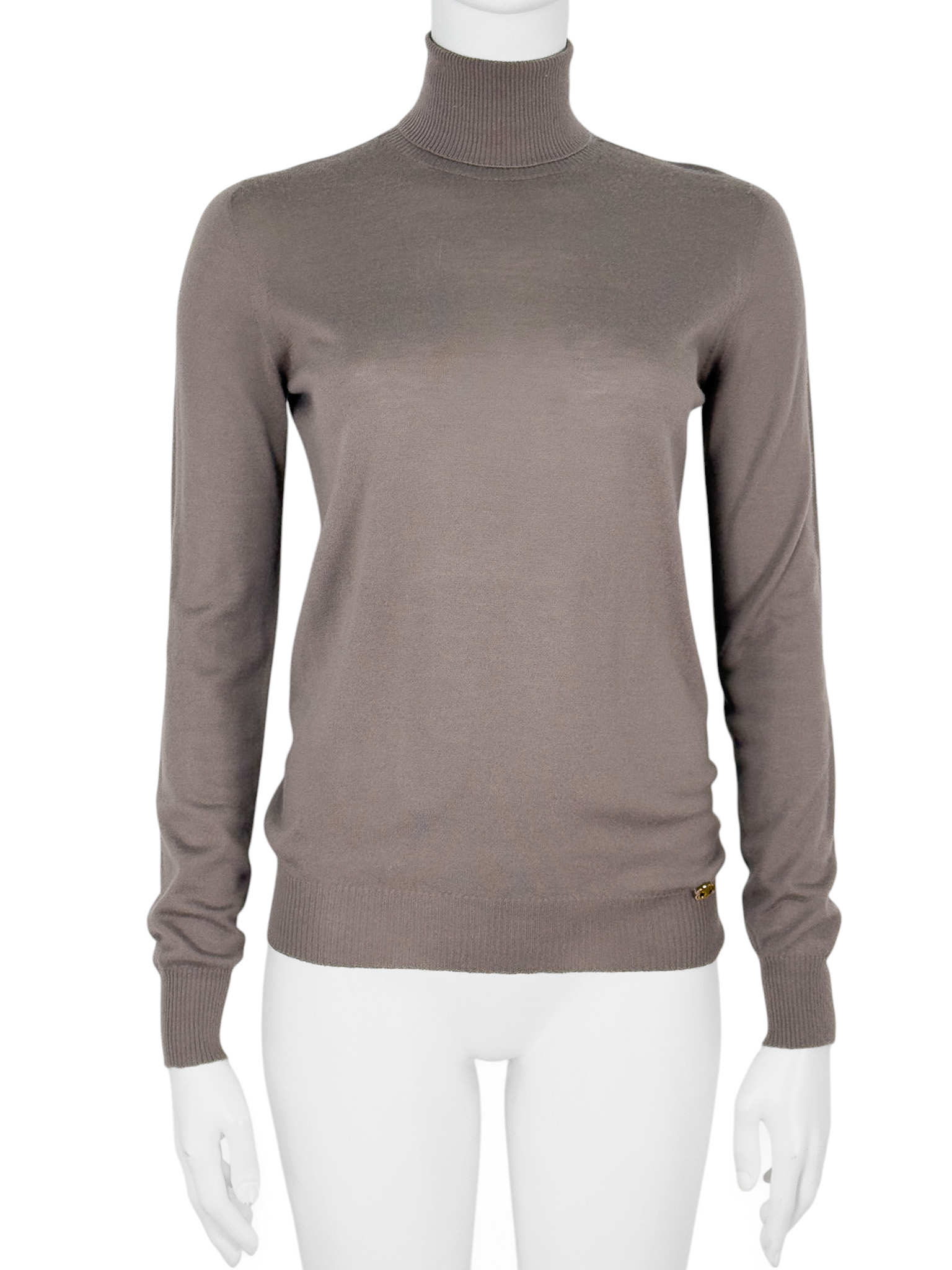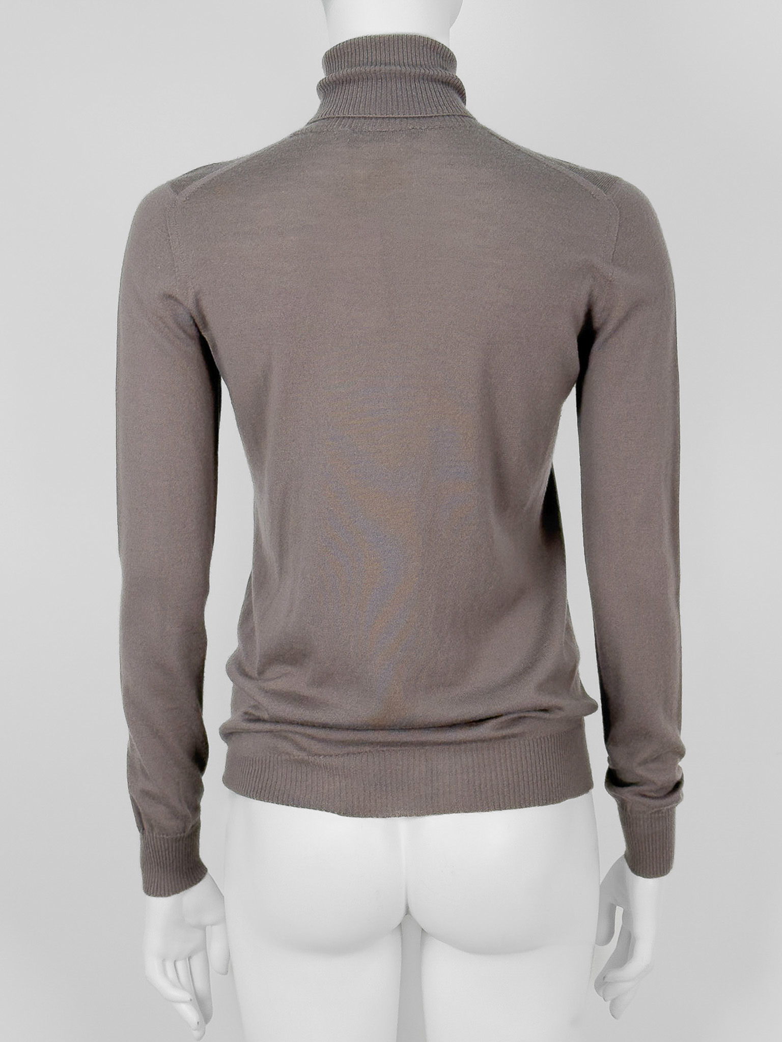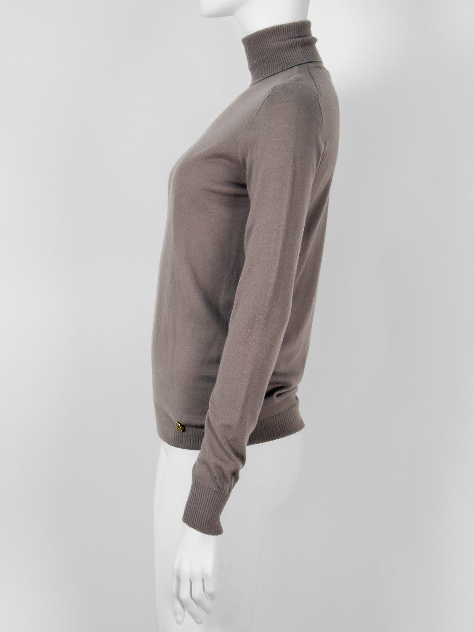 "Cienki, golf z kaszmiru w kolorze taupe. Ma prosty fason, dopasowujący się do linii ciała. Stan: bardzo dobry: Rozmiar: S. Skład: 100% kaszmir. Wymiary: dł. (mierzona od linii karku): 86 cm., szer. (mierzona od pachy do pachy): 47 cm, szer. rękawa (mierzona na wys. pachy): 13 cm., szer. (mierzona w pasie): 40 cm., dł. rękawa (mierzona od linii pachy): 50 cm."