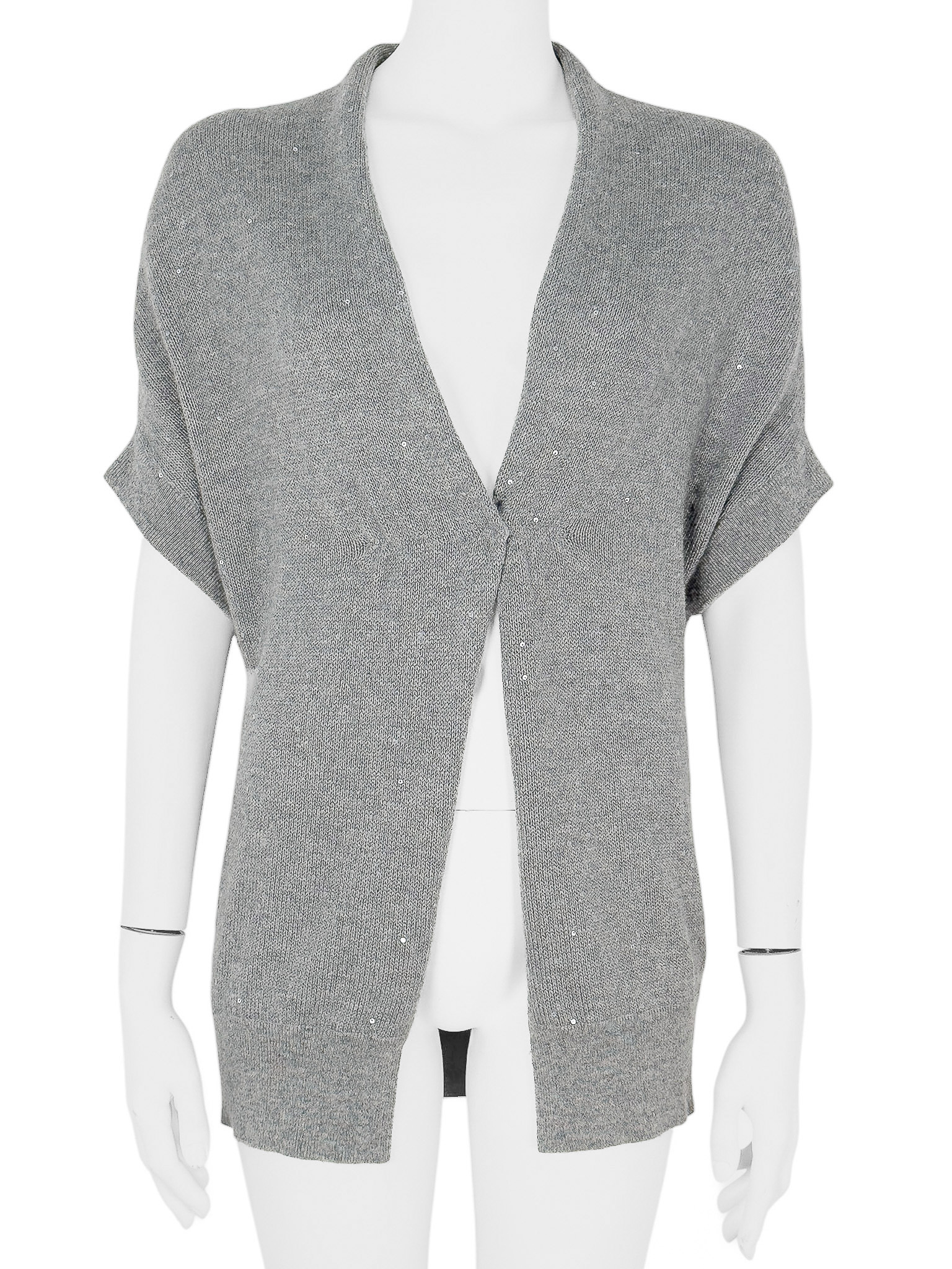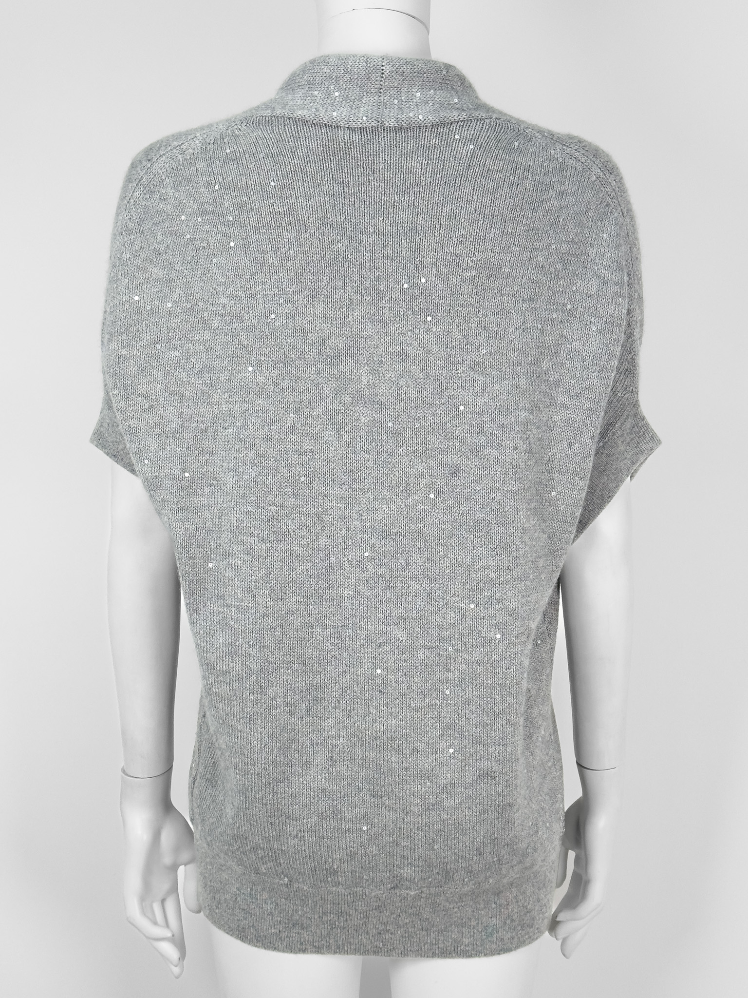 "Szary kaszmirowy sweterek ozdobiony cekinami, krótki rękaw, zapinany na zatrzask. Głęboki dekolt w szpic. Wykończony prążkowanym ściągaczem w dolnej części oraz przy mankietach. Rozmiar z metki S. Wycięta metka z składem. Wymiary: szerokość mierzona od pachy do pachy 55cm, długość całkowita 76cm."