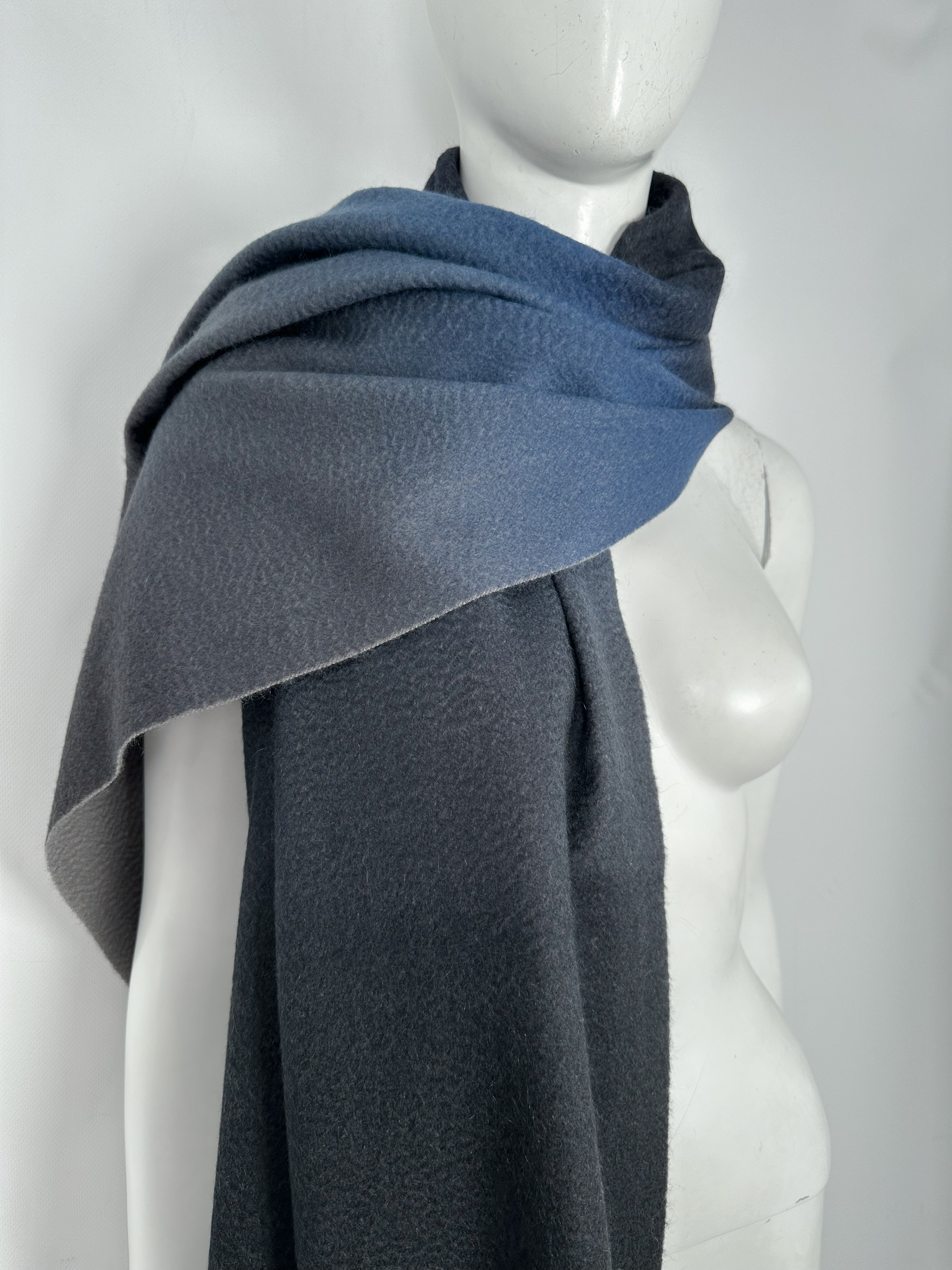 "Kaszmirowy cieniowany szal w odcieniach granatu i szarości, wykończony frędzlami, długi, prostokątny kształt, okrągły medalik z logo marki przy jednym rogu. Skład: 100% kaszmir. Wymiary: 70,5cm x 196cm."