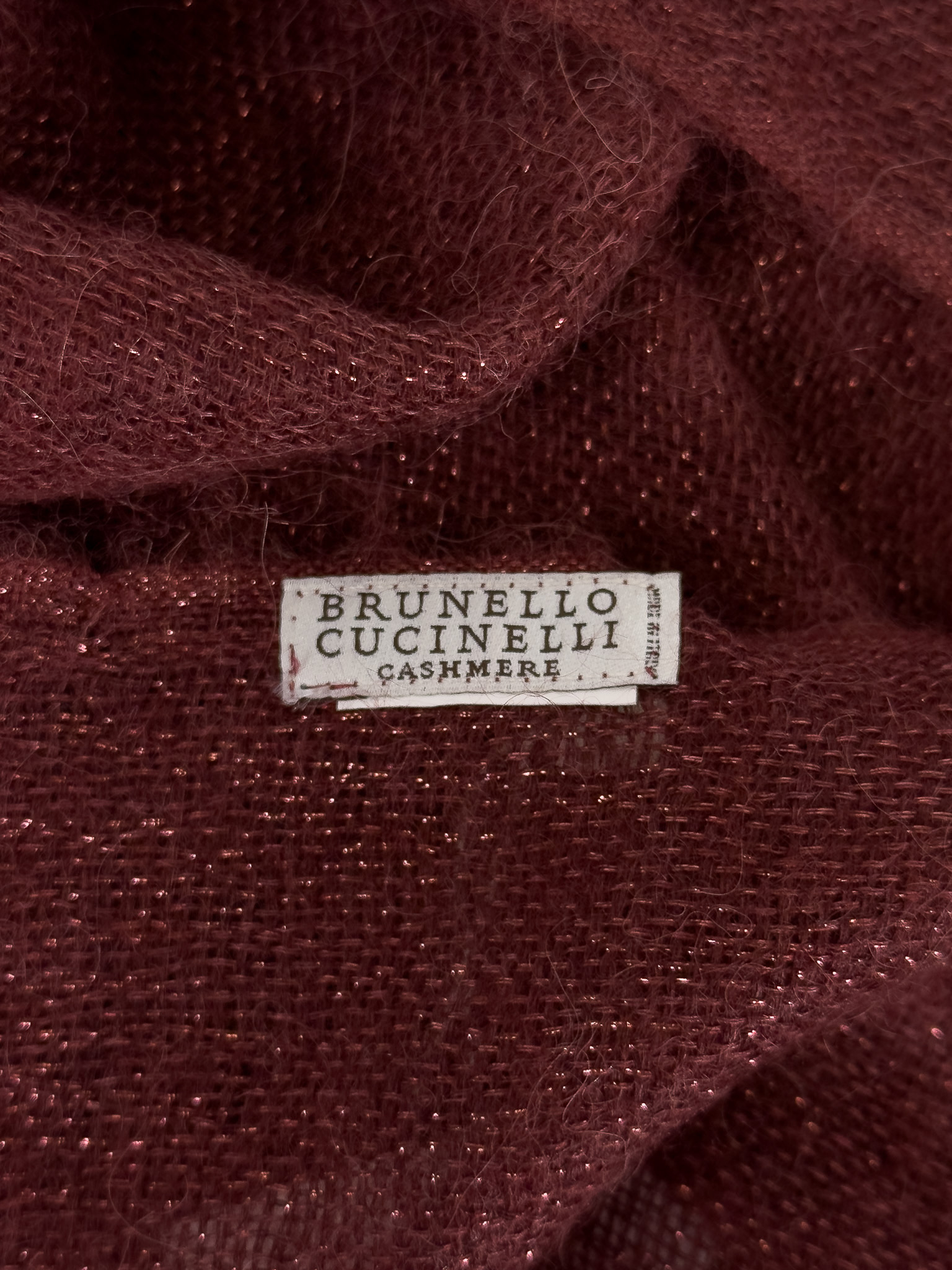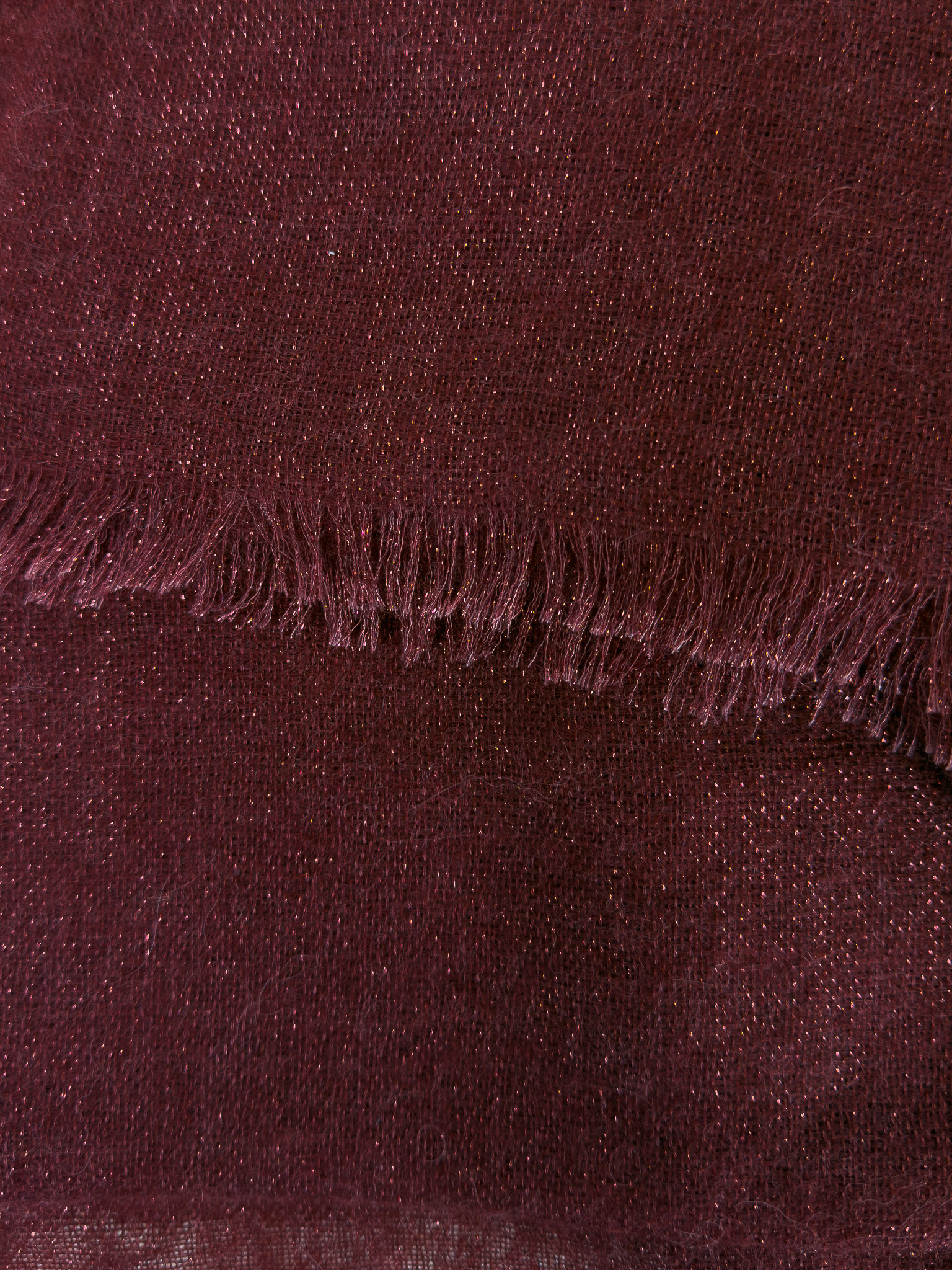 "Bordowy szal z błyszczącą nitką, surowo wykończony. Kaszmir. Ucięta metka z składem procentowym. Wymiary: 90cm x 206cm."