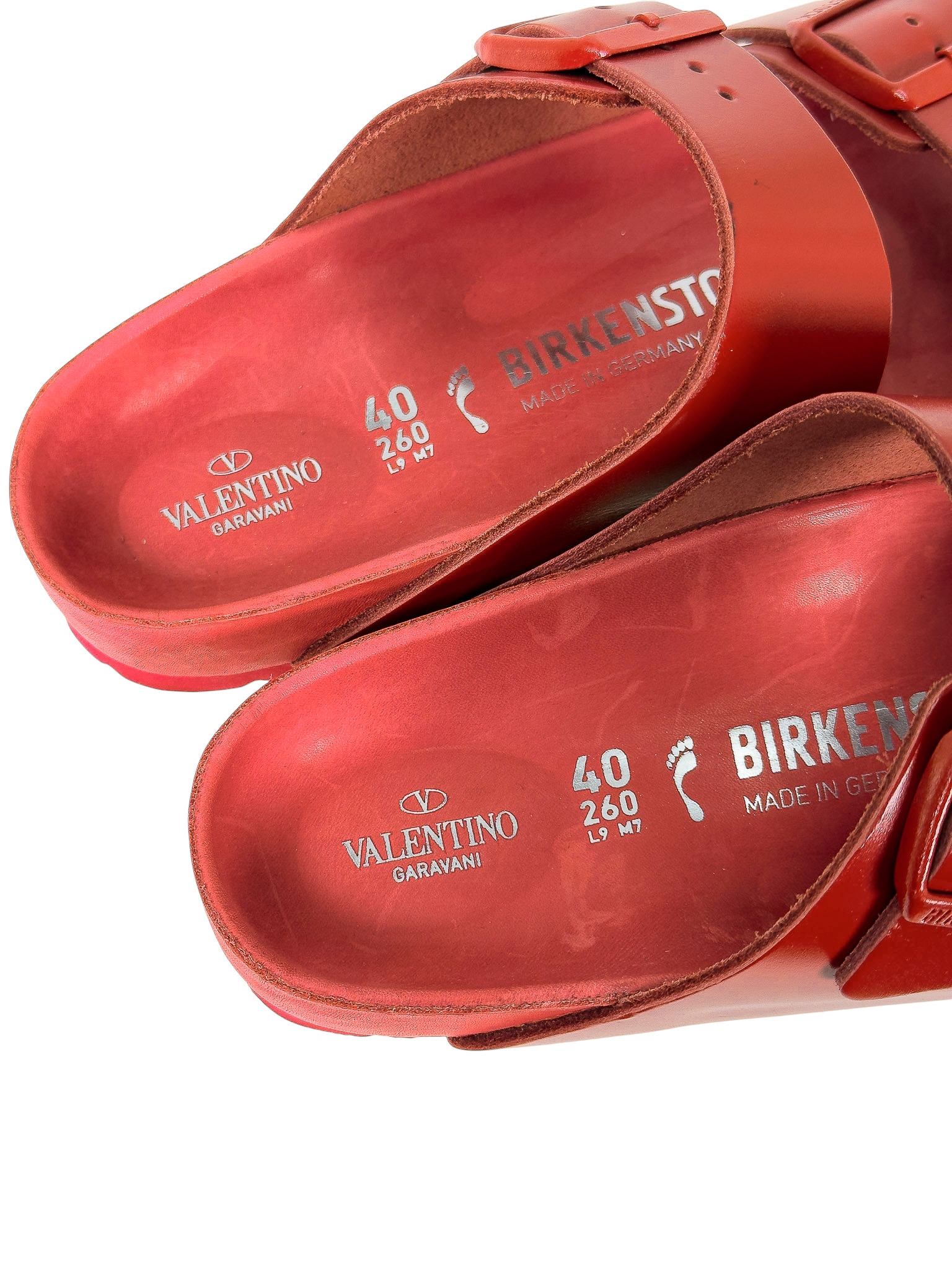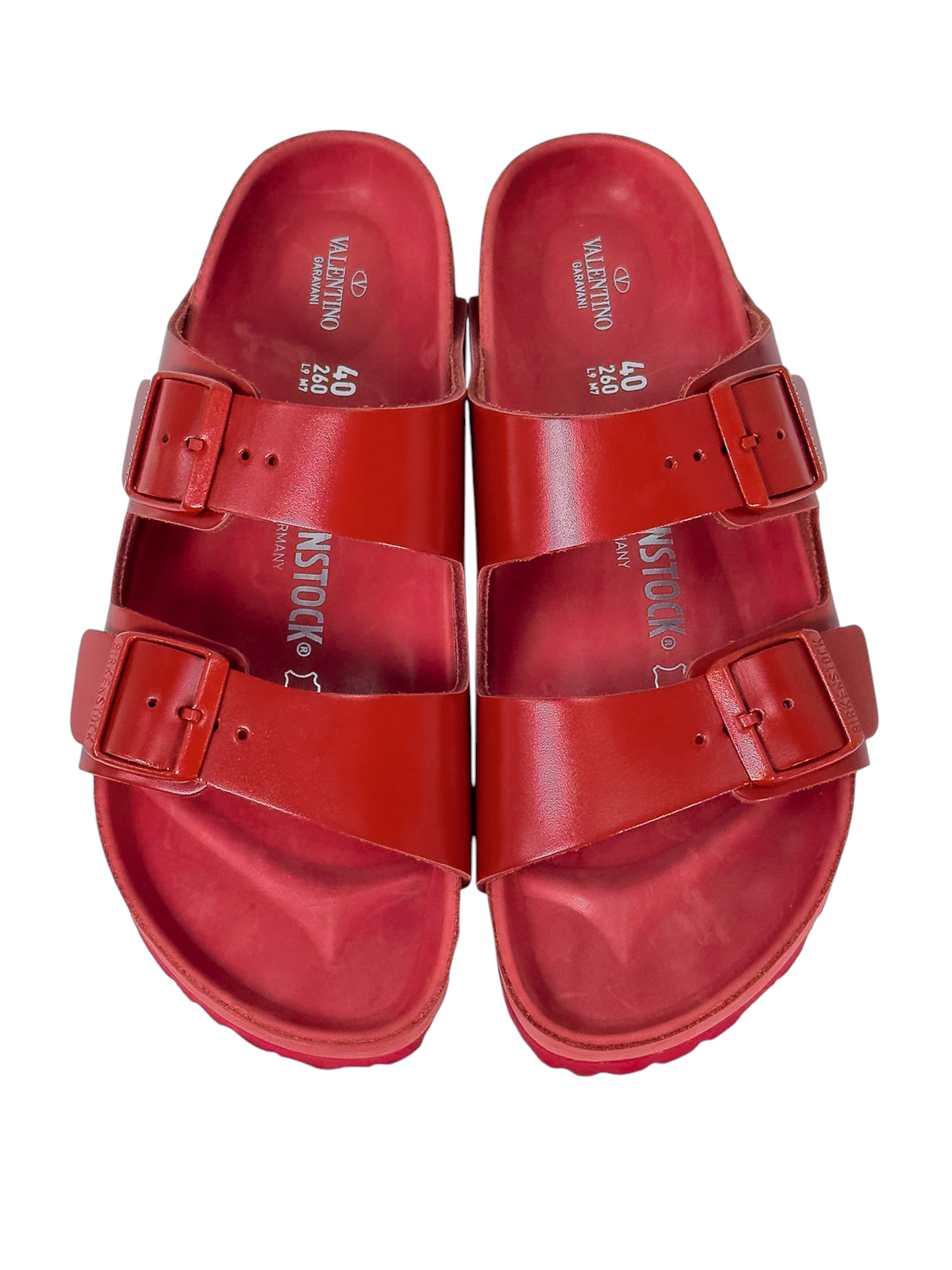 "Czerwone klapki, dwa regulowane skórzane paski na przodzie, zaokrąglone noski, wyprofilowana wkładka, gumowa podeszwa, logo marki od wewnętrznej strony oraz na klamrach. Stan bardzo dobry, posiadają delikatne rysy na wkładce. Rozmiar 40."