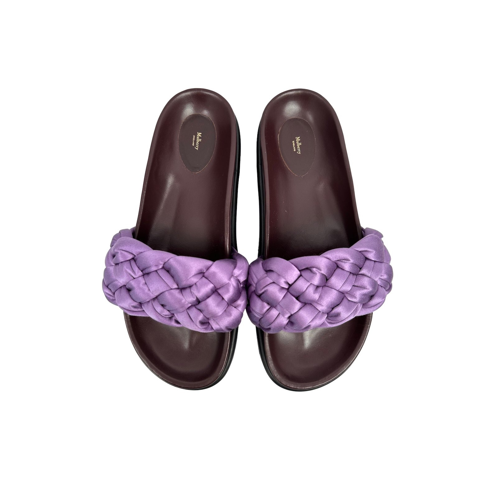 "klapki na brązowo czarnej podeszwie, przód z fioletowego plecionego materiału. Stan bardzo dobry, pudełko w zestawie. Rozmiar 38. dł. wkładki 26 cm."