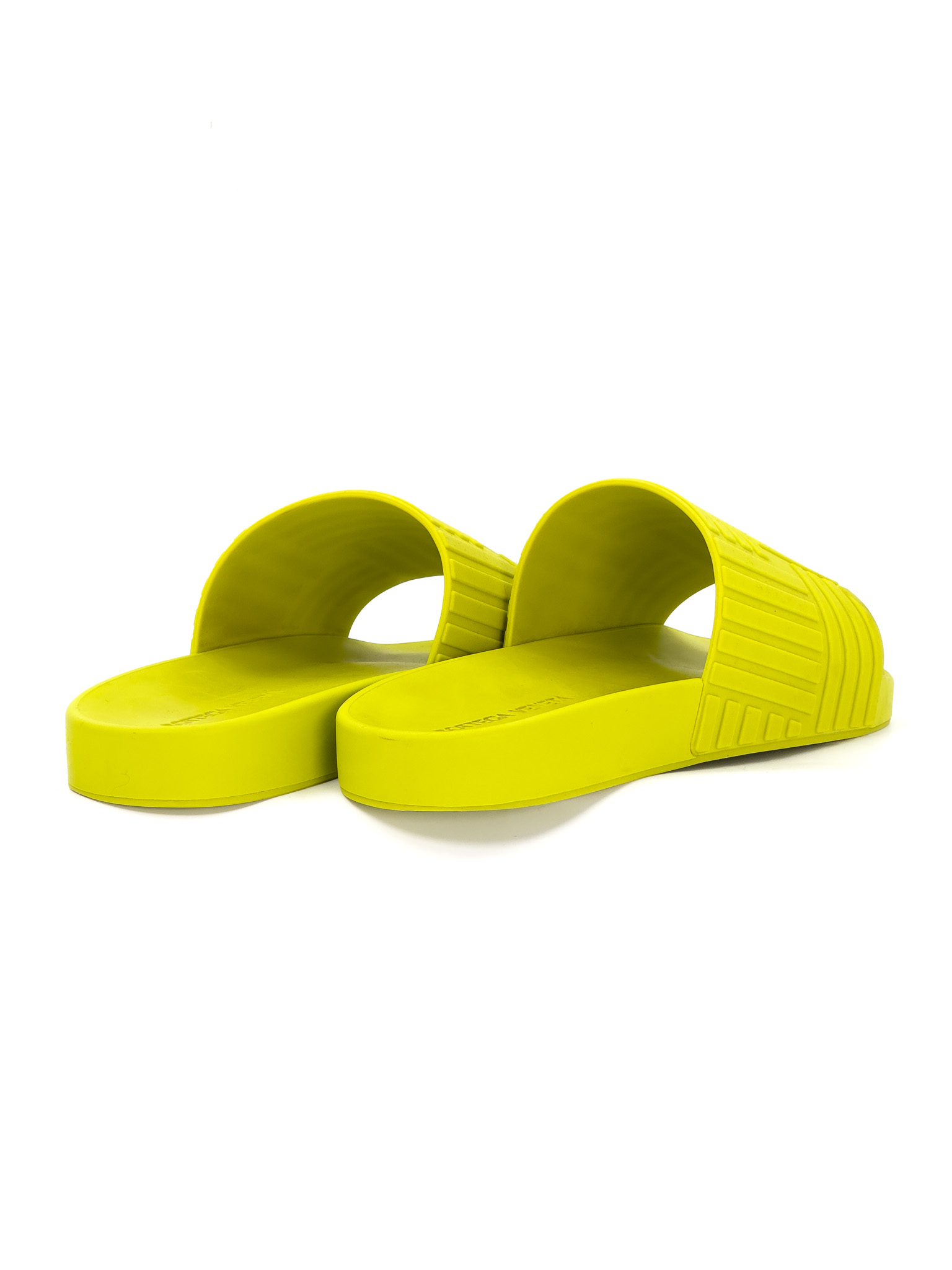 "Limonkowe gumowe klapki ozdobione charakterystycznym dla marki wzorem w przedniej części, zaokrąglone noski. Stan bardzo dobry. Rozmiar 44."
