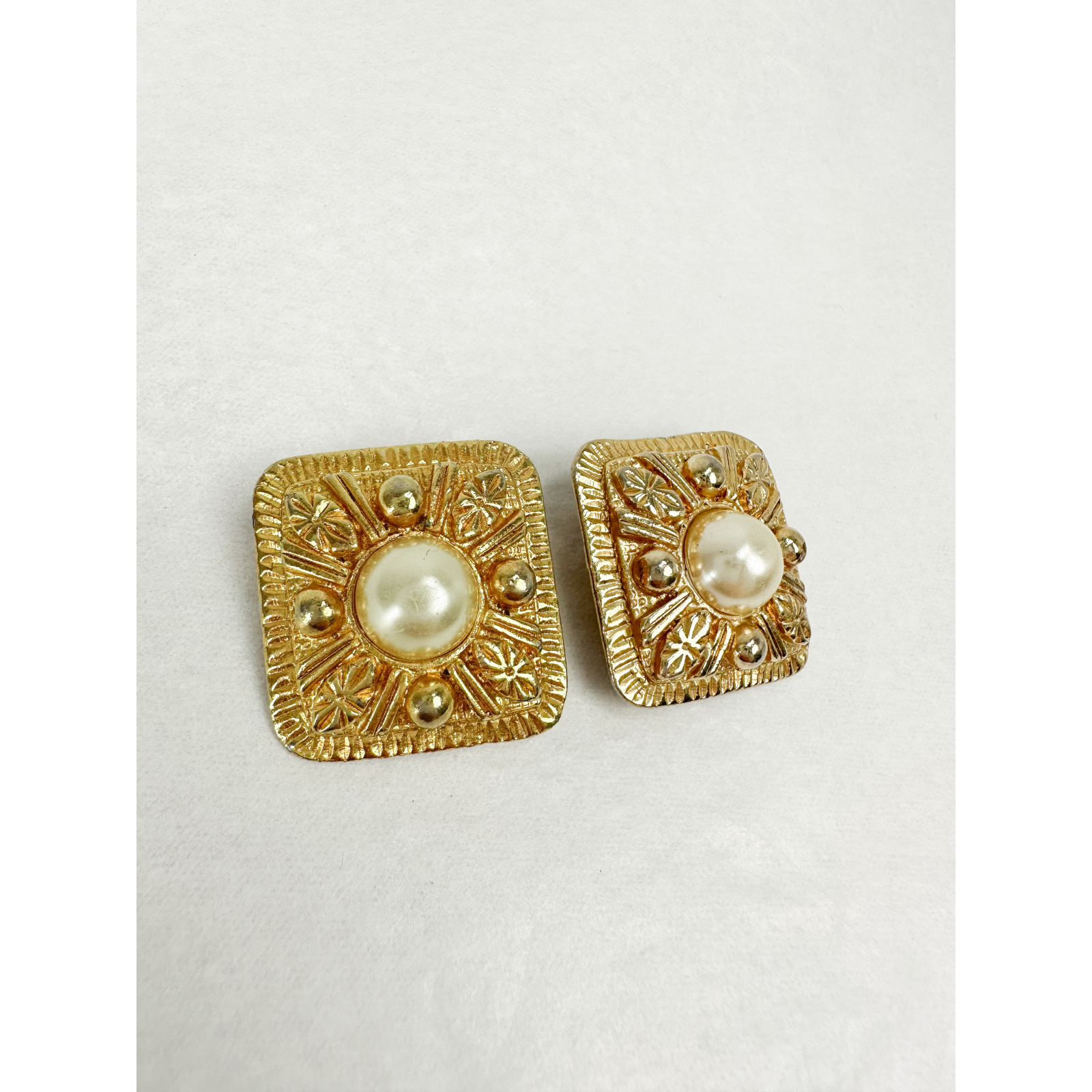 "Większe złote klipsy, forma kwadratu, środek wysadzany perłą, wysokość 2,5cm."