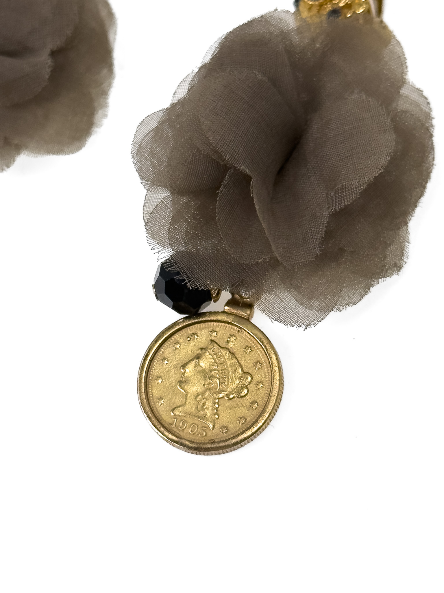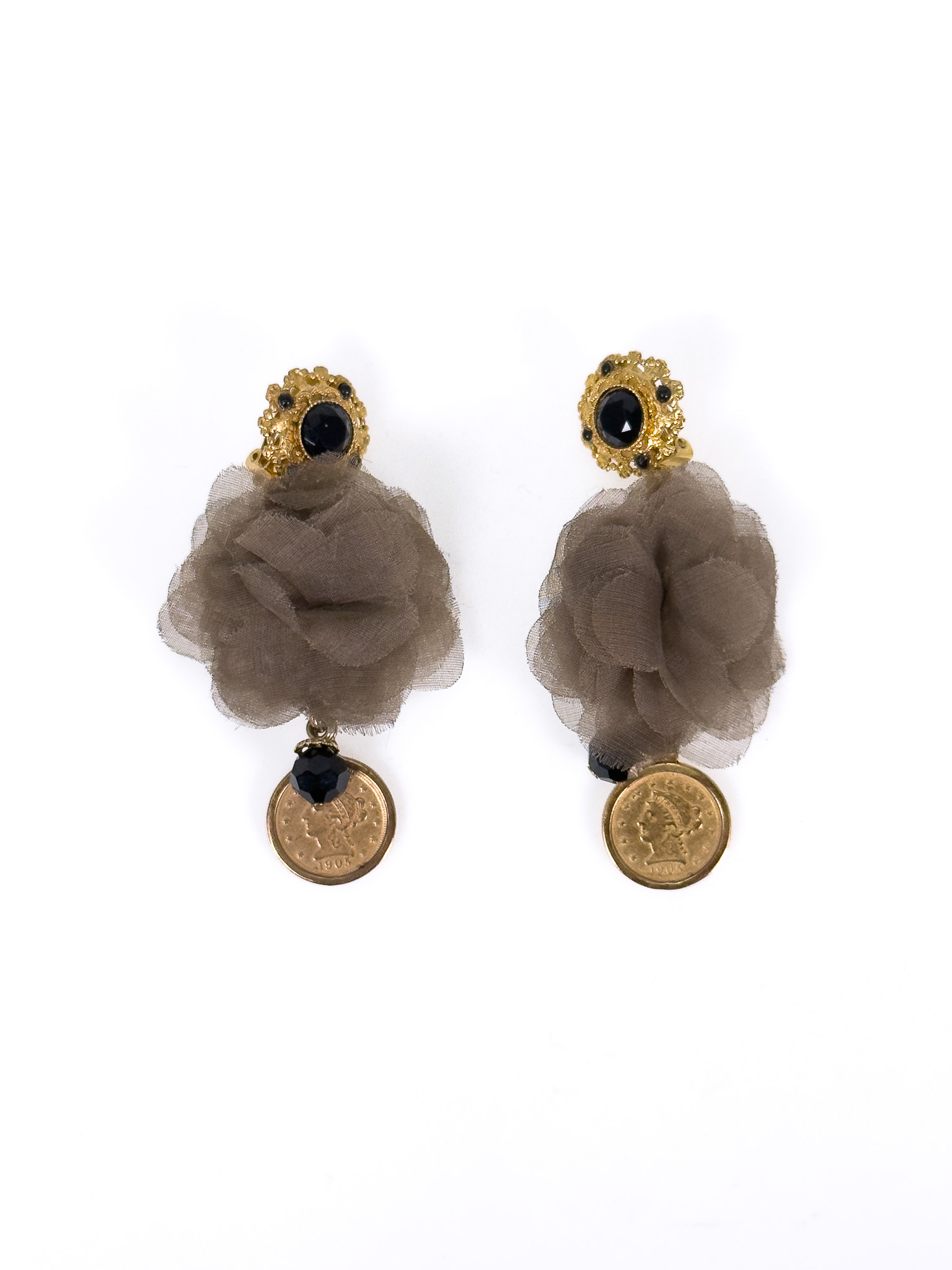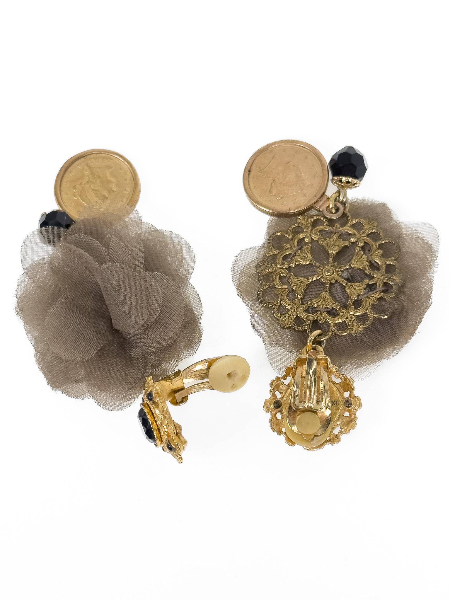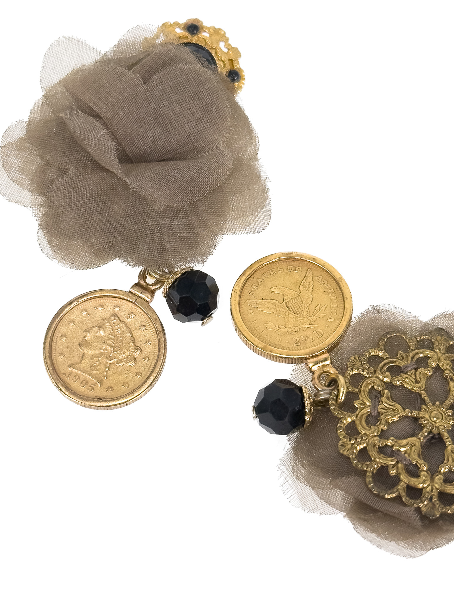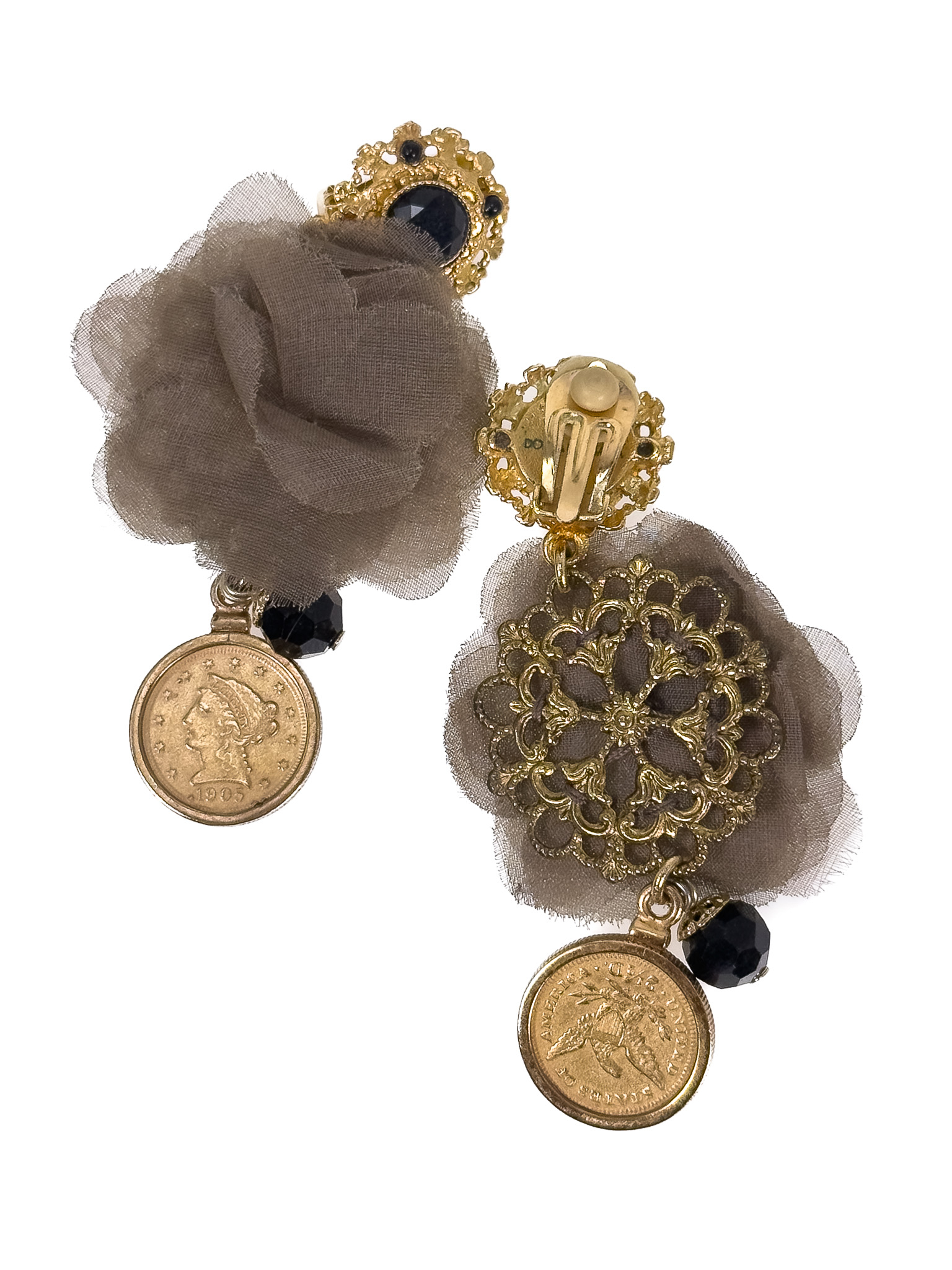 "Złote klipsy, długie, wiszące rozety z ozdobnym czarnym kamieniem na środku oraz czterema małymi po bokach. U dołu większa rozeta zdobiona szyfonem ułożonym na kształt róży. Klipsy zakończone są monetą wykonaną na wzór amerykańskich monet. Z tyłu u góry widnieje wybite logo marki."